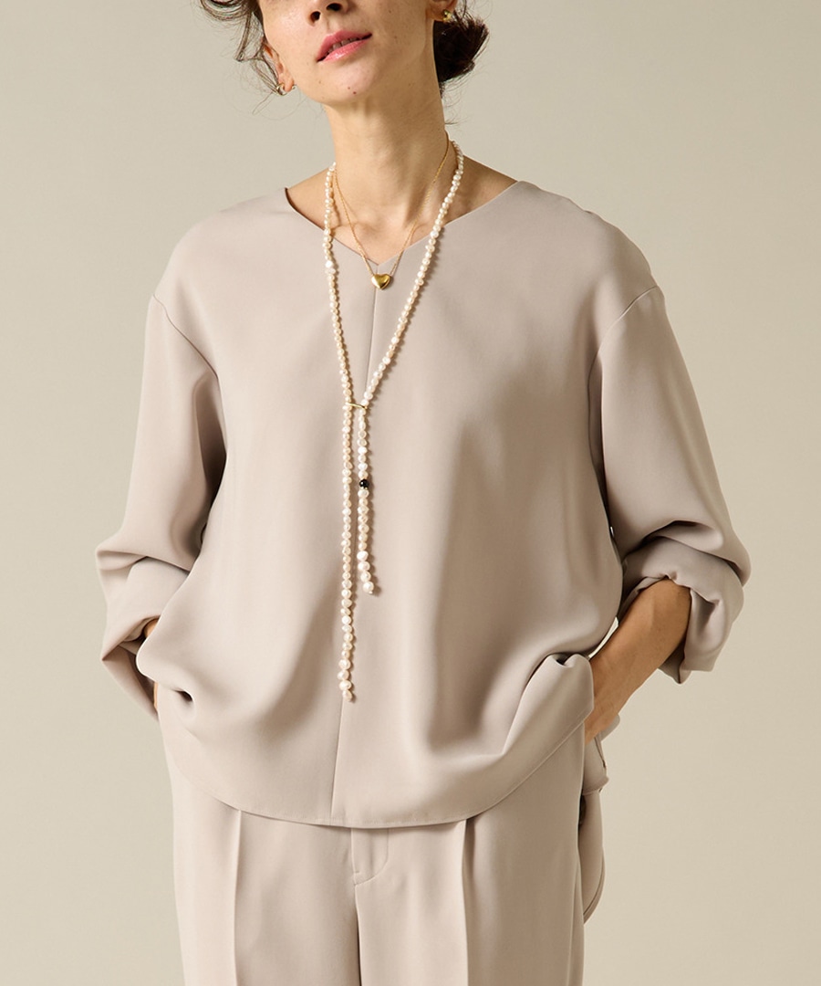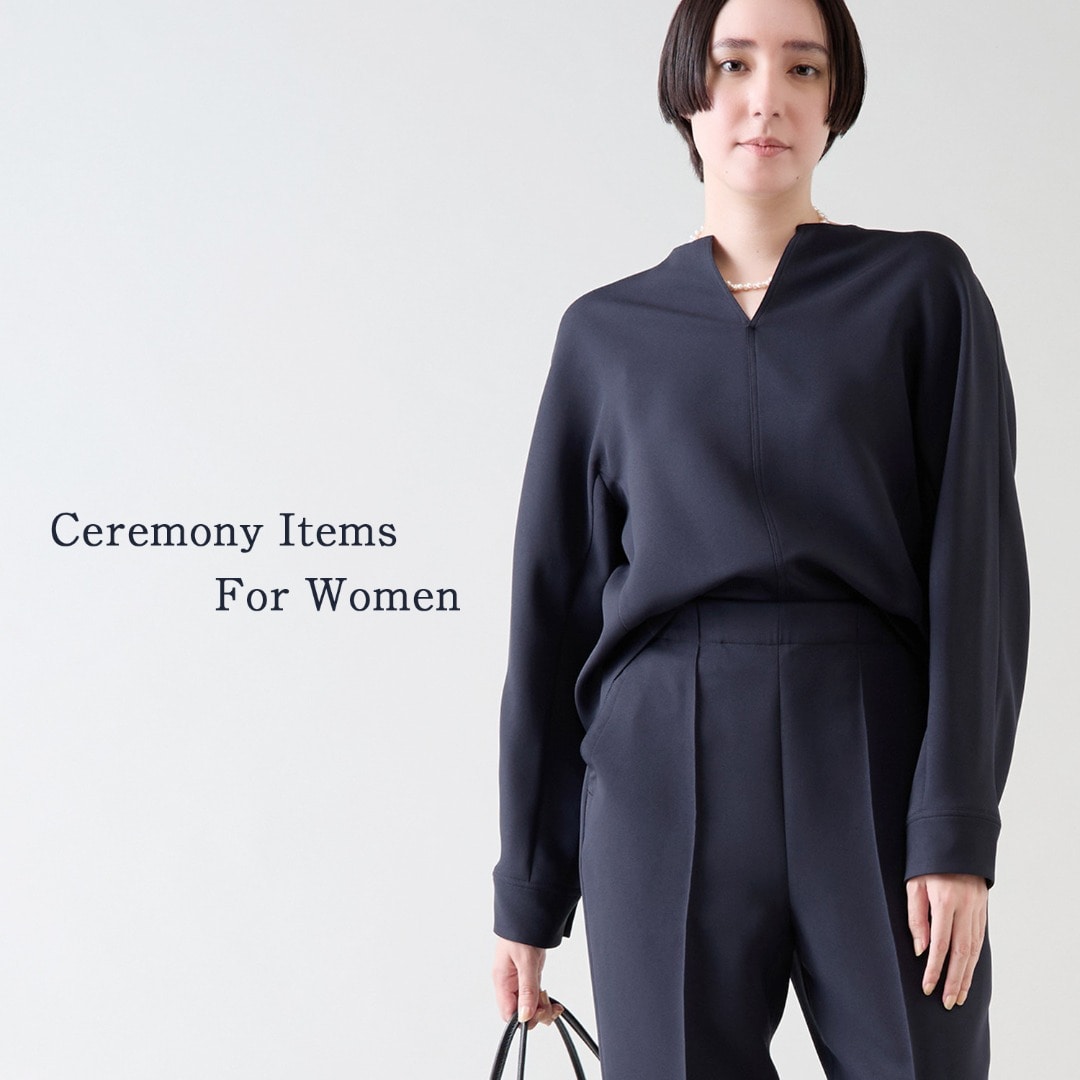 きちん見えで体型カバーもできて、1枚で映えるスタイル。2段フリルのティアードが華やかなブラウスとシンプルで着回しの効くスリムパンツのセットアップ。胸元にさりげなく施したパールボタンが華やぎを添えてくれます。特別な日にも日常にも、凛とした美しさを纏えるスタイルです。
