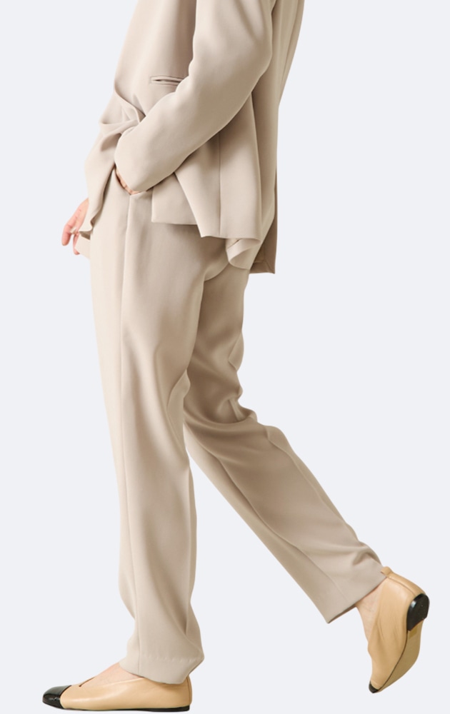普段カジュアル派の方におすすめなセットアップスタイル。ベージュトーンが柔らかく上品な印象を与えます。リラックス感もあり、快適さとスタイリッシュさを両立。ウエストの切り替えが女性らしいシルエットを引き立て、全体にメリハリをプラス。イージーケアなのに上品な光沢感のある生地が、広いシーンで活躍する万能なセットアップです。