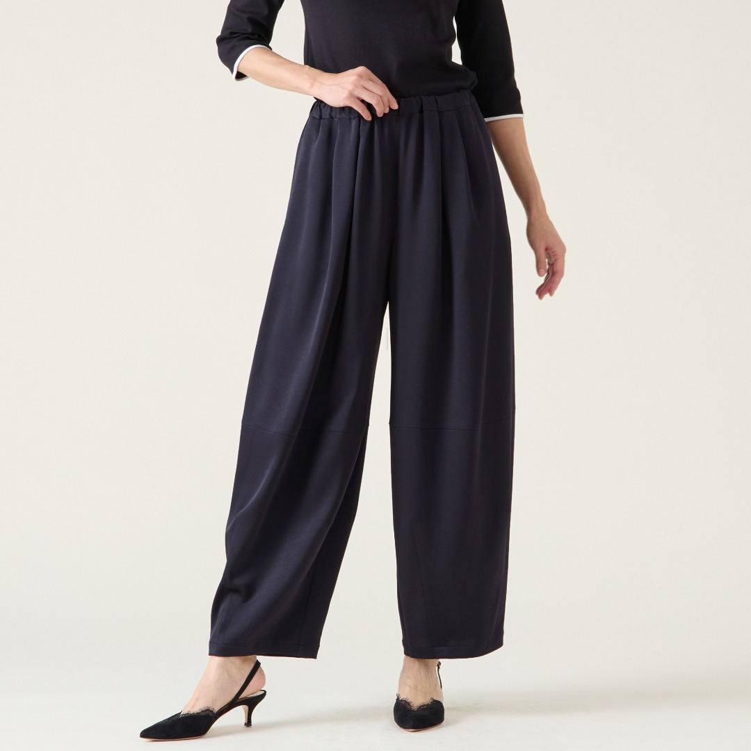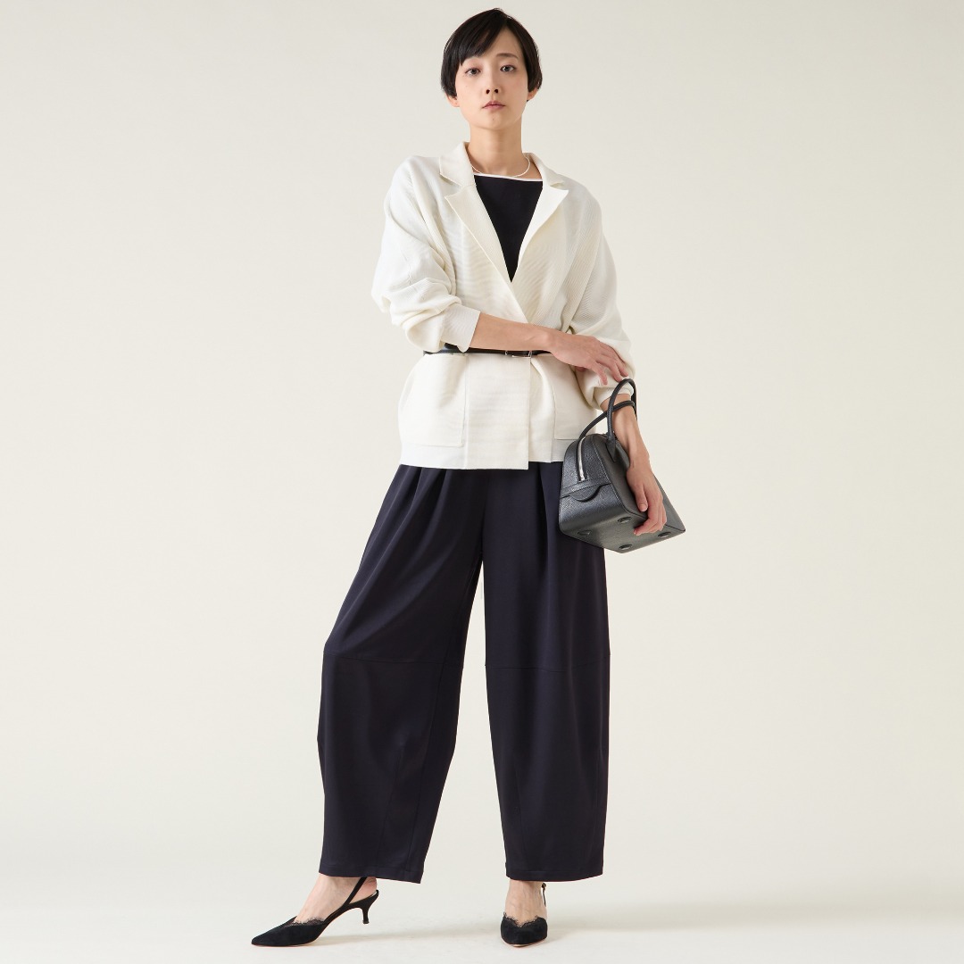 ドライタッチで清涼感のある素材感のニットジャケットは気軽に羽織れる初夏まで活躍するアイテム。気分のバレルパンツを合わせ、ベルトでウエストマークして着るのもおすすめです。