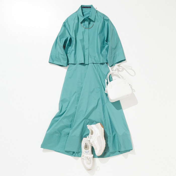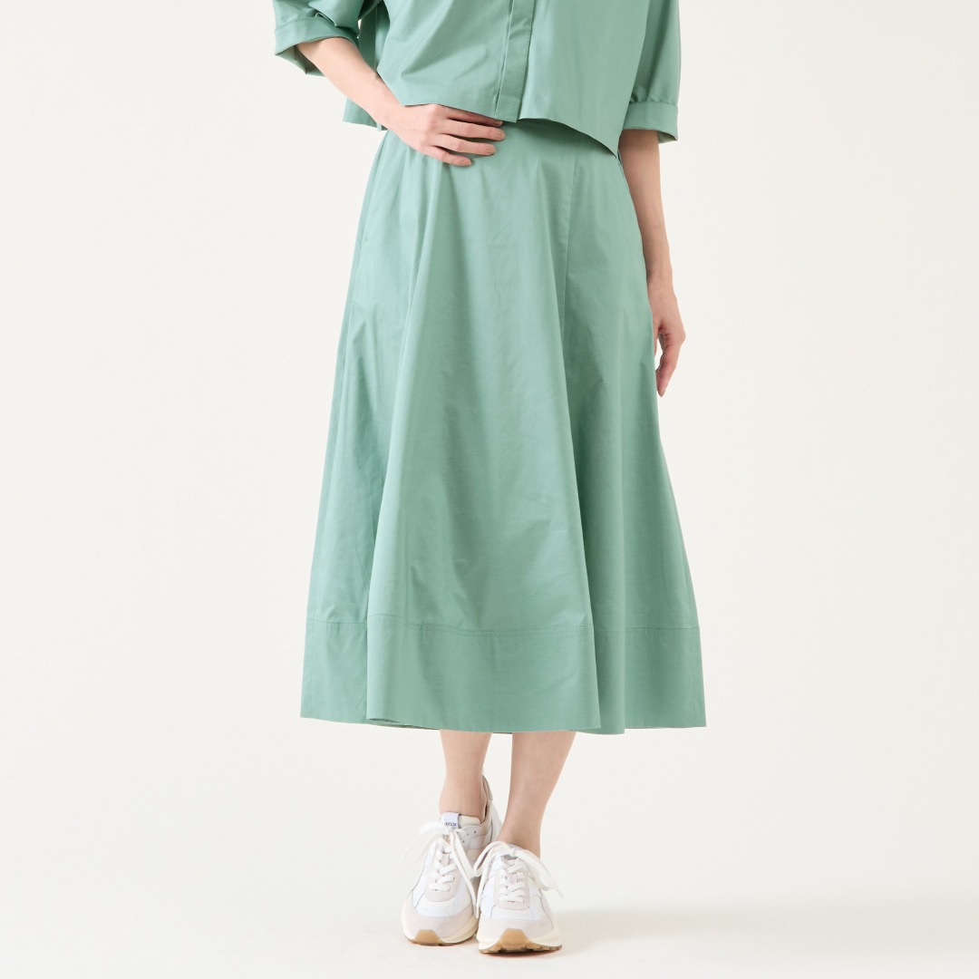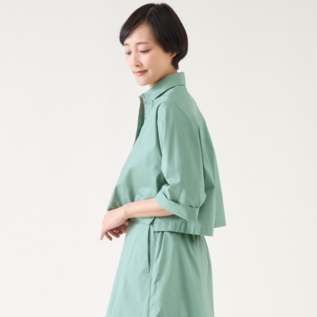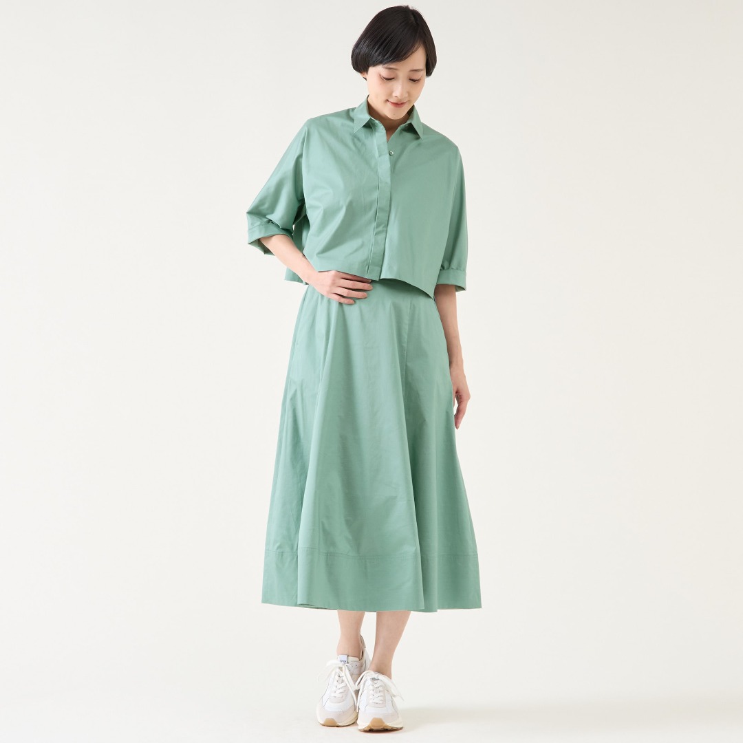 トレンドのクロップド丈シャツとフレアスカートのセットアップ。光沢がありながら、タフタ程お出かけ顔にならない適度に上品な生地で、パネル切り替えがポイントになります。キーカラーのBLUE GREENが夏に映えます。