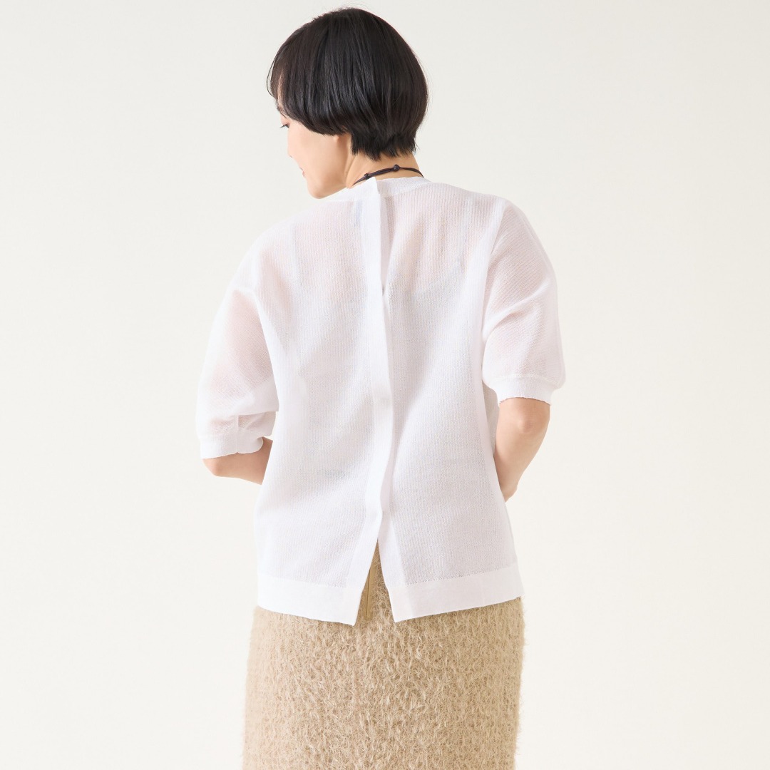 表面感があり細かなフリンジがついているような雰囲気のツッキリジャガード生地。単調になりがちな夏のスタイリングのアクセントになります。Tシャツなどシンプルなトップスとの合わせがおすすめです。