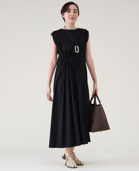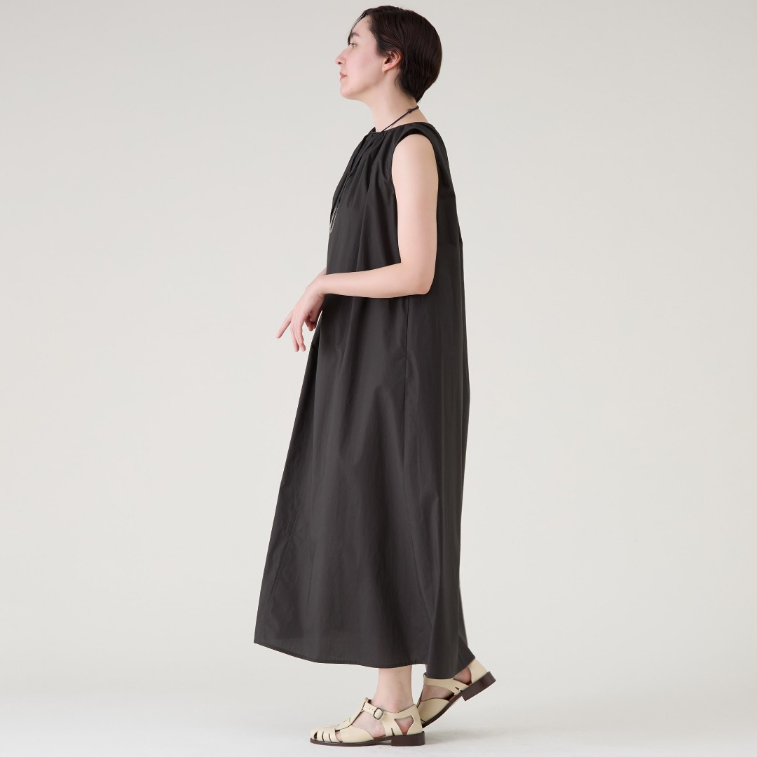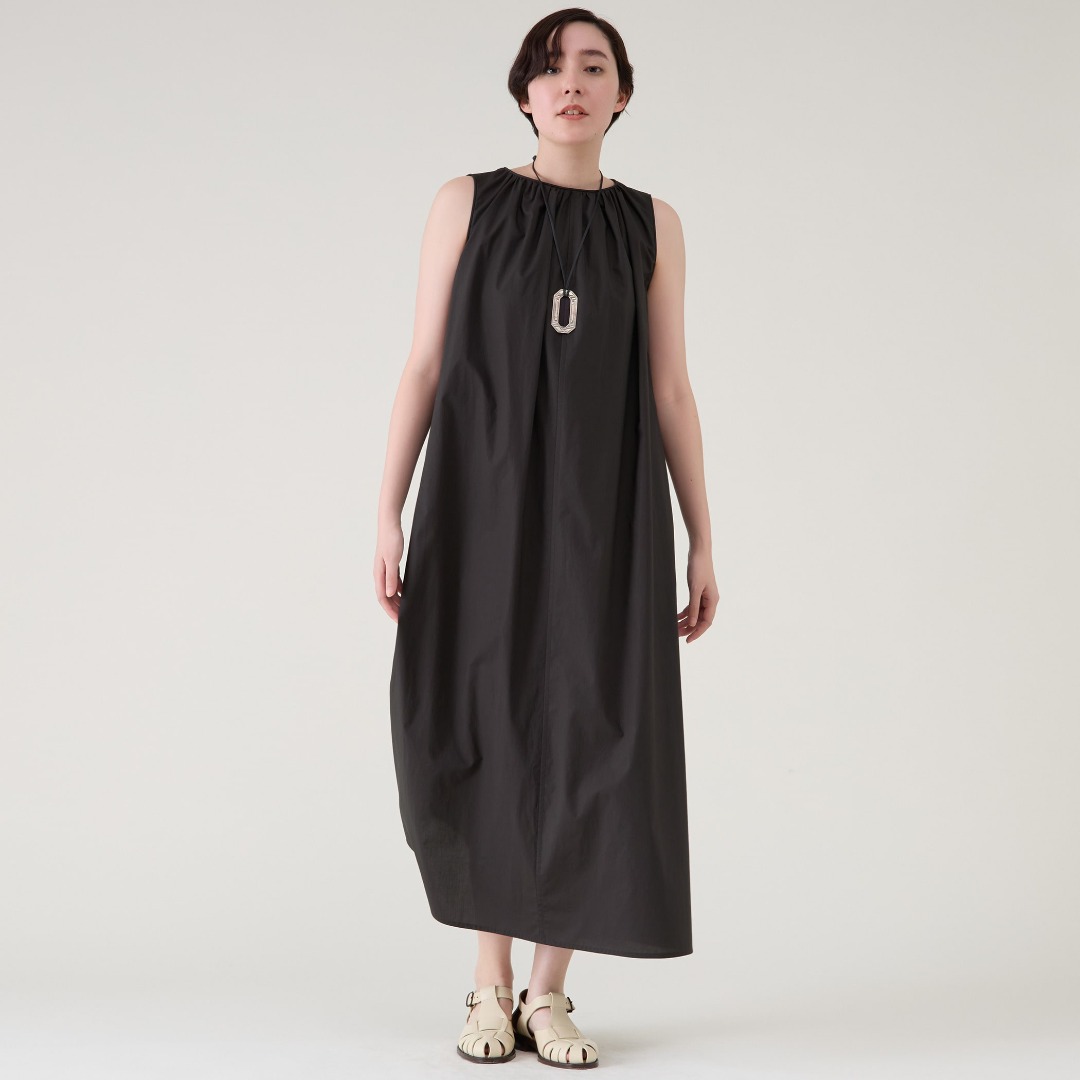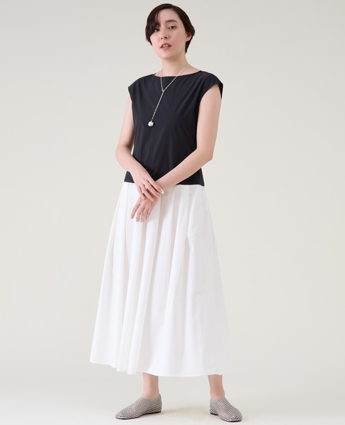 テントラインのシルエットで身体のラインを拾わず、暑い夏にも快適に着られる一枚。襟ぐりとアームホールに施したコードパイピングがアクセントに。