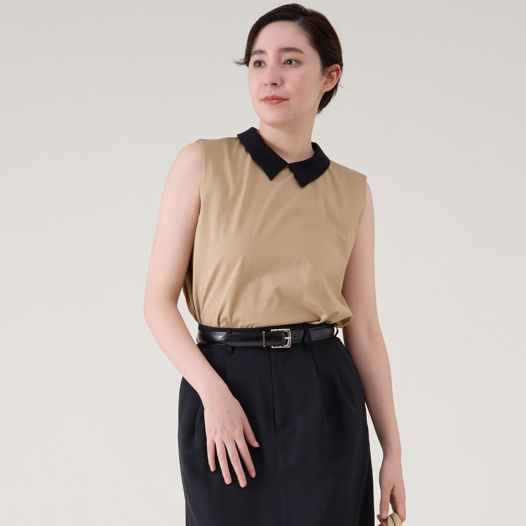 カジュアルになりがちな夏の装いにきちんと感をプラスする襟つきプルオーバー。気軽に着られるジャージー素材で、肌離れも良く涼しく着ていただけます。ベージュはブラックの配色衿です。
