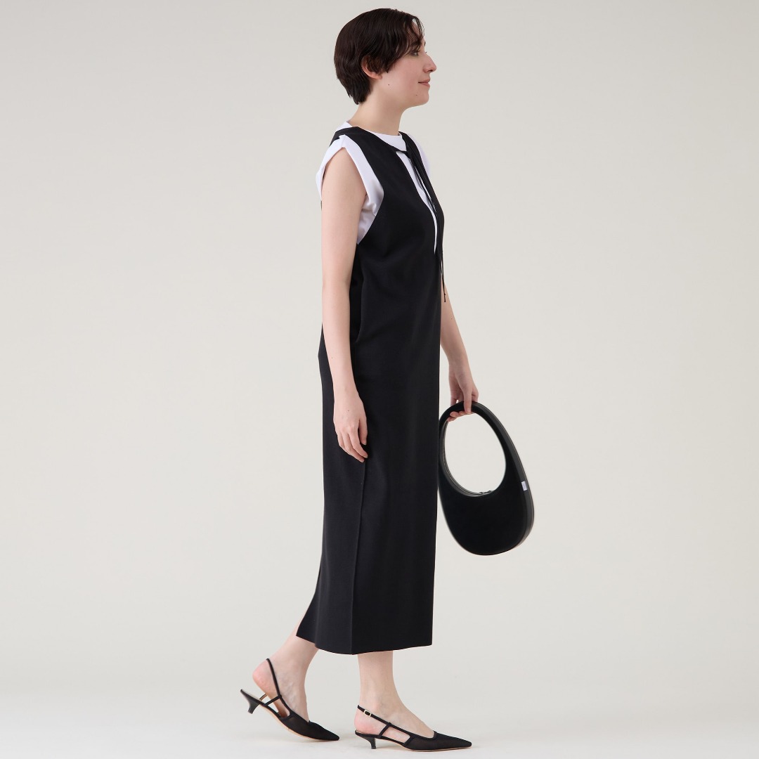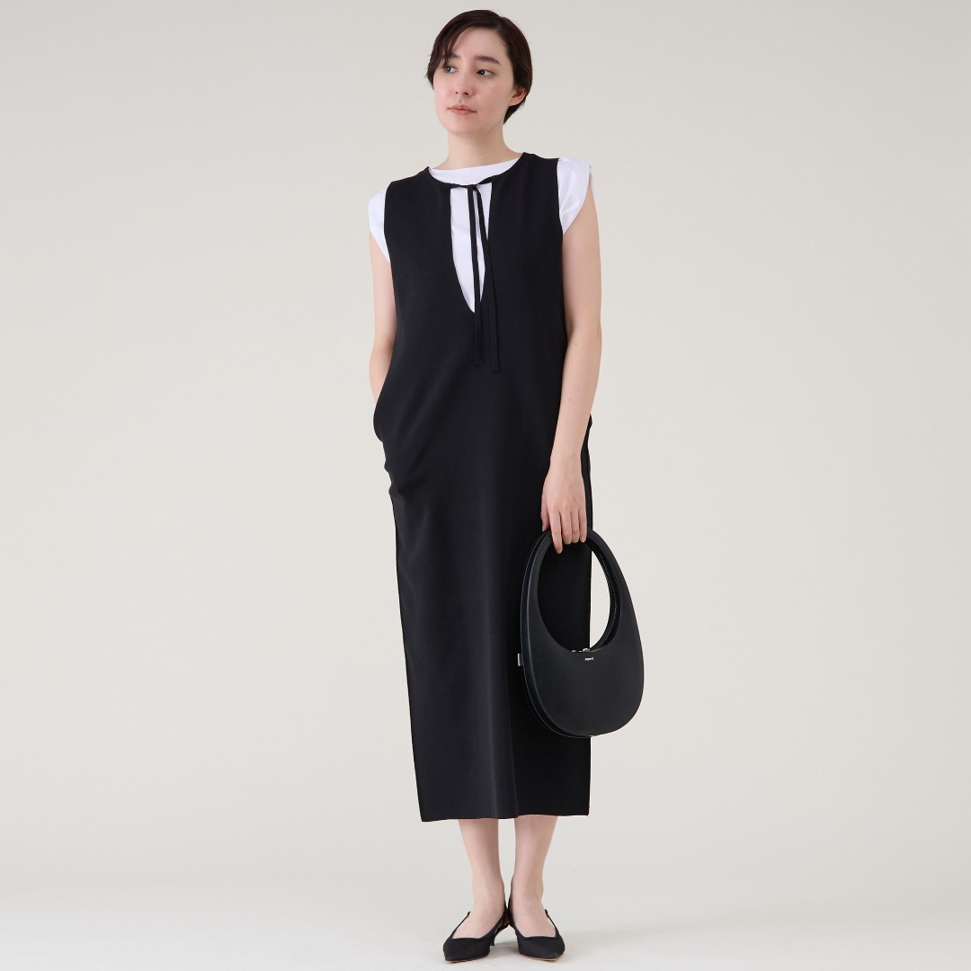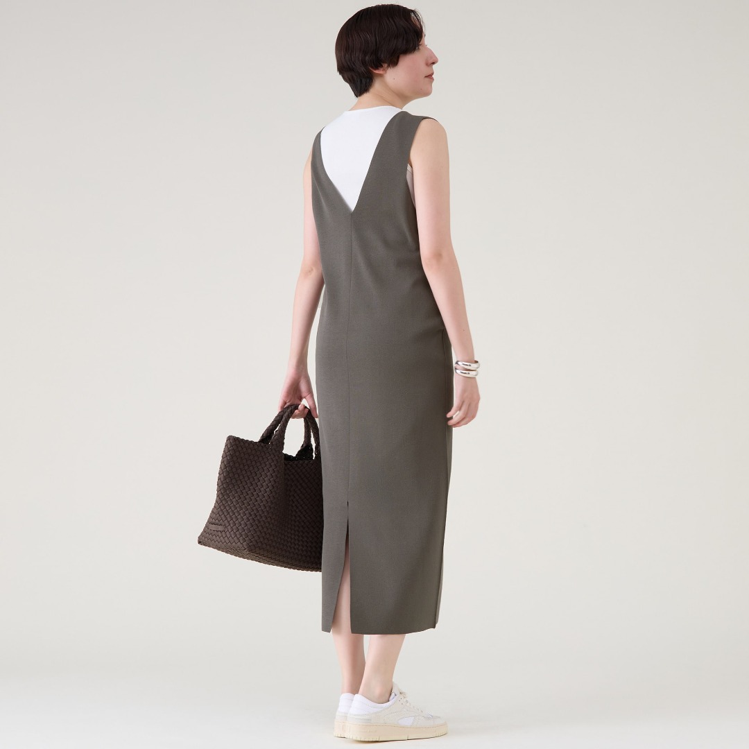 深い切り込みのスリットがデザインポイントで、前後どちらでも着用できるニットジャンスカ。Tシャツなどとレイヤードスタイルを楽しめます。