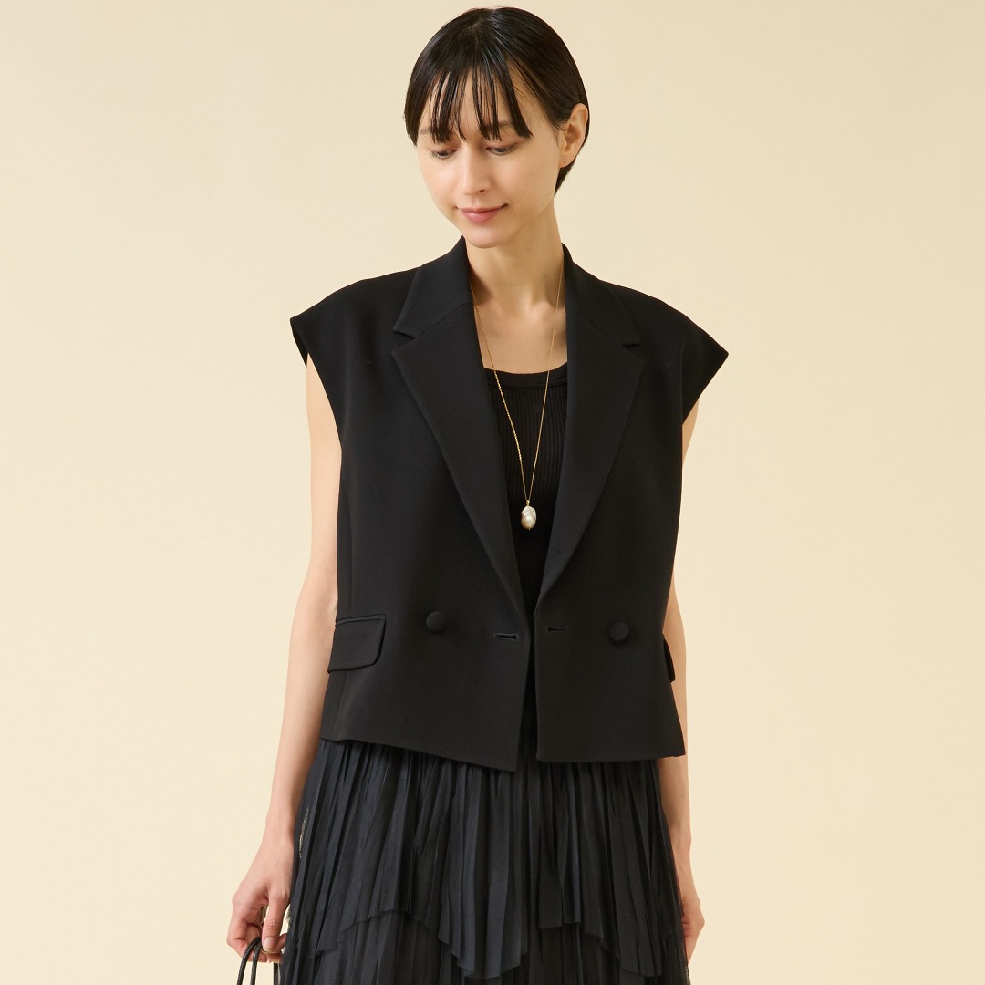 ダブル合わせのデザインがクラシックな印象のジレ。前を留めてブラウス感覚で着たり、Tシャツやブラウスとレイヤードしたりと一枚でさまざまなコーディネートが叶う、着回し力の高いアイテム。同素材のパンツとセットアップもおすすめです。