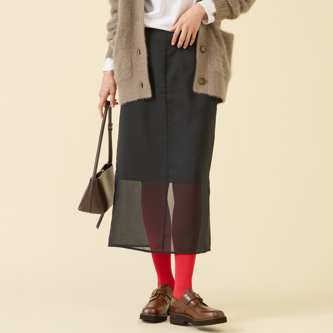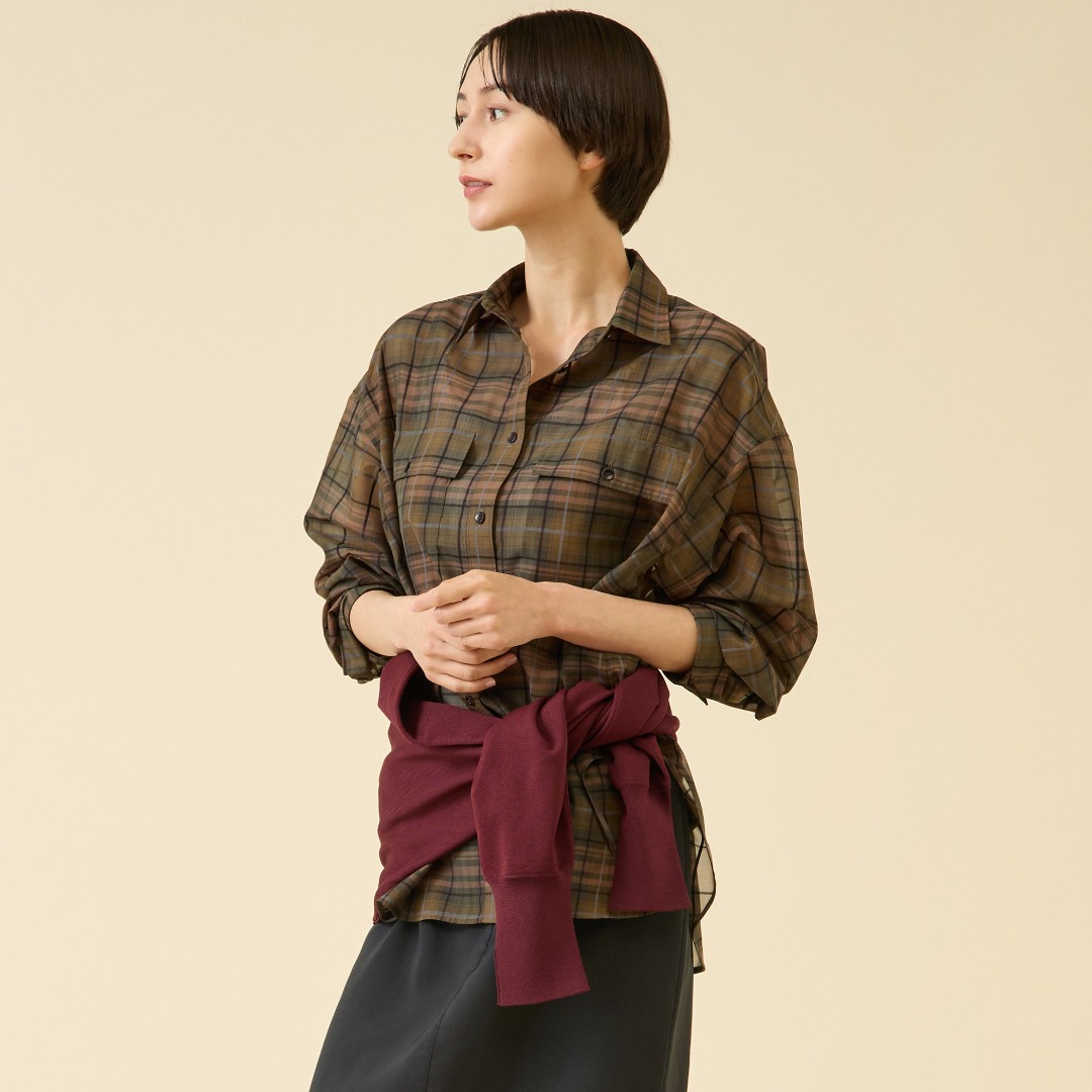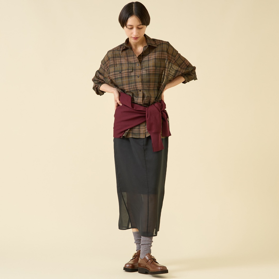 まるでメンズのようなオーバーサイズな作りのシャツは、シアー素材で晩夏〜羽織りとしても活躍します。秋色チェックに腰巻きしたボルドーのニットがアクセントに。同素材のシアースカートとセットアップもおすすめです。
