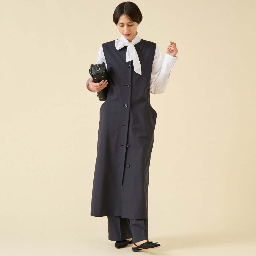 高級感のあるウール混梳毛素材のジレワンピース。INにシャツやハイネックニットなどを合わせてクラシックに着用したり、パンツ合わせでセットアップでの着用もおすすめです。