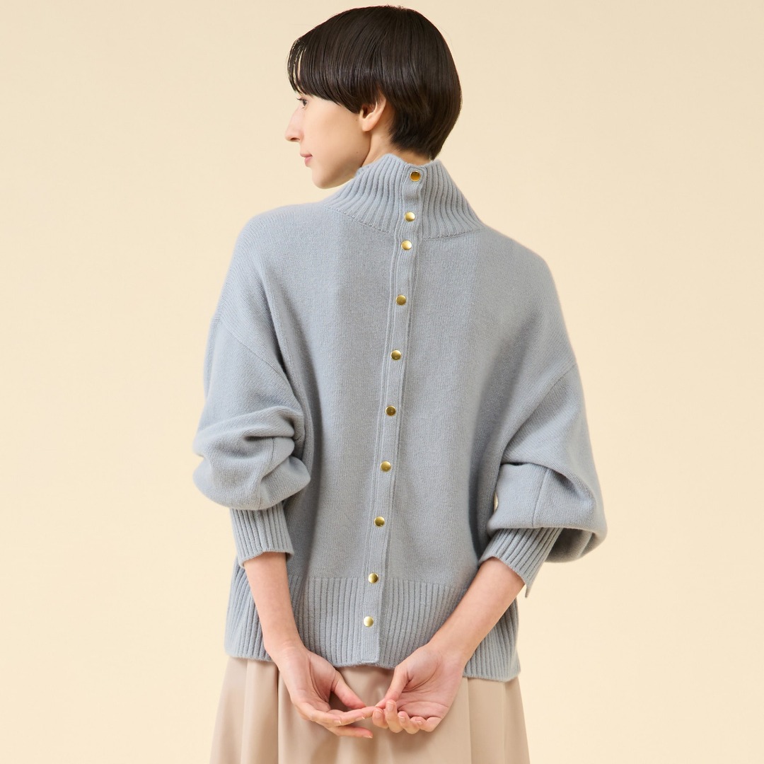 冬の定番ニットですが袖のバランスや袖口のスリットなど今の気分にアップデート。今年はバックスタイルをドットボタンに。ボタンを前に、首元を開けて切るとまた印象が変わります。