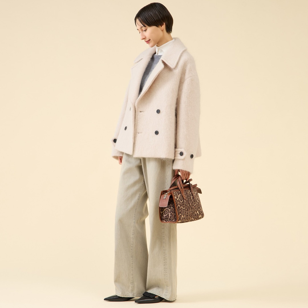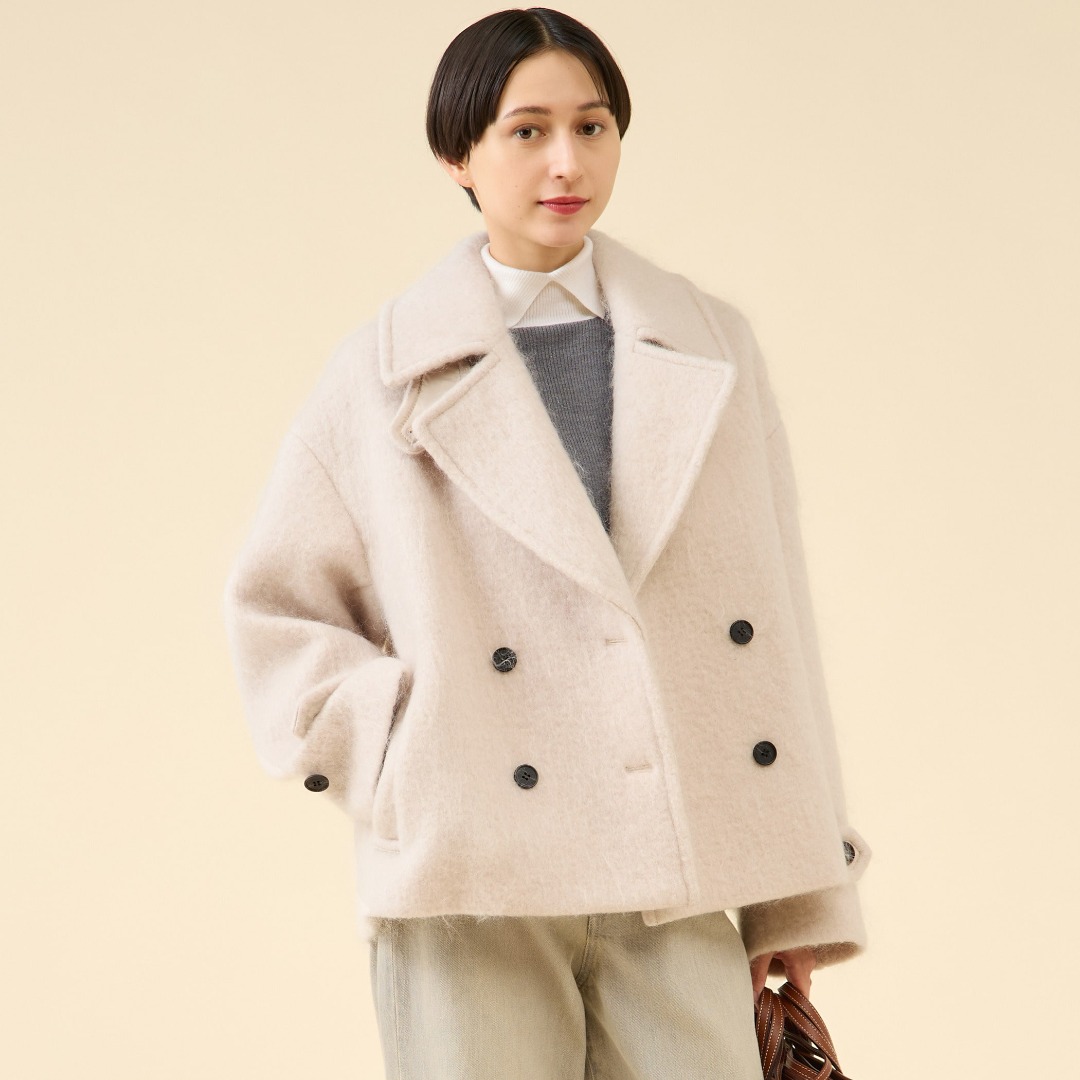 大きめラペルと程よいビッグシルエットで、上品さと今っぽさを兼ね備えたクラシックなピーコート。毛足の長いシャギー素材で、女性らしい雰囲気です。