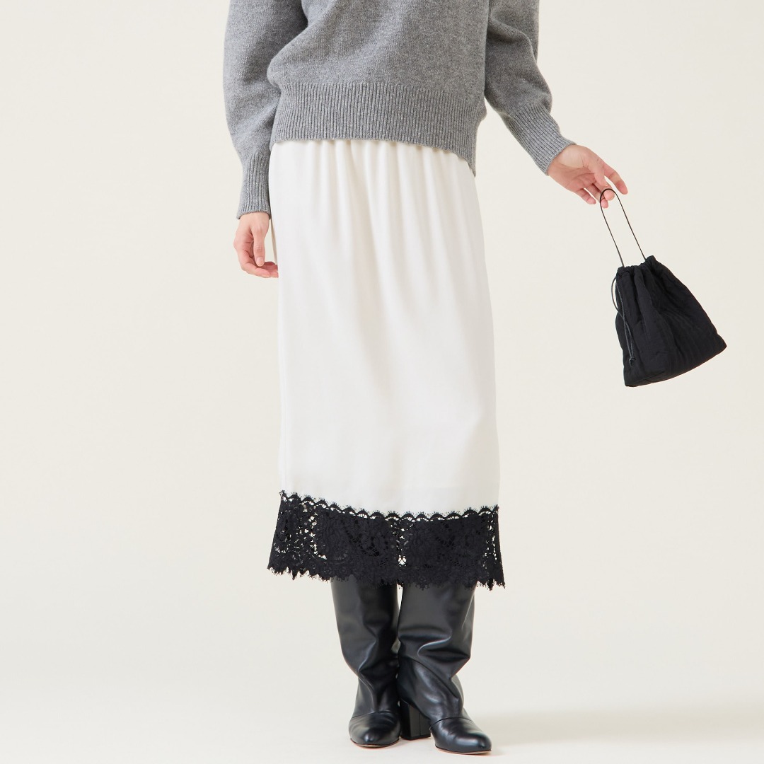 フランス製リバーレースを贅沢に使用したギャザースカート。シンプルなデザインが繊細なレースの美しさを引き立てます。キュプラのしなやかな風合いがニットなどとのスタイリングにも軽やかな印象に。