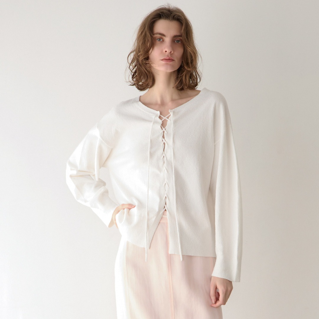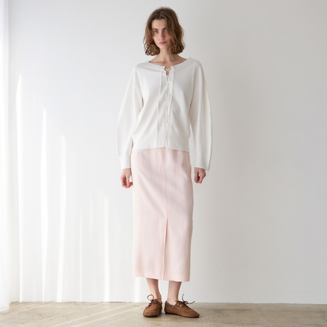 今期トレンドのレースアップディテールを使ったニットプルオーバーはフロンタブルデザイン。ピュアホワイト×ベビーピンクが春らしい柔らかな印象。