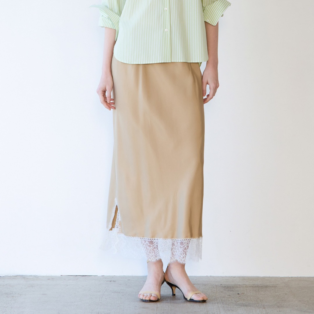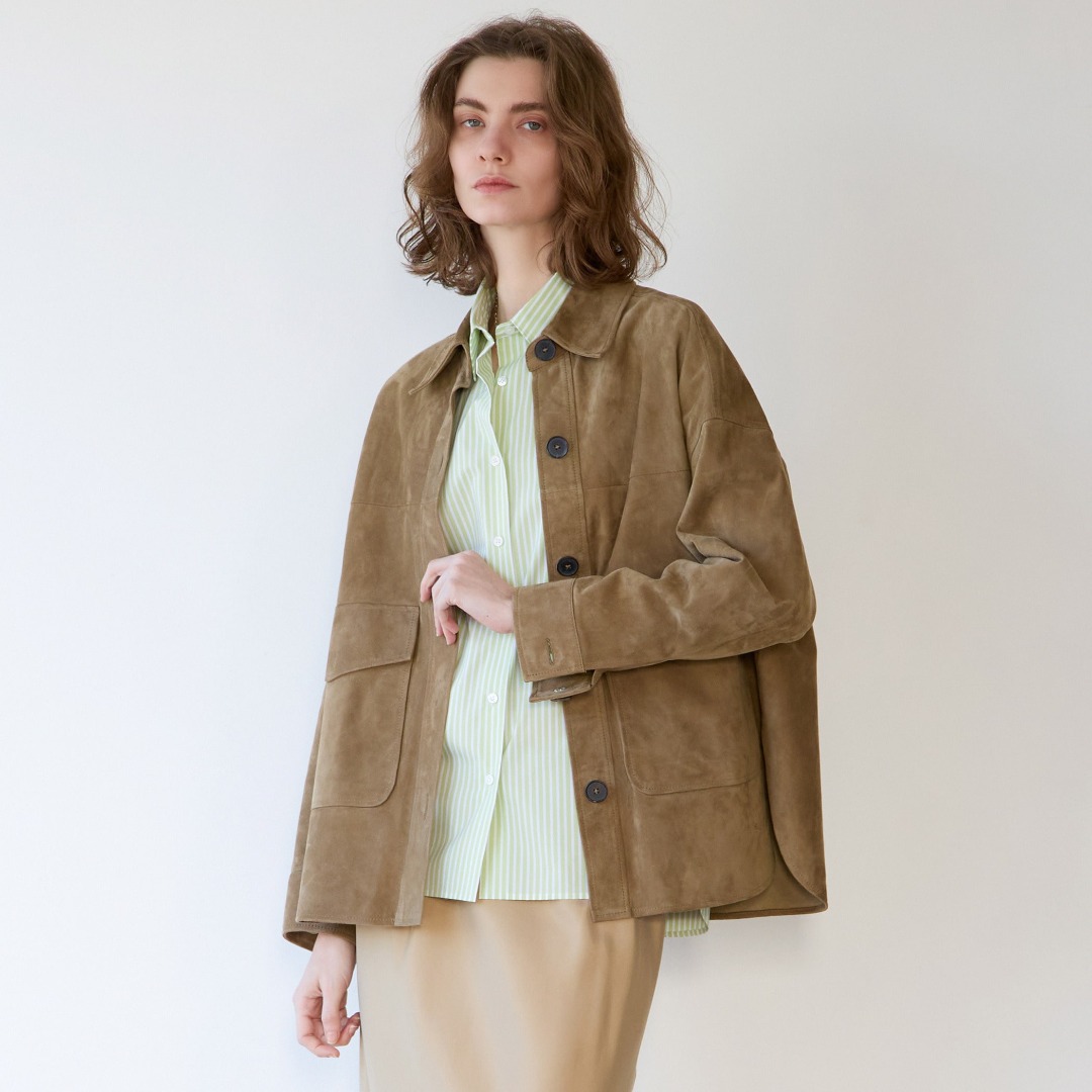 季節を問わず活躍するスエードジャケット。今シーズン欠かせないレーススカートを合わせ、旬なコーディネートに。春らしい柔らかなグリーンストライプがポイントになります。
