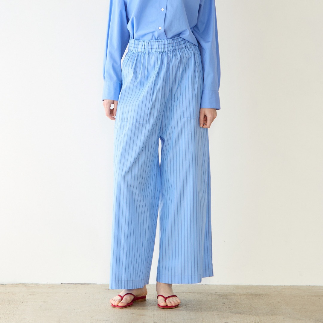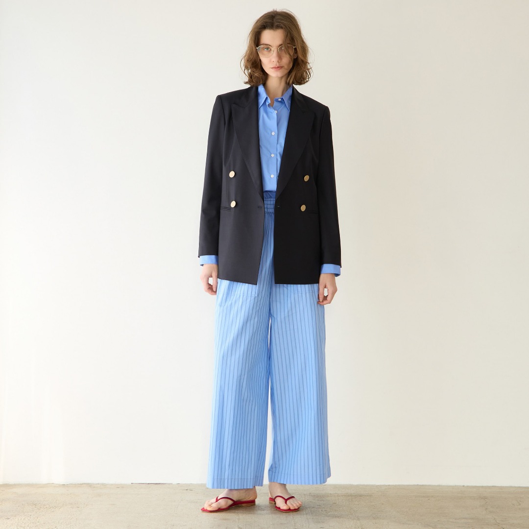 パジャマスーツのようなストライプシャツのセットアップに、きちんとしたジャケットを羽織った、大人なバランスのスタイリング。