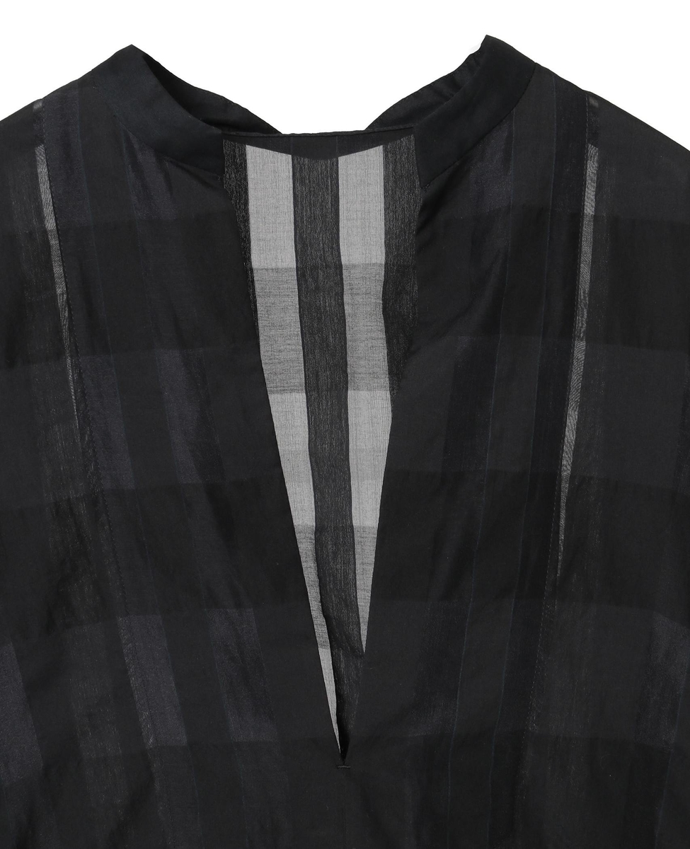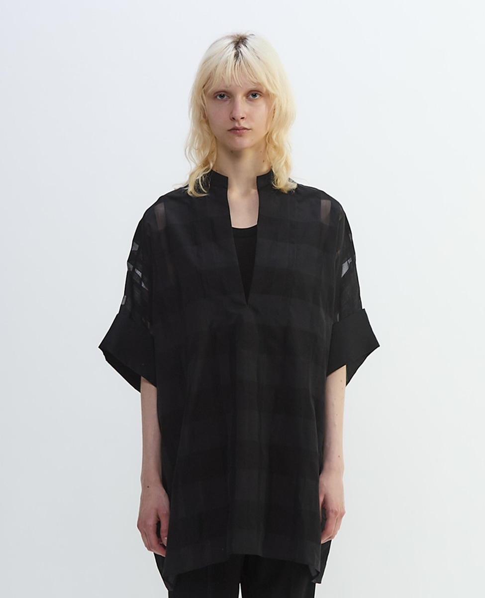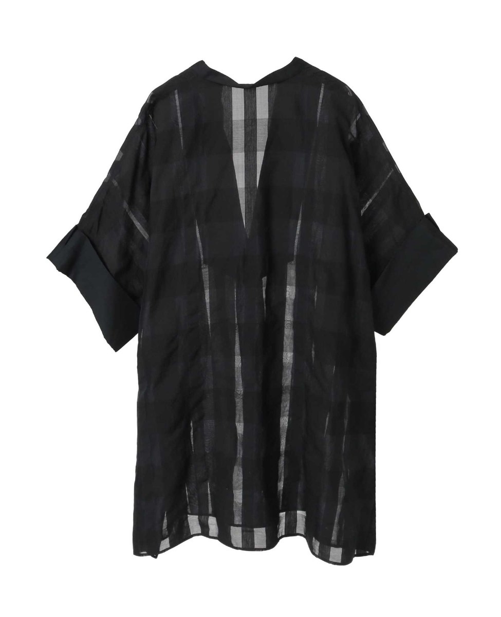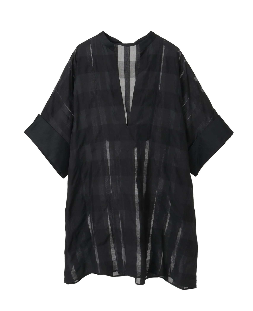 デザインチュニック。シルクコットンのコードチェックワッシャーのシアー素材。迫力のある大きなチェック柄が特徴。柄に合わせ続き袖デザインです。トリアセドライジャージ「トリアセドライジャージストレートパンツ(A1553UP205)」の細いパンツとのスタイリングがお薦めです。