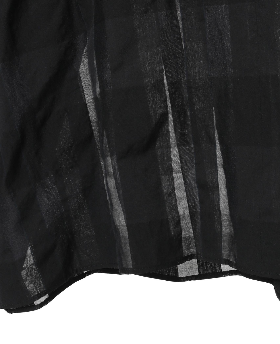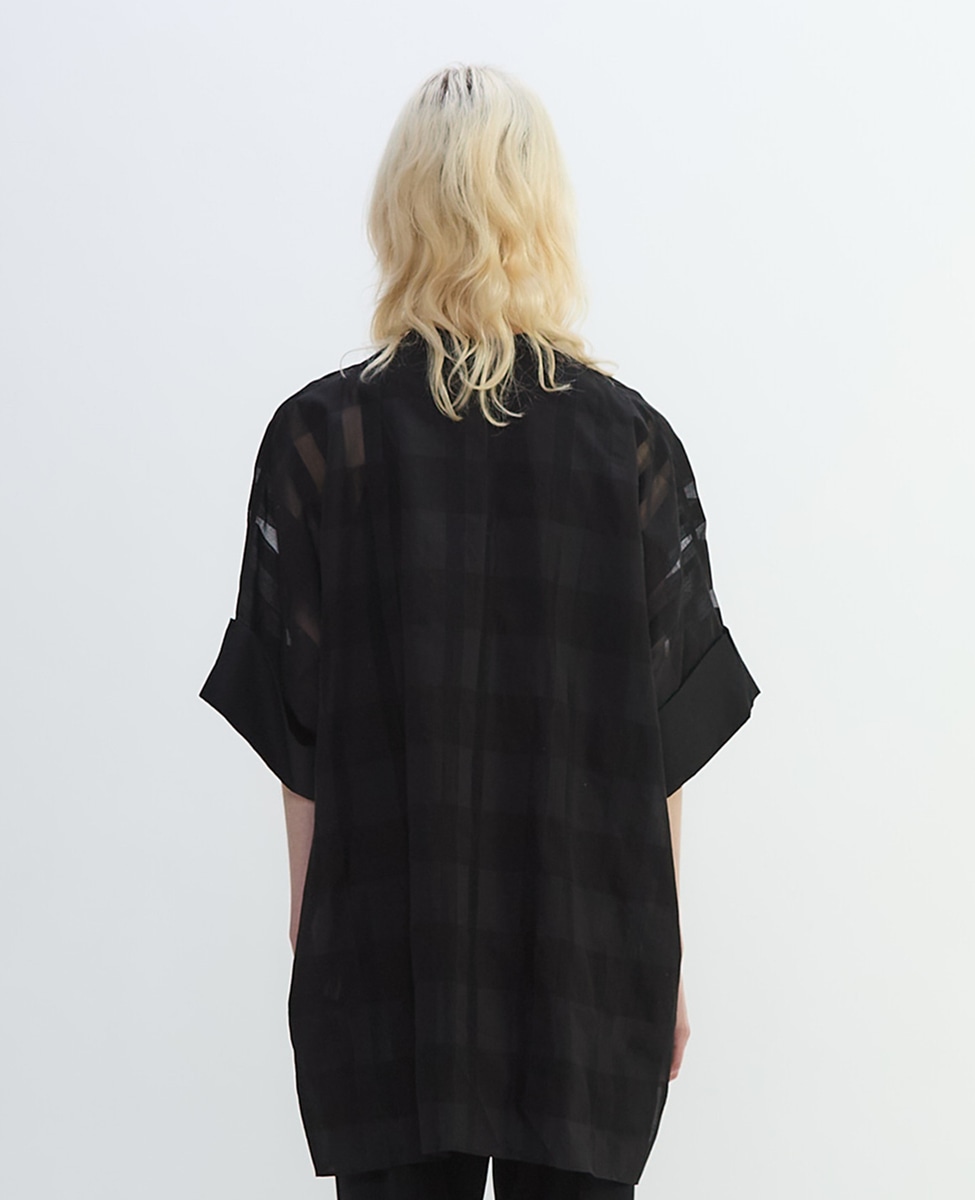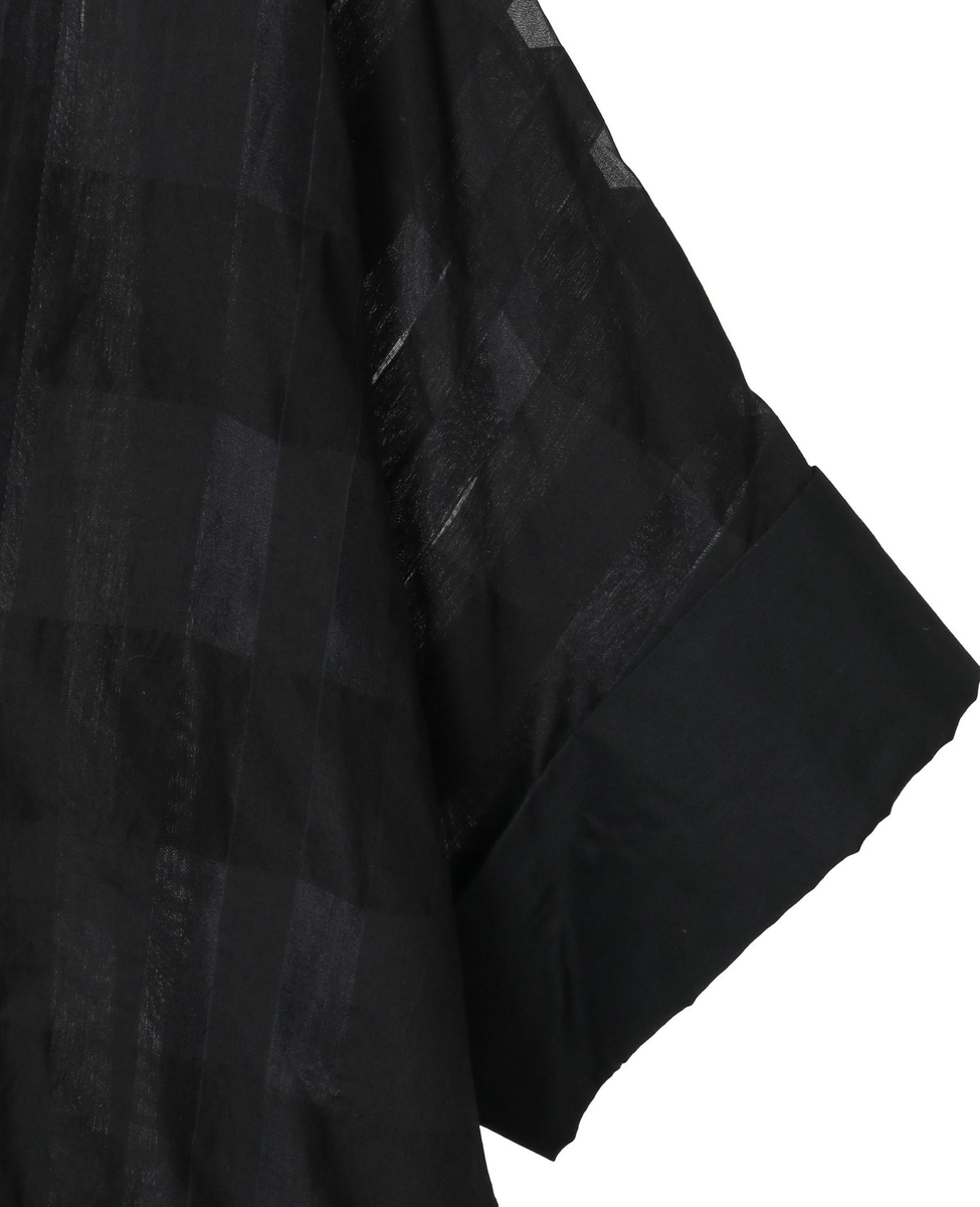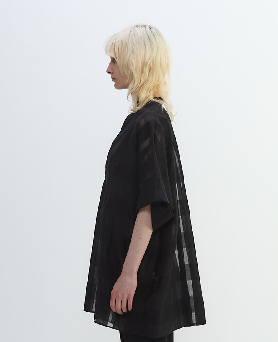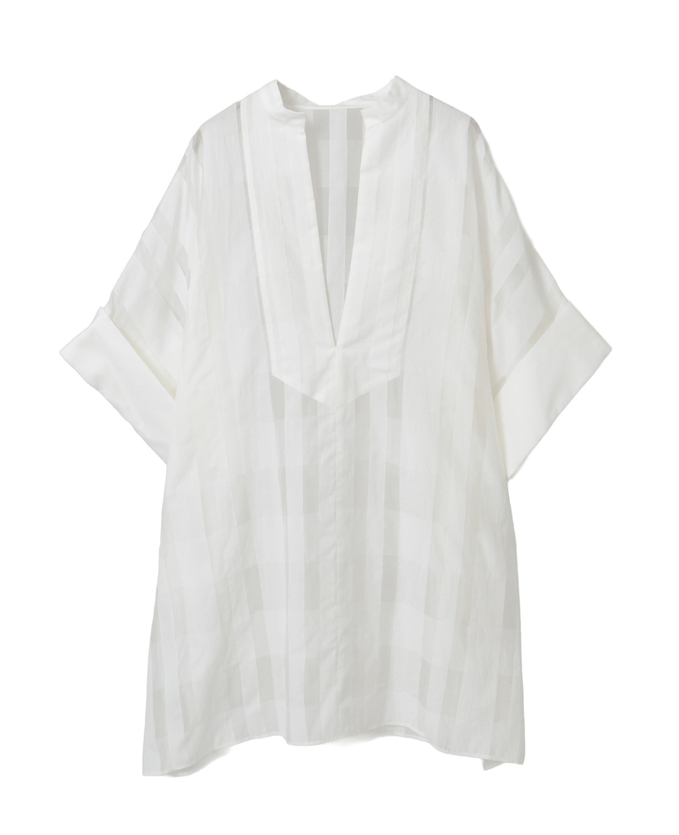 デザインチュニック。シルクコットンのコードチェックワッシャーのシアー素材。迫力のある大きなチェック柄が特徴。柄に合わせ続き袖デザインです。トリアセドライジャージ「トリアセドライジャージストレートパンツ(A1553UP205)」の細いパンツとのスタイリングがお薦めです。