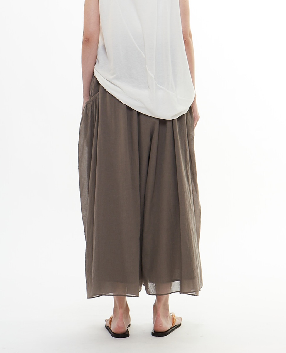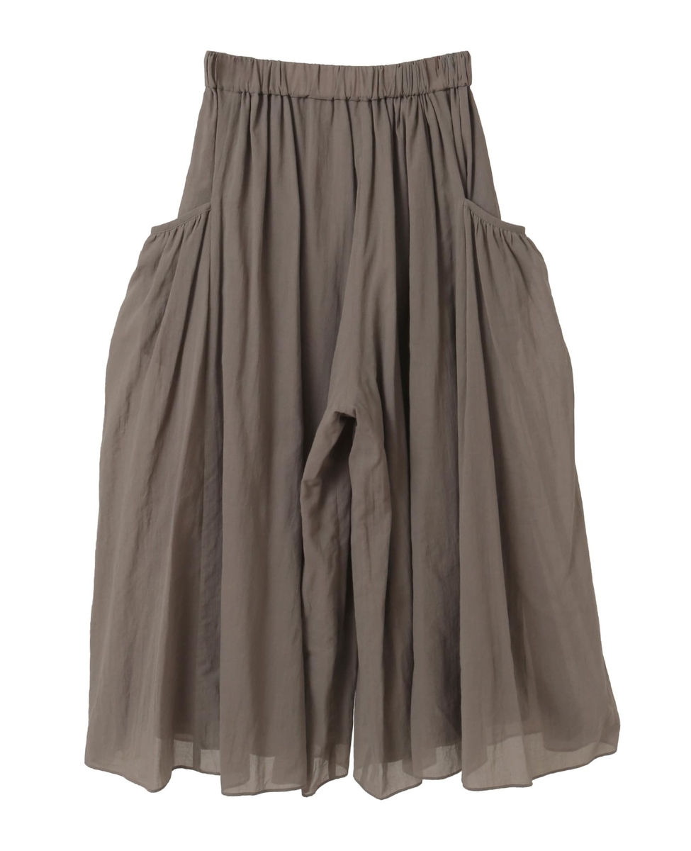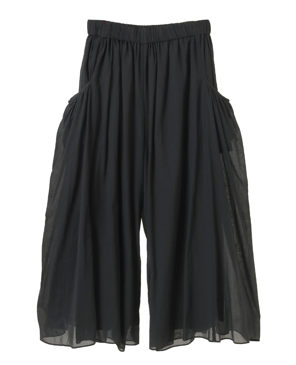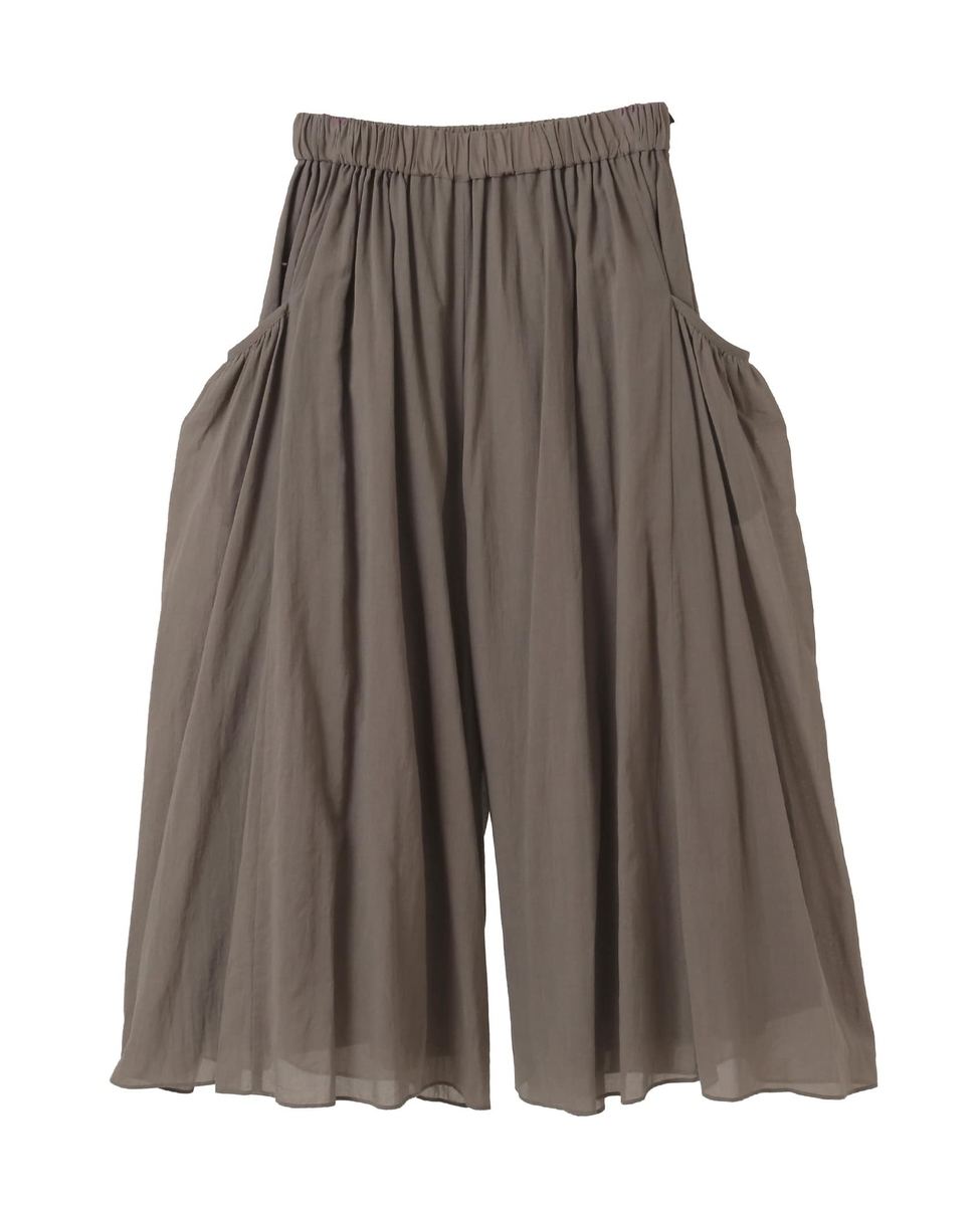 ギャザーをたっぷりと施したスカート見えパンツ。細番手の糸に膨らみとシャリ感を持たせ染色加工で揉み込みナチュラルな表情と清涼感を持たせた軽いボイル素材。透けないコットンローン裏地を付けていますので透け感を気にせず着ていただく事が可能です。