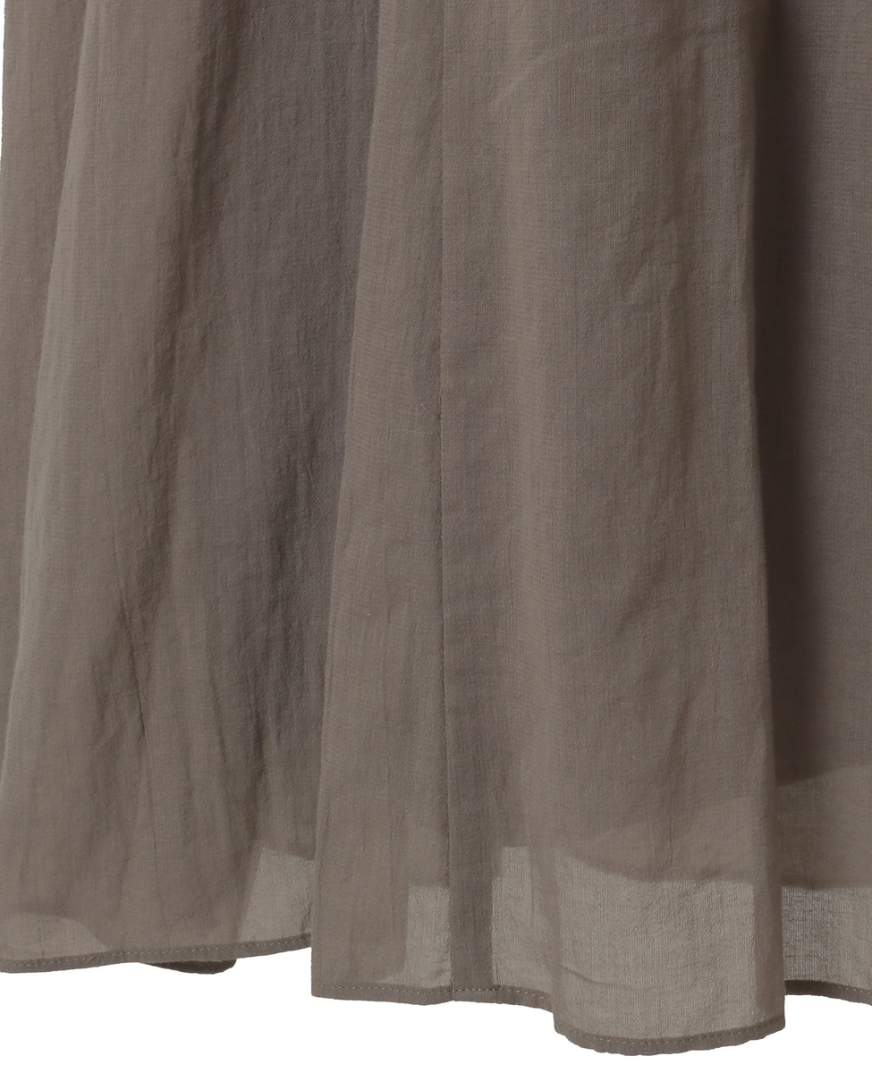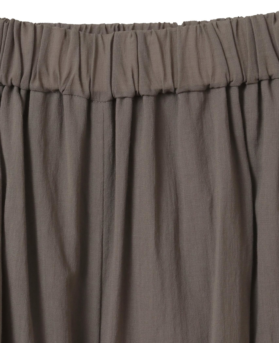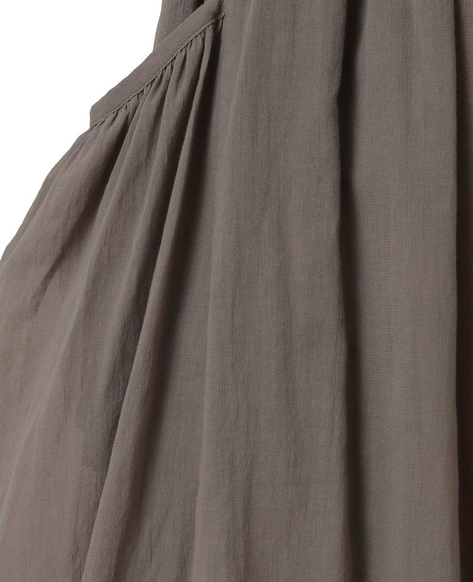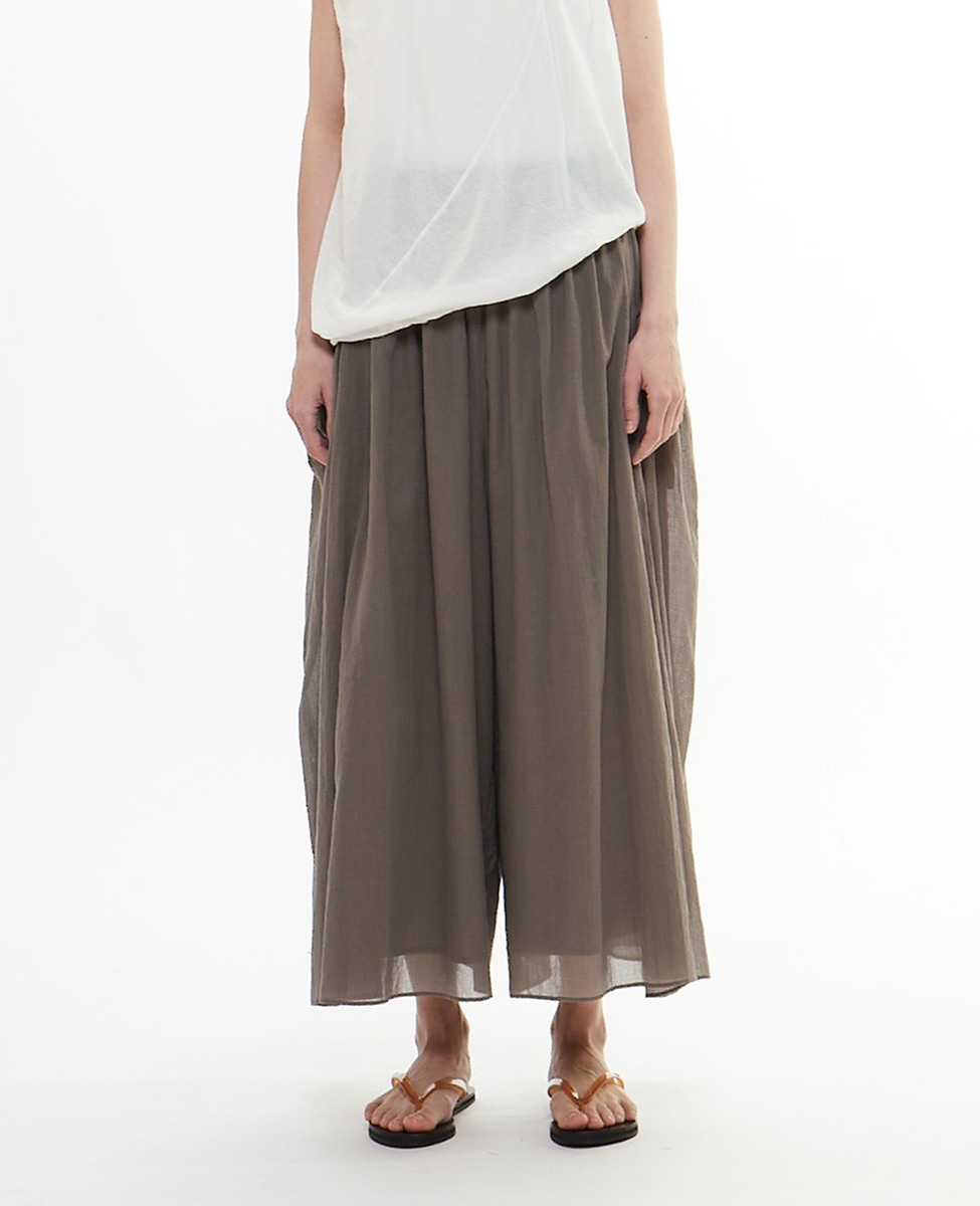 ギャザーをたっぷりと施したスカート見えパンツ。細番手の糸に膨らみとシャリ感を持たせ染色加工で揉み込みナチュラルな表情と清涼感を持たせた軽いボイル素材。透けないコットンローン裏地を付けていますので透け感を気にせず着ていただく事が可能です。
