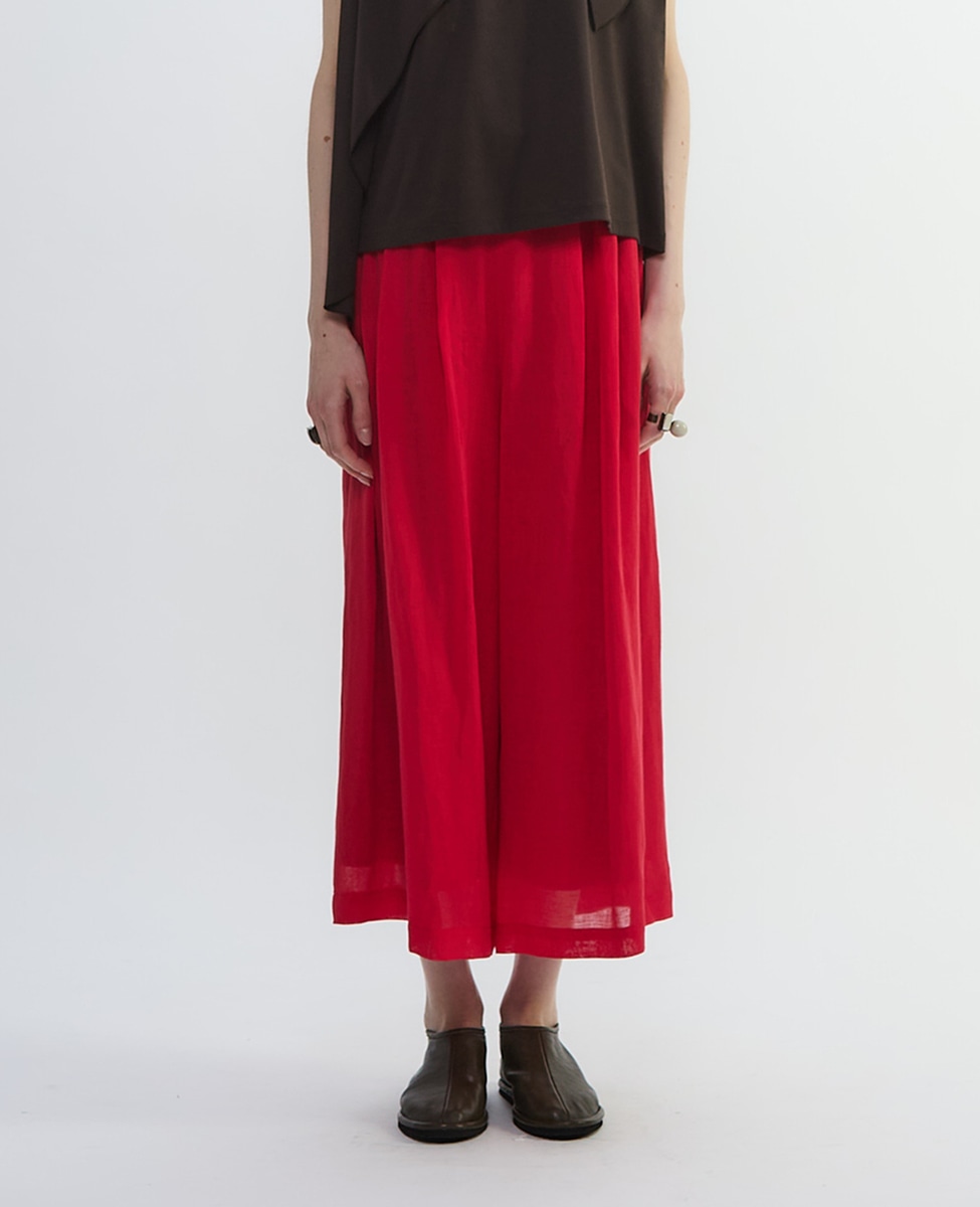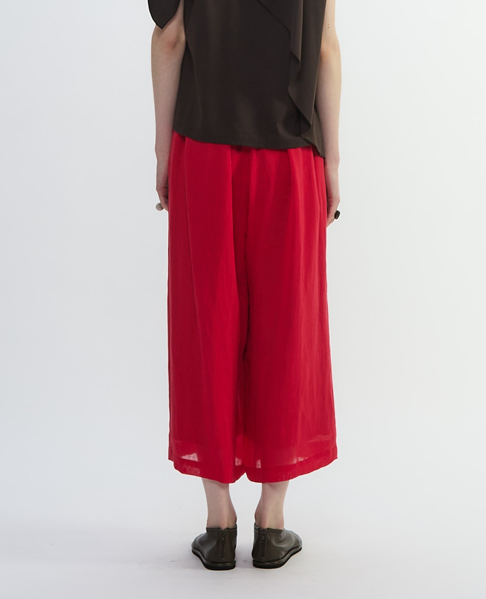 タックディテールのワイドクロップパンツ。リネンコットンのガーゼ素材。コットンローンの裏地が付き肌触りにもこだわりました。ウエストはゴム仕様で簡単に着脱可能です。02レッドは、プレインピープルオリジナルカラー