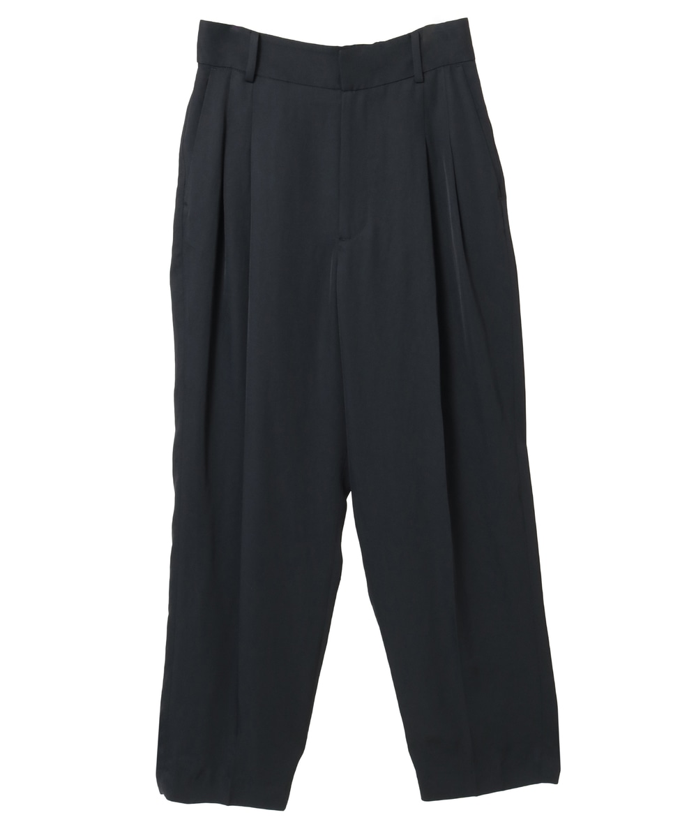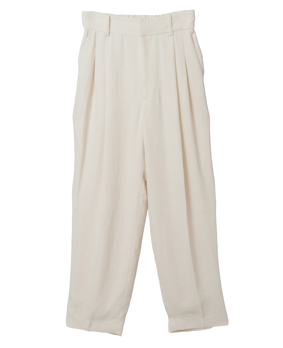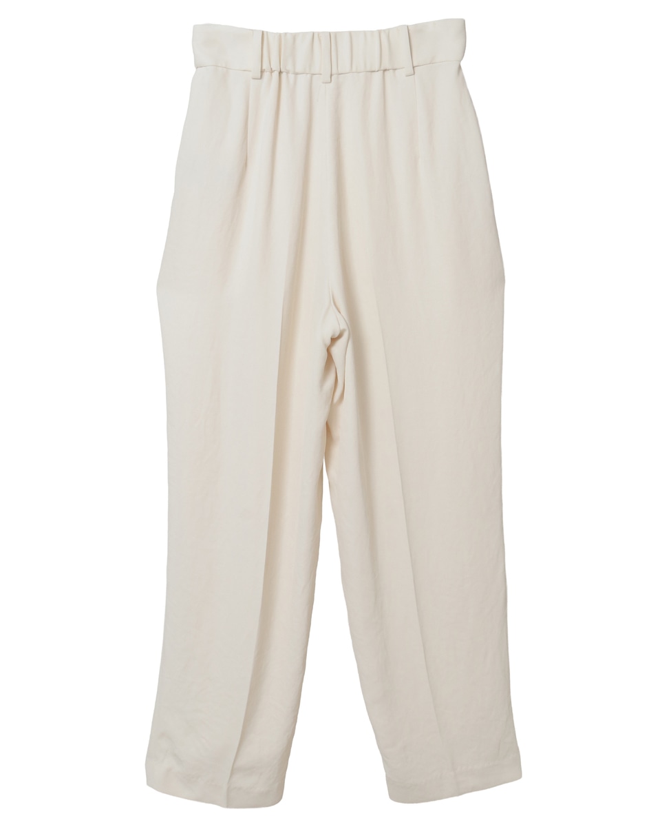 アセテートギャバジンは、環境に配慮したアセテートのツイルでエコ素材です。シルキーなタッチと美しいドレープ性が特徴です。ウエストベルトを太目に取ったドレスライクなタックスラックスパンツ。シルキーな素材感には、温かみのあるニットを合わせてコントラストが生まれるスタイリングがおすすめです。