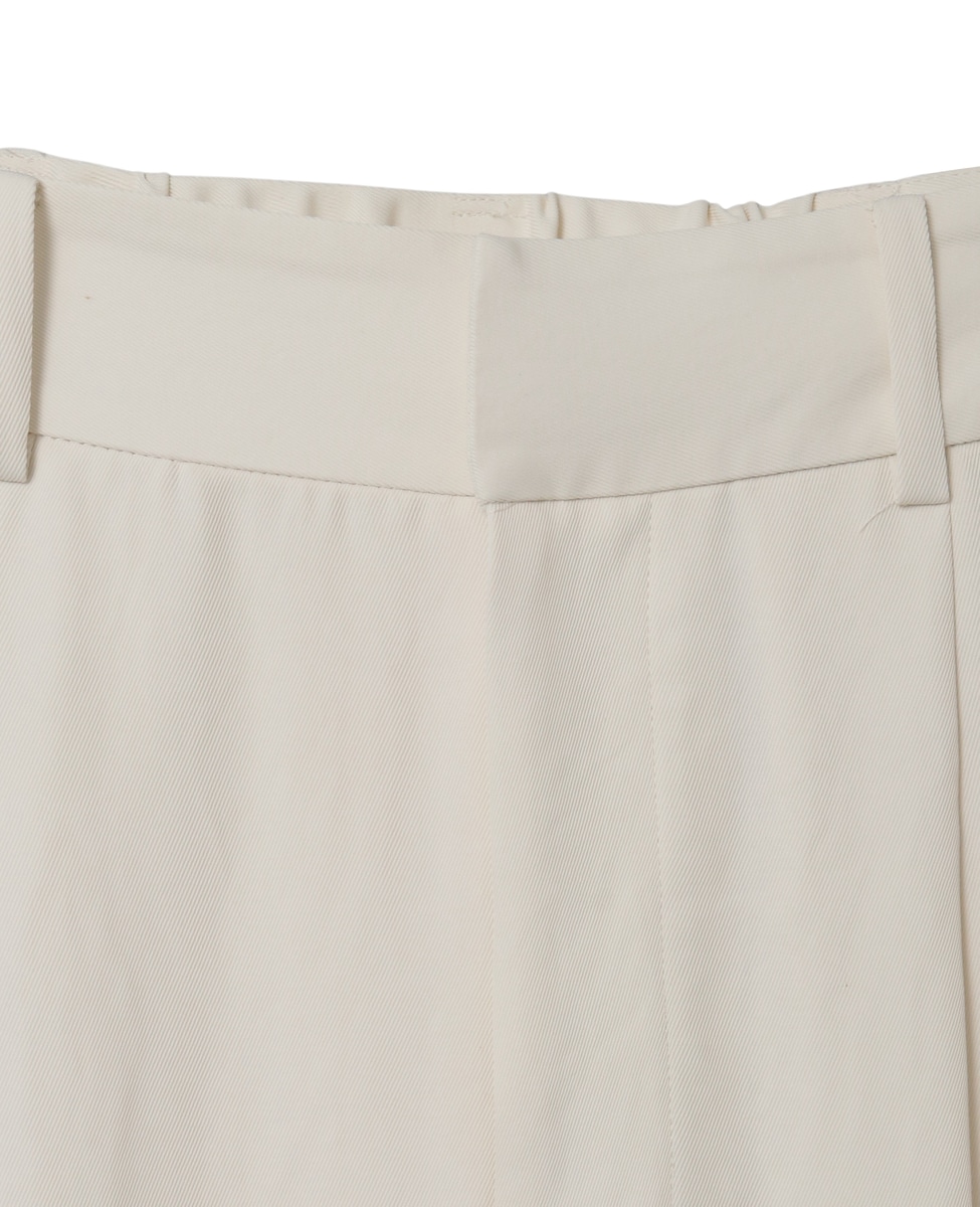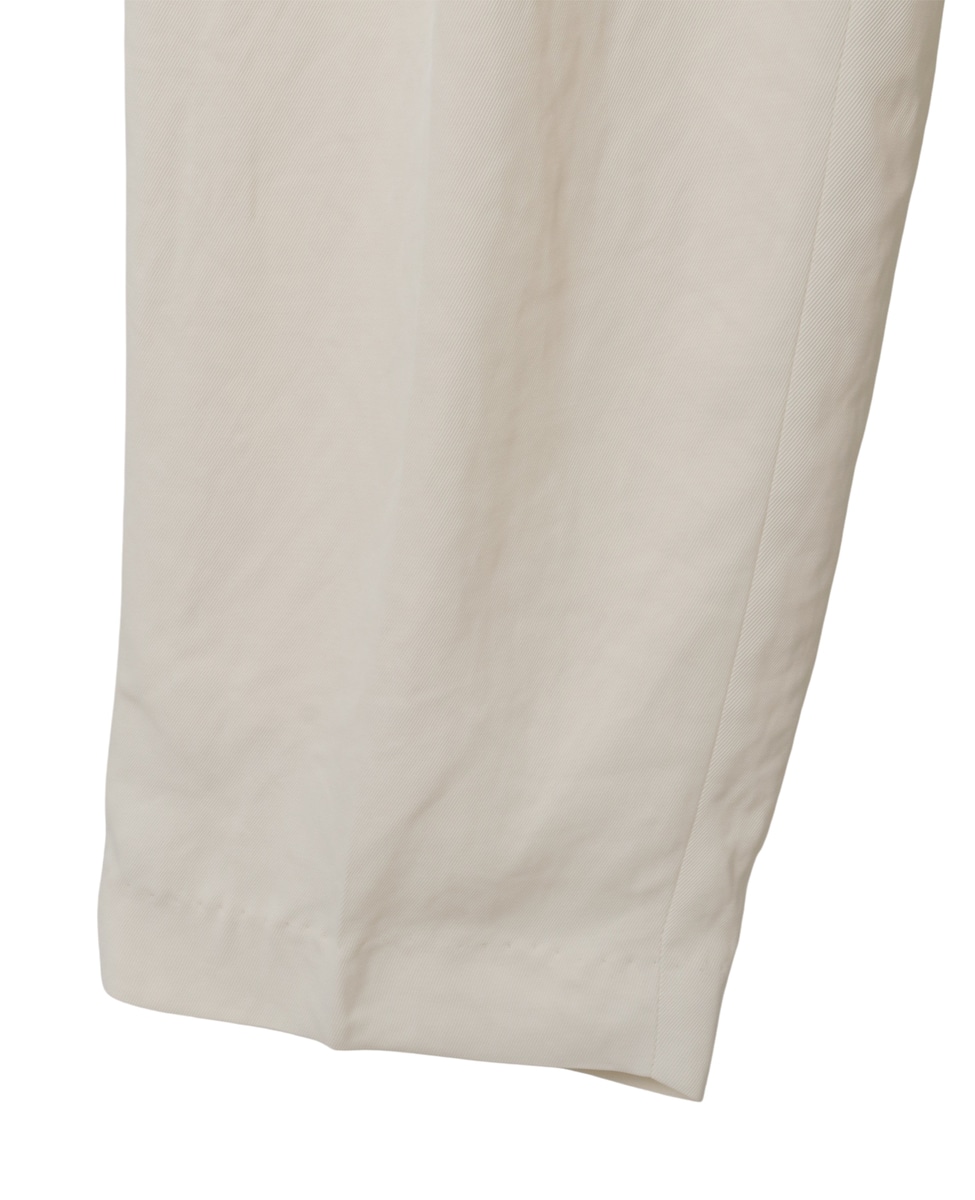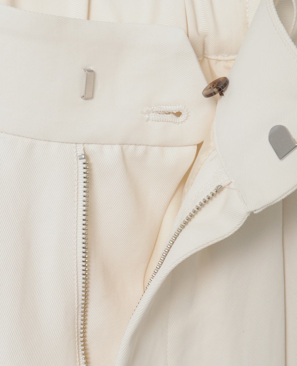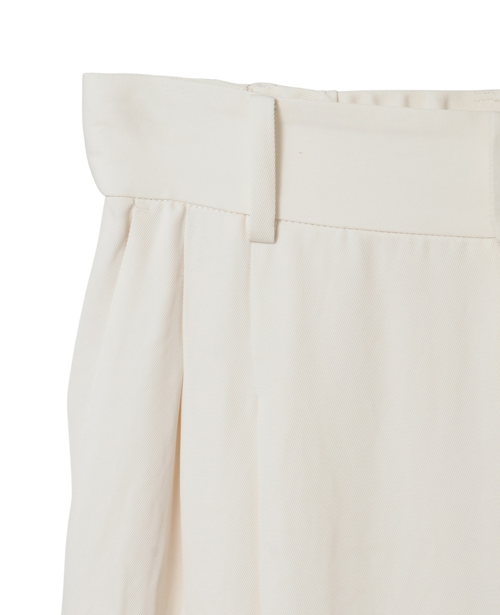 アセテートギャバジンは、環境に配慮したアセテートのツイルでエコ素材です。シルキーなタッチと美しいドレープ性が特徴です。ウエストベルトを太目に取ったドレスライクなタックスラックスパンツ。シルキーな素材感には、温かみのあるニットを合わせてコントラストが生まれるスタイリングがおすすめです。