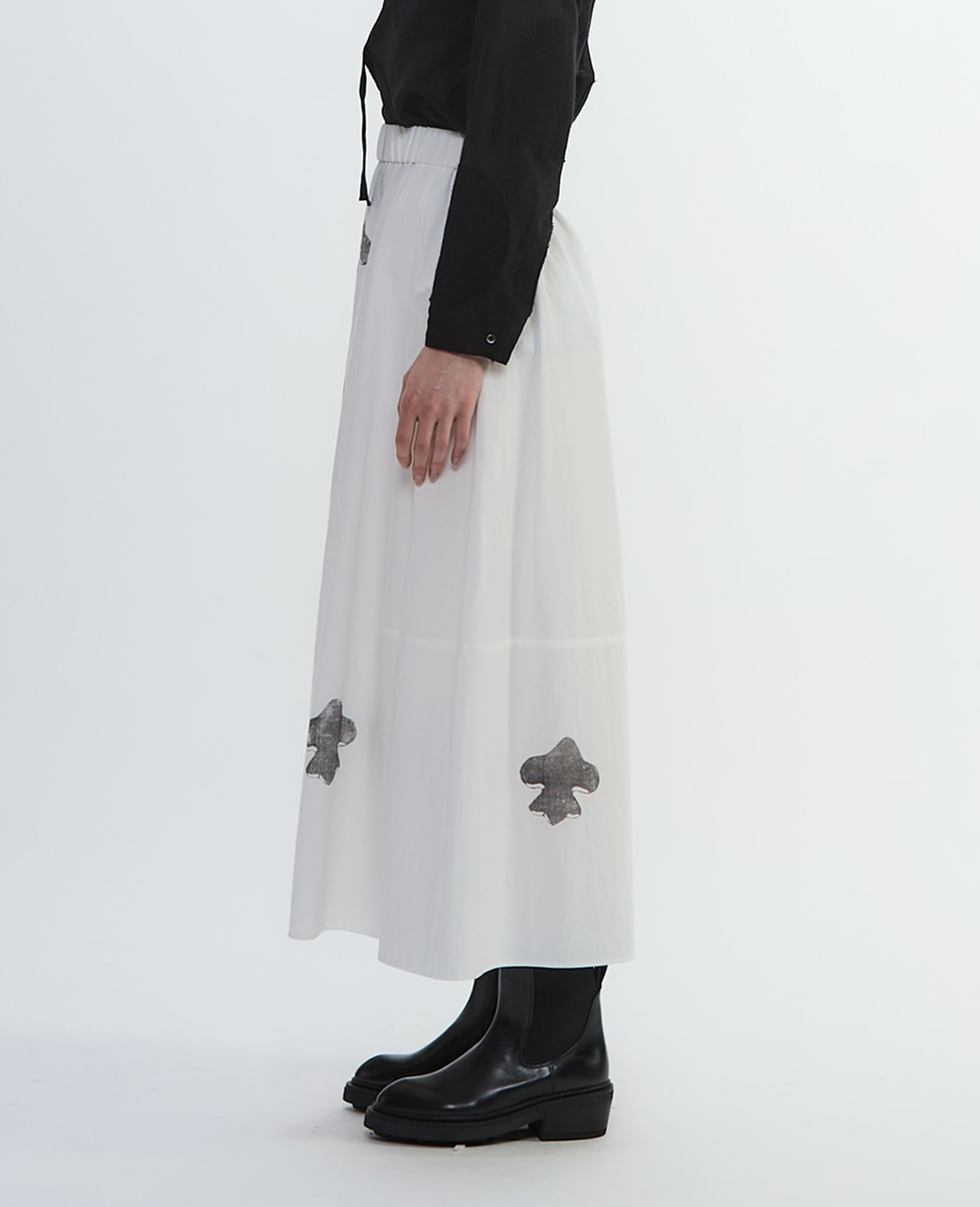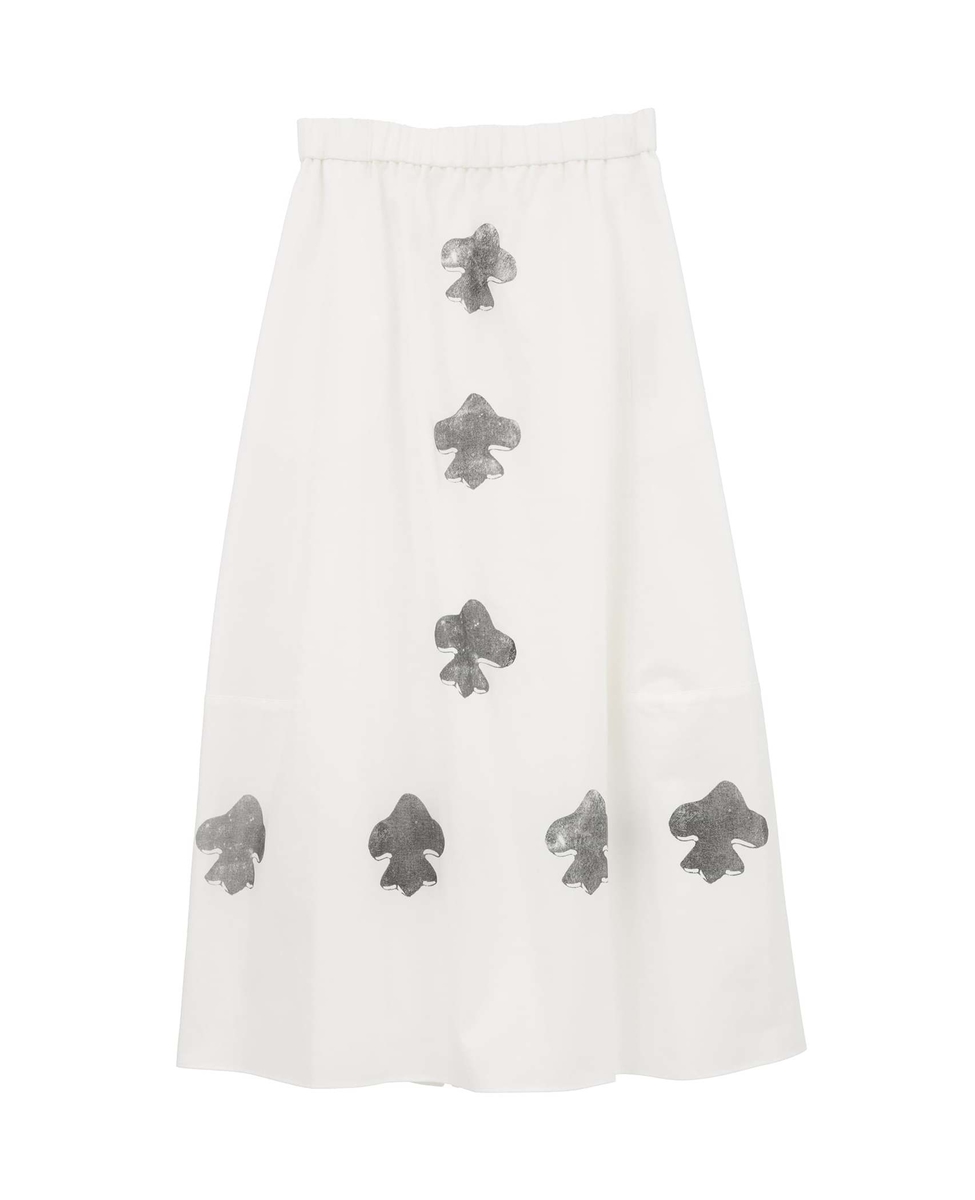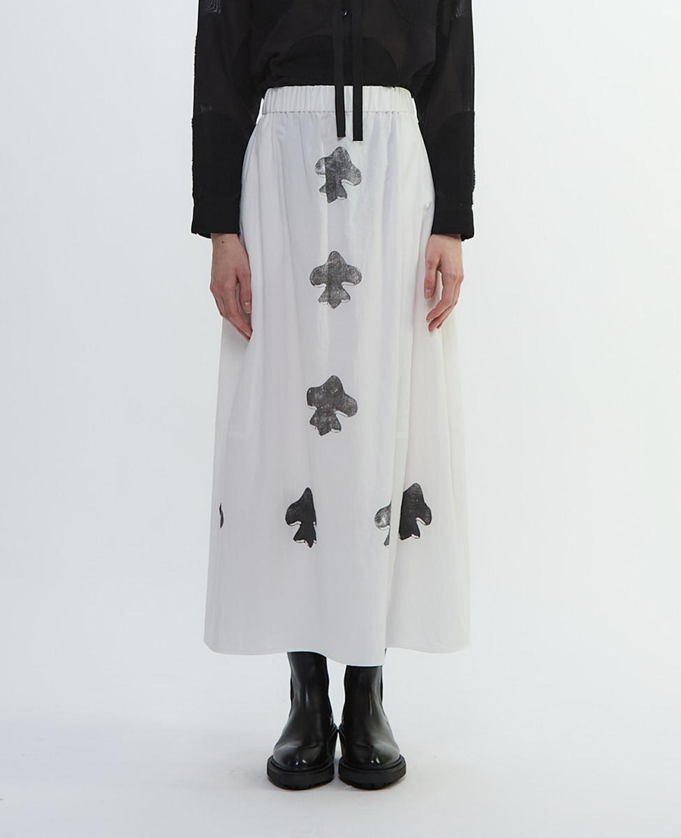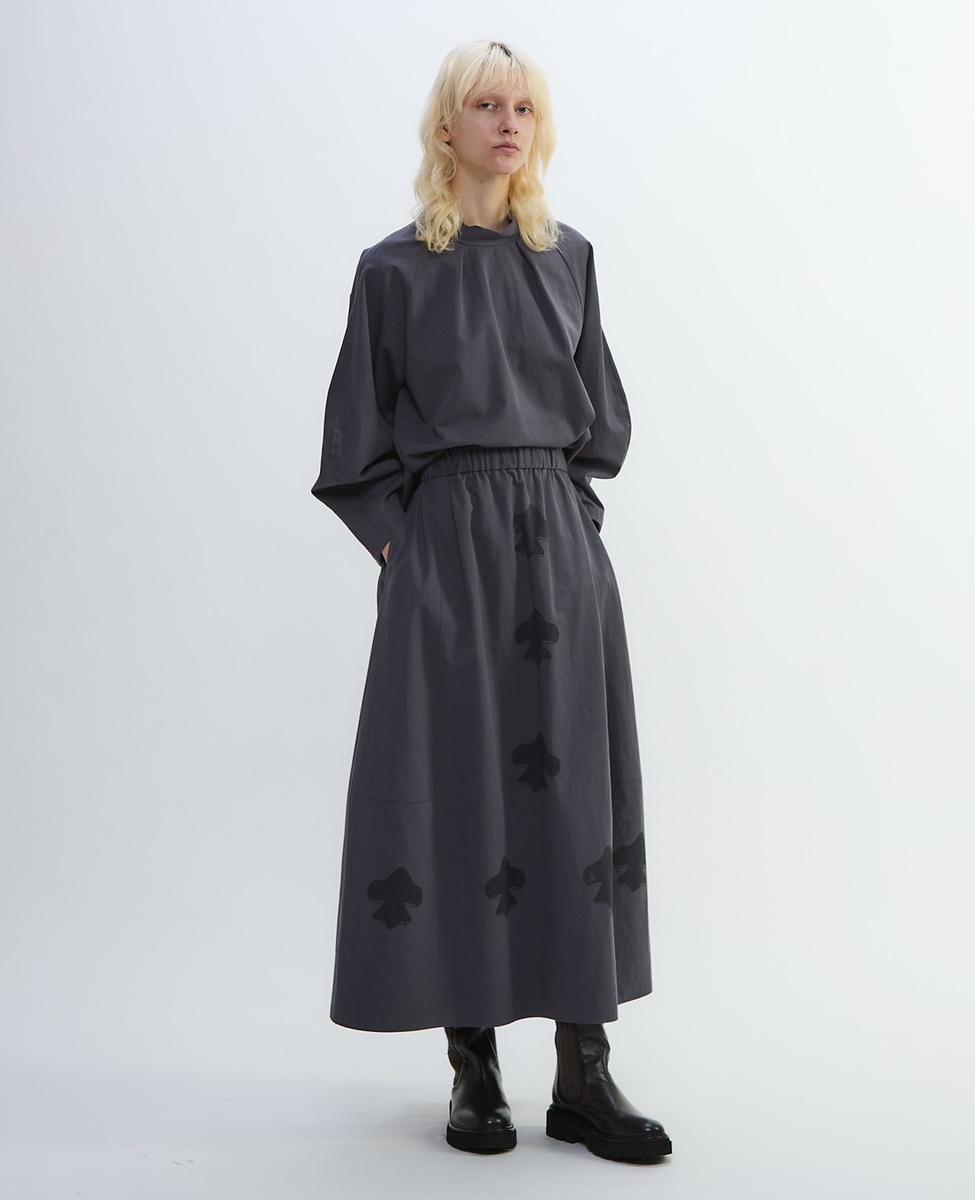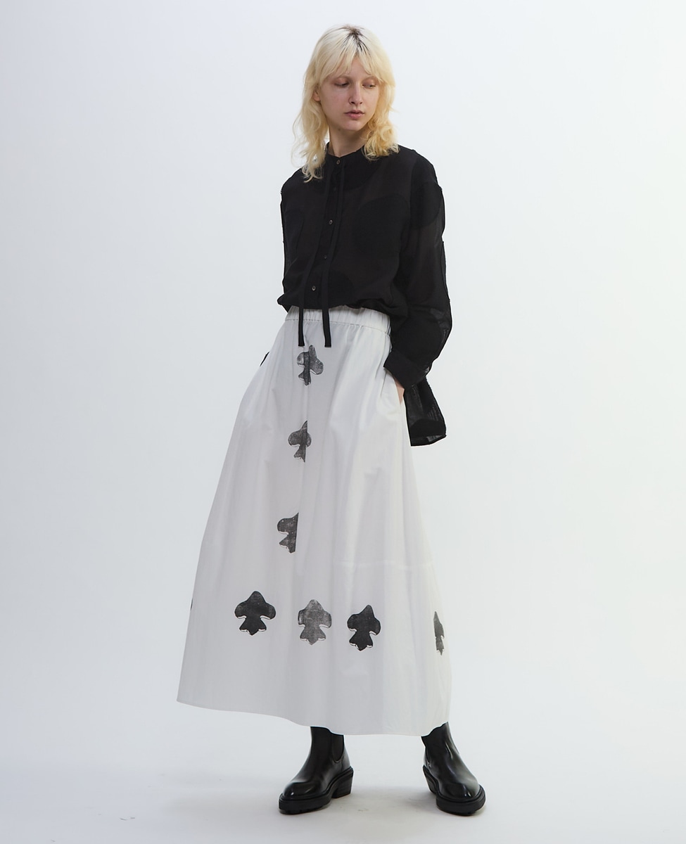 やや丸みを帯びたさりげないバルーンシルエットスカート。高密度に織り上げたコットンリネンは、綾織ならではの程よいハリがあり、透けを気にせず着られる安心感が特長。丁寧に使い込まれたシーツを思わせるような、マットで落ち着いた質感です。百合の紋章をかたどった印象的なモチーフのプリント。前中心と裾、そして後ろ裾に加えたスタンプのような柄が、どこか手仕事のぬくもりを感じさせます。コンパクトな「シア―ハイツイストフライスショール型レイヤードTシャツ(A1553UTS309)」や、「ダンガリーウエスタンシャツ(A1553FB304)」、「ビッグドットスラッシュネックシャツ(A1553FB357)」などとのコーディネートなどがおすすめです。
