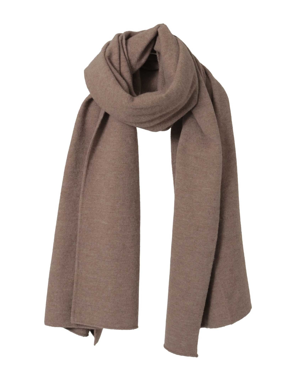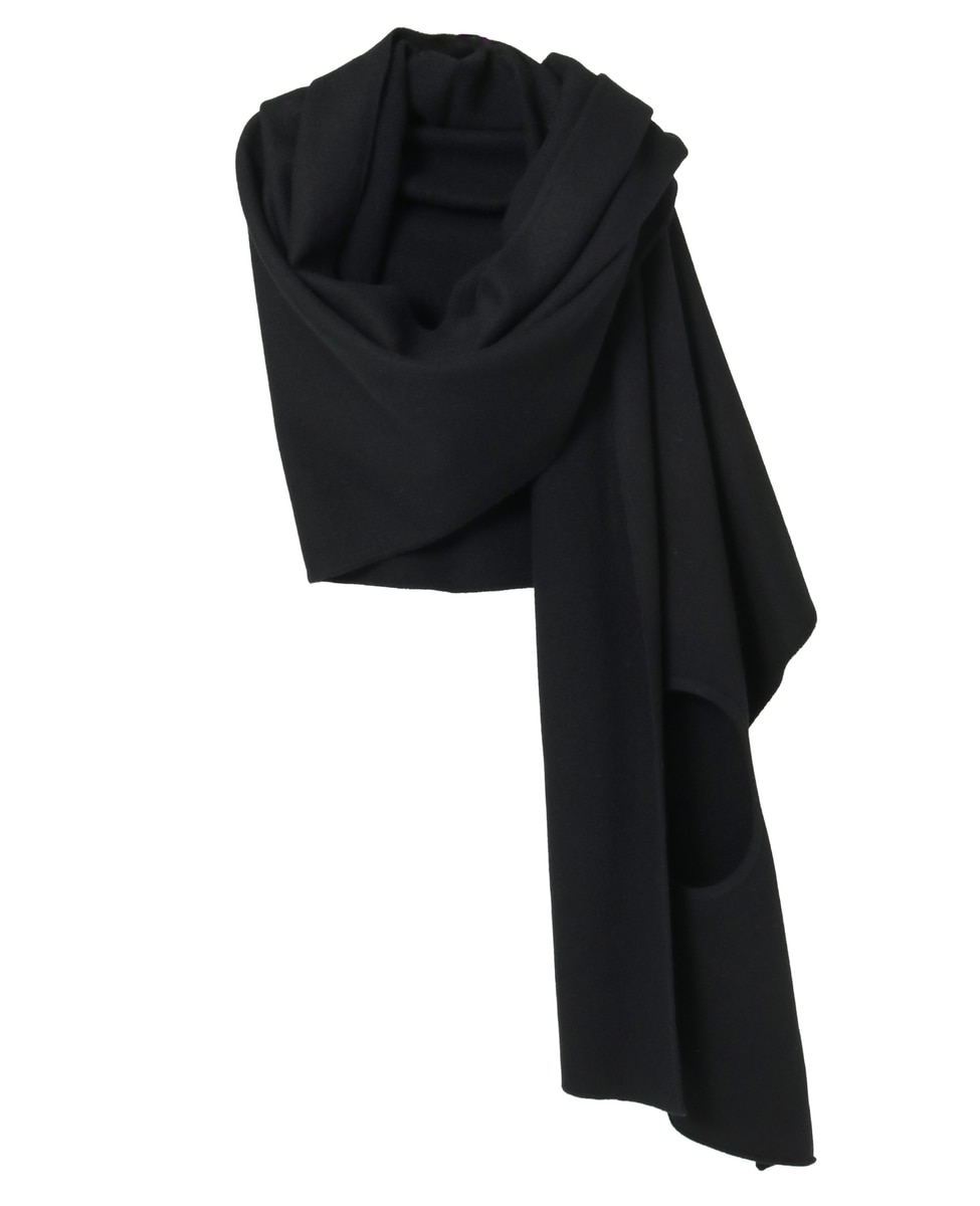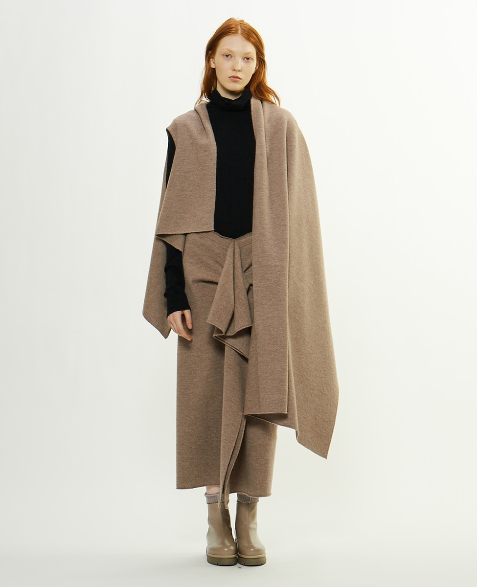 ニット編地を圧縮加工しカット縫製した手の込んだ仕様です。17,5マイクロンという非常に細く滑らか、バルキー性のある温かみのあるセミ梳毛の糸は圧縮加工をしても硬くならず柔らかな風合いを生み出すことができます。ポコポコとした表面感、適度なハリと柔らかさのバランスにこだわって圧縮仕上げをしています。片方に腕を通す穴をあけた大判ストール。片側に袖を通すことができるので着用時に安定感があります。薄手のコートの上などからさっと巻くだけでスタイリングが様になります。