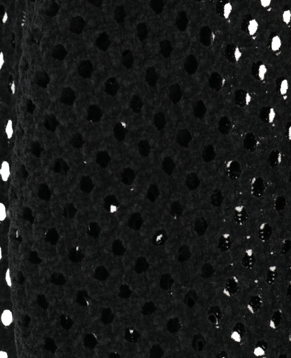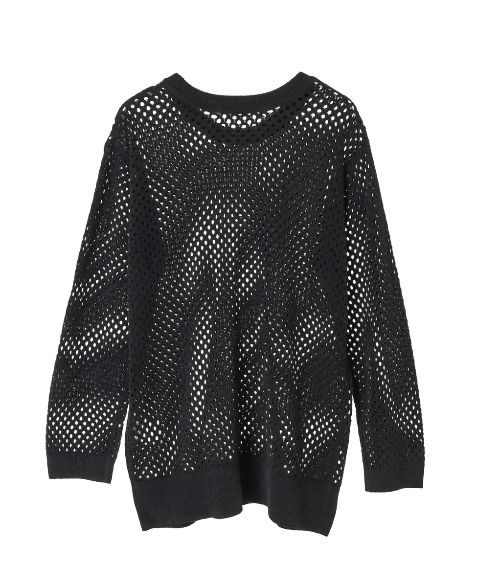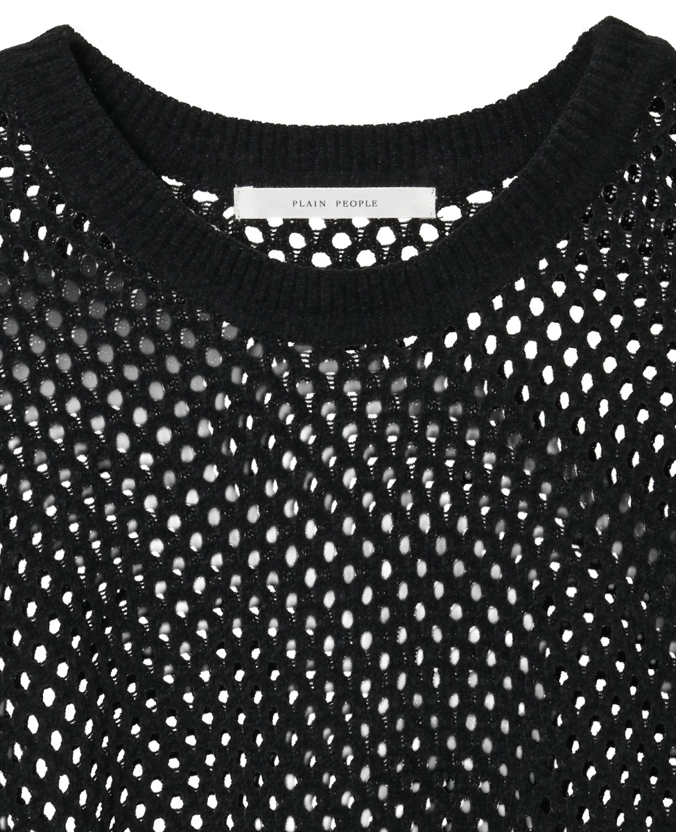 程よくゆとりのある長袖Tシャツをイメージしたセーター。細かいベロアのような毛足のコットンモールヤーンと、無撚糸のポリエステルを引き揃えた畦編みです。軽さと適度なハリ感を出すために無撚糸のポリエステルを引き揃えています。非常に珍しいコットン素材のモールニットです。メッシュ風編地にすることでよりストレスなく重ね着を楽しんでいただけます。大き目のメッシュ編地がモール糸でありながら軽くて涼し気な印象。袖口や裾はスパン糸を入れてしっかりさせていますが、身頃と袖は入れていないので非常に軽いアイテムです。
