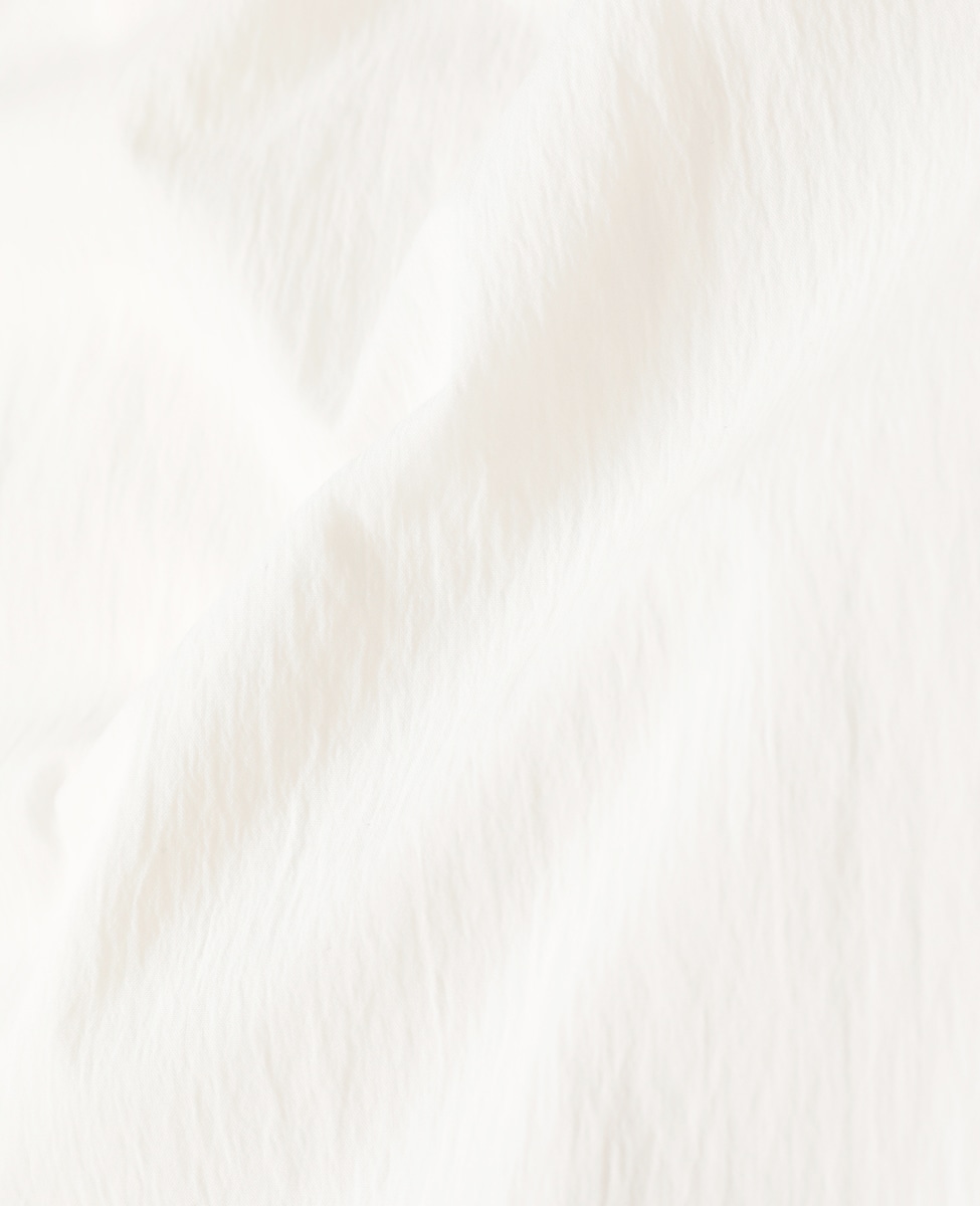 チリメンのような雰囲気のある素材。ナイロンとコットンを混紡し、清涼感と軽さがあり春夏の長い期間着用していただけます。衿元のタックと、ギャザーでボリュームを出した袖が印象的なブラウス。前開きなので羽織りとしても着用できます。