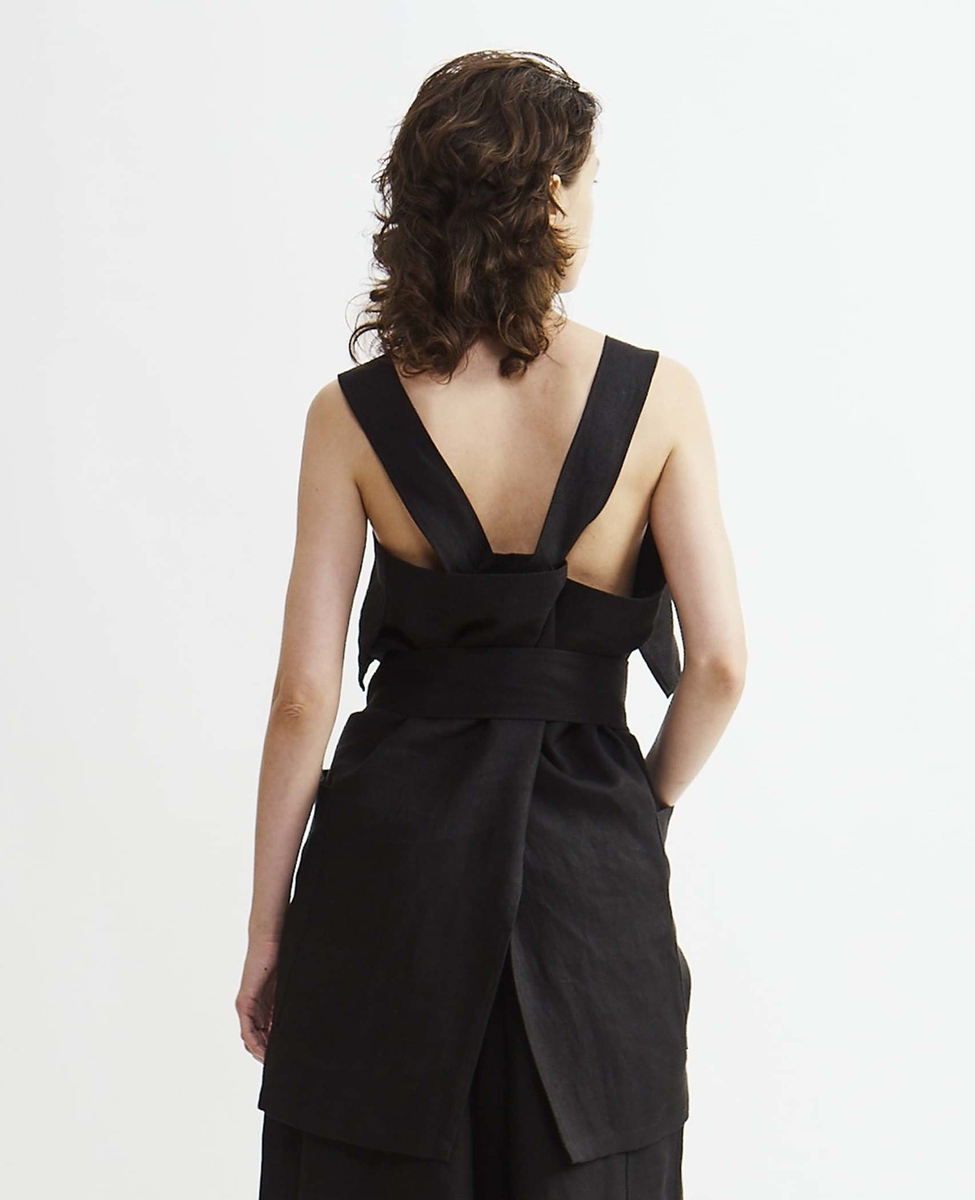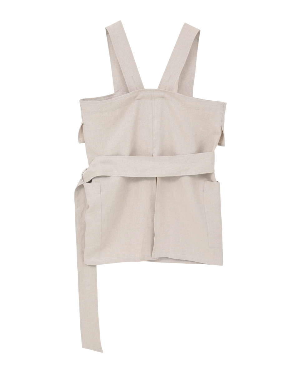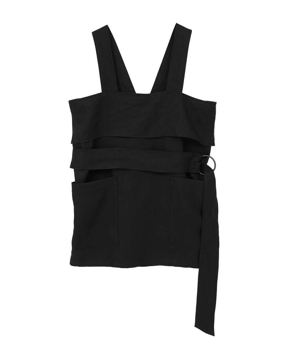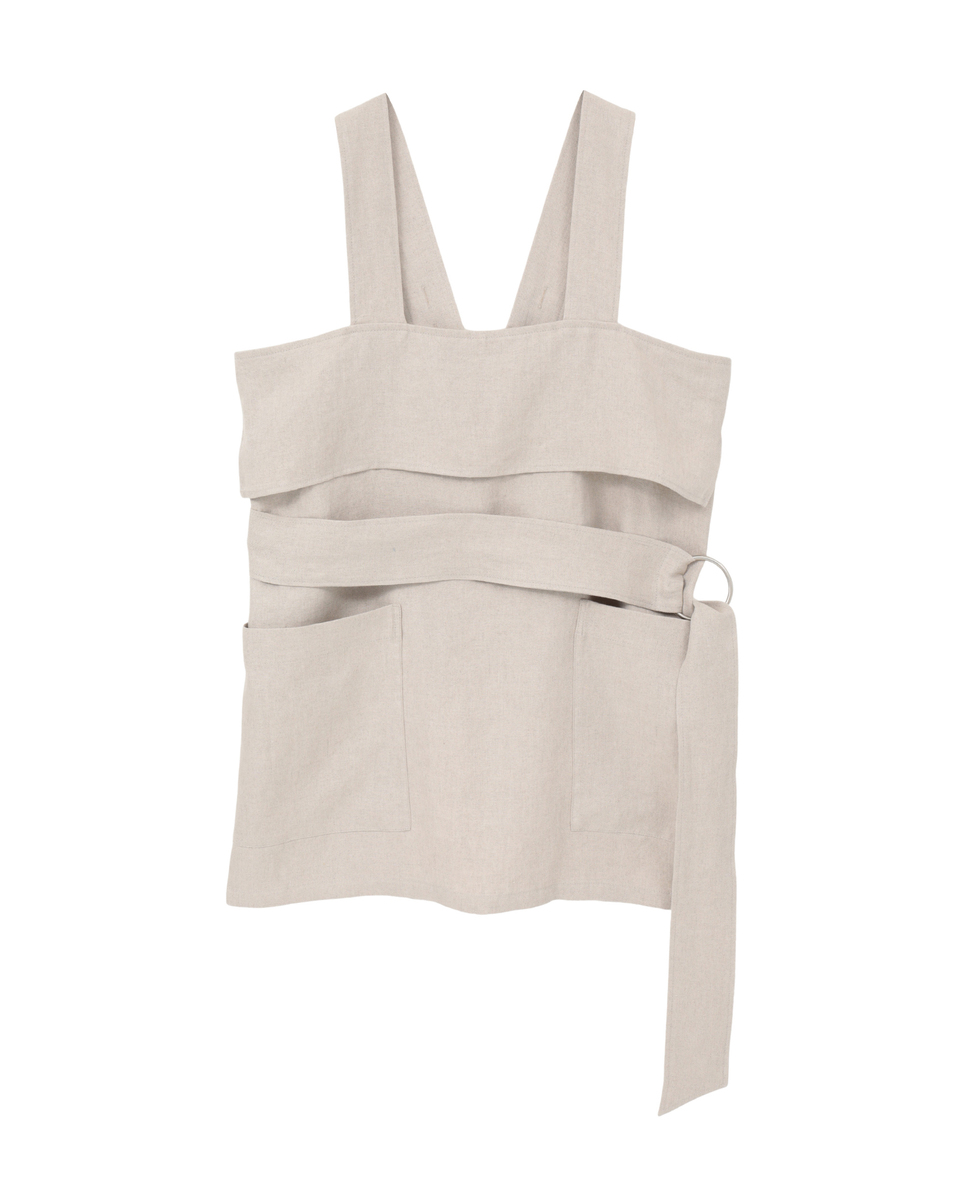 エプロンのようなタンクトッププルオーバー。長方形のパターンを筒状に縫いあわせたシンプルな作りですが大きめのポケットやゆとりのあるサイジング、太目のベルトで、スタイリングのポイントになるアイテムに仕上げています。