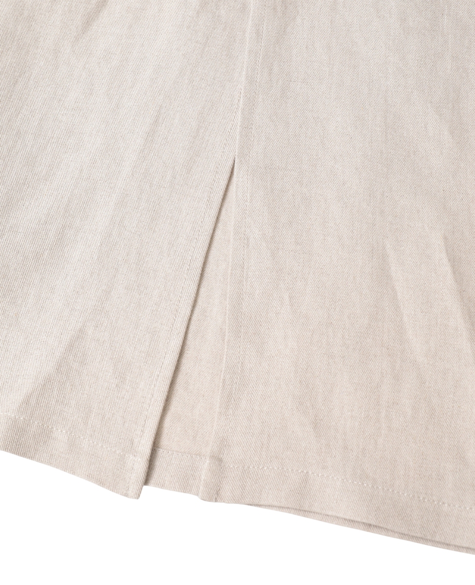 40番手の麻を高密度に織り上げ、その後生地を優しくたたきほぐす加工を施して高密度でありながら着心地の良い風合いに仕上げています。織りから染色、整理加工まですべての工程を日本国内で行っています。