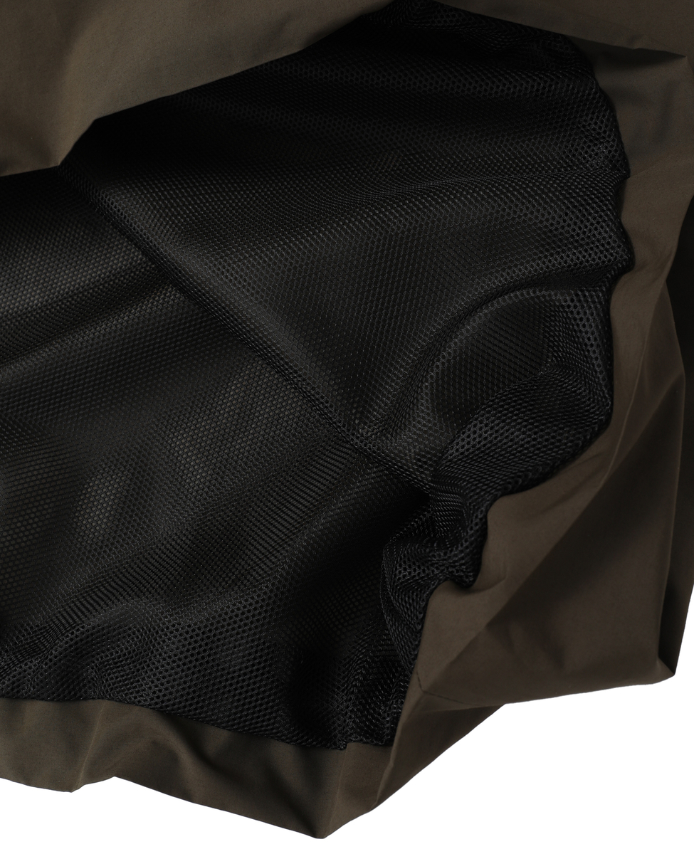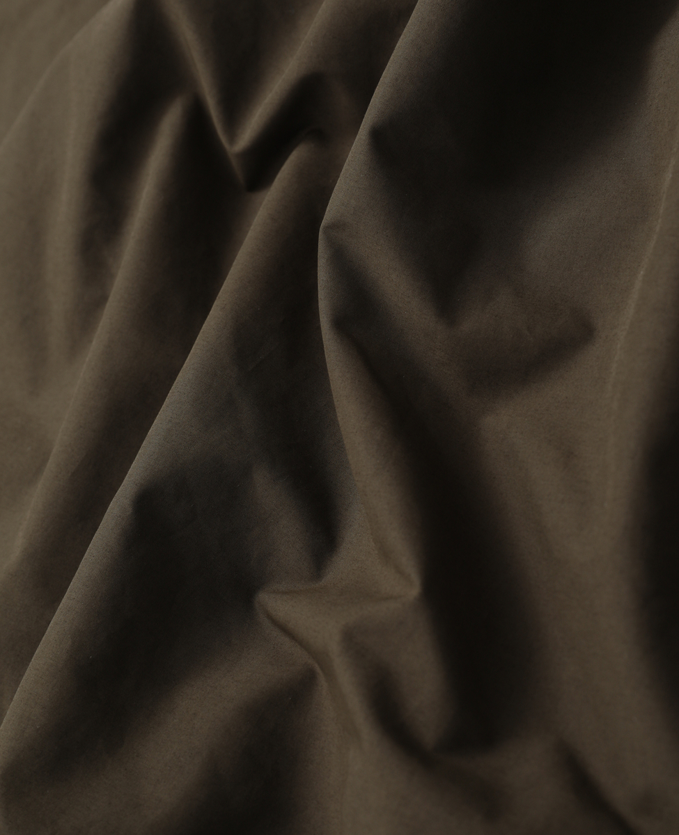 ポリエステル・ナイロンの高密度織物に特化した福井のテキスタイルメーカーの素材を使用。撚りをかけずループ結束させたタスラン糸で織り上げ、さらに染色過程で揉み加工を施すことで合繊の機能はそのままにナチュラルな洗いざらしのコットンのような風合いに仕上げました。しなやかでハリコシがあり型崩れしにくく仕立て映えする素材です。