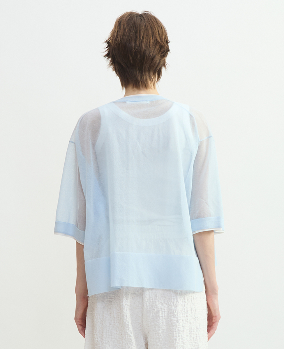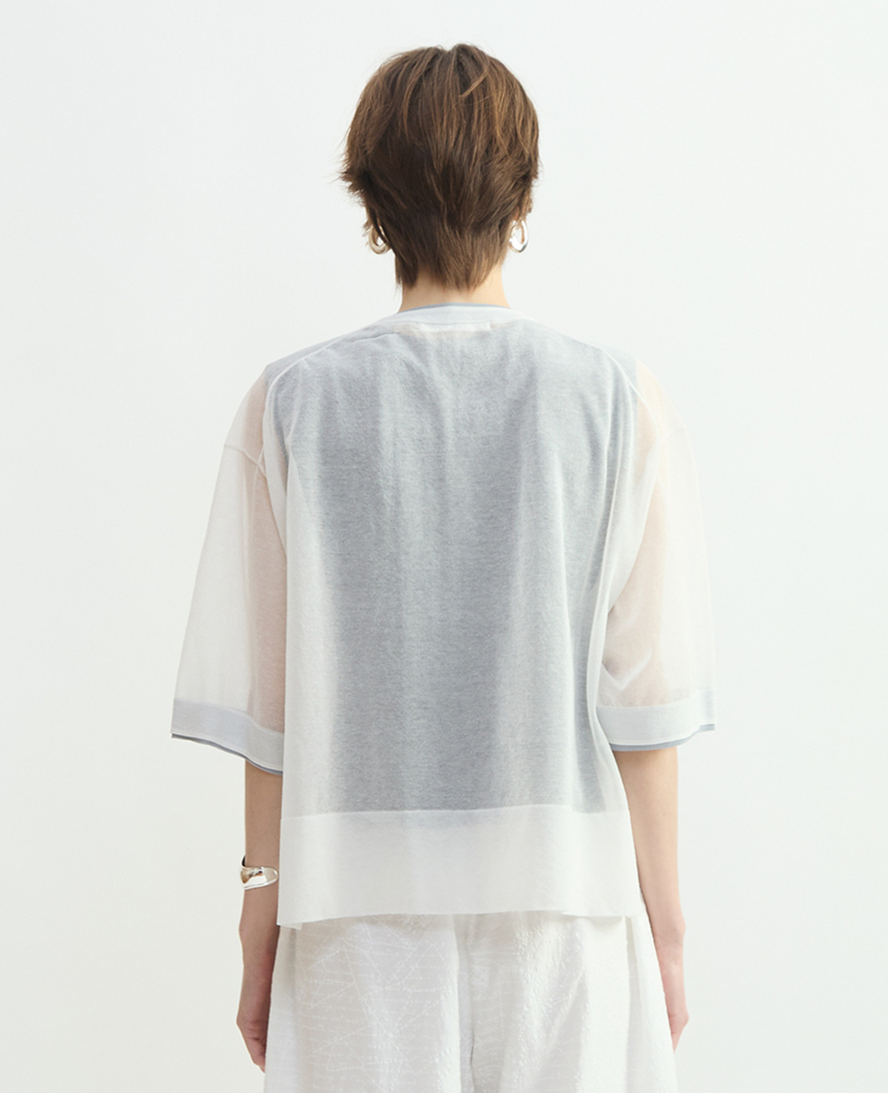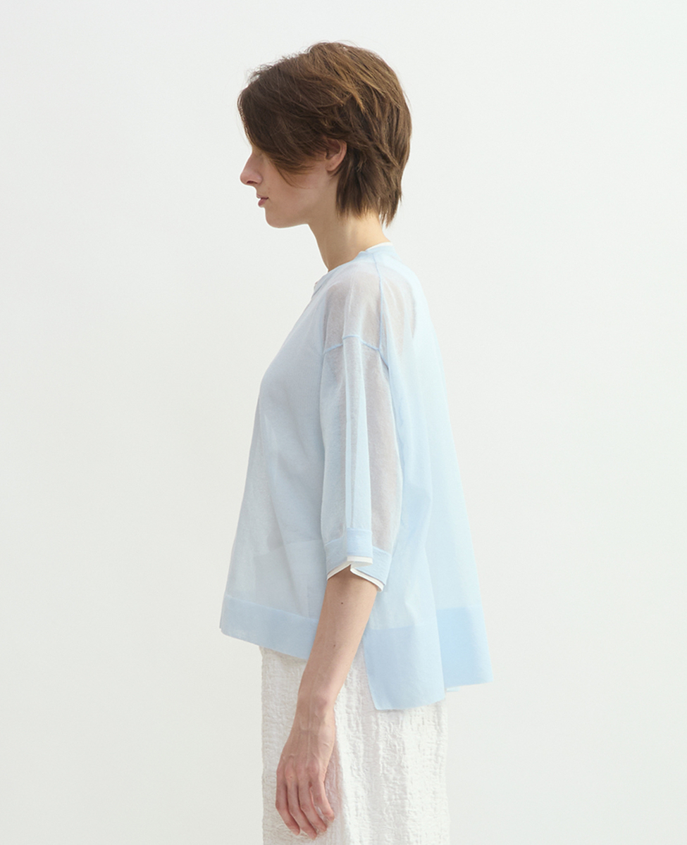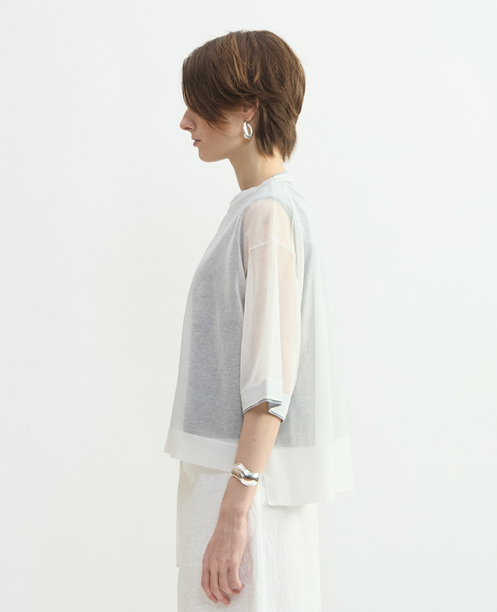 オーガニックコットンとリサイクルポリエステルを合わせ、ハリを持たせた極細番手の糸を使用しています。美しい透け感と清涼感を持ち、暑い時期までさらりとお召しいただけます。Tシャツ型のプルオーバーは、カジュアル過ぎない印象です。身幅やそで幅は広めに設定し、着丈を短めにしています。「ムラ糸アーサー天竺/SUVINノースリーブTシャツ(A1561UTS445)」をインナーにしたレイヤードが可能です。