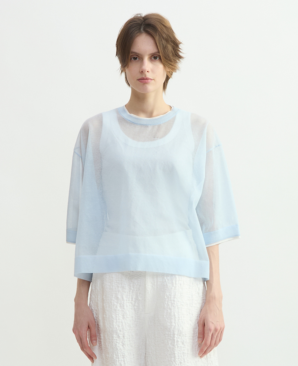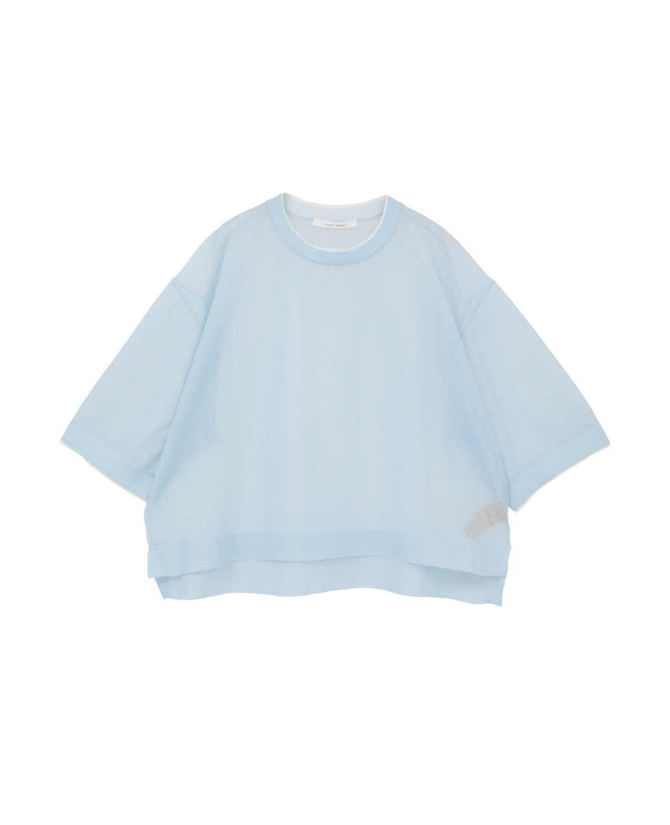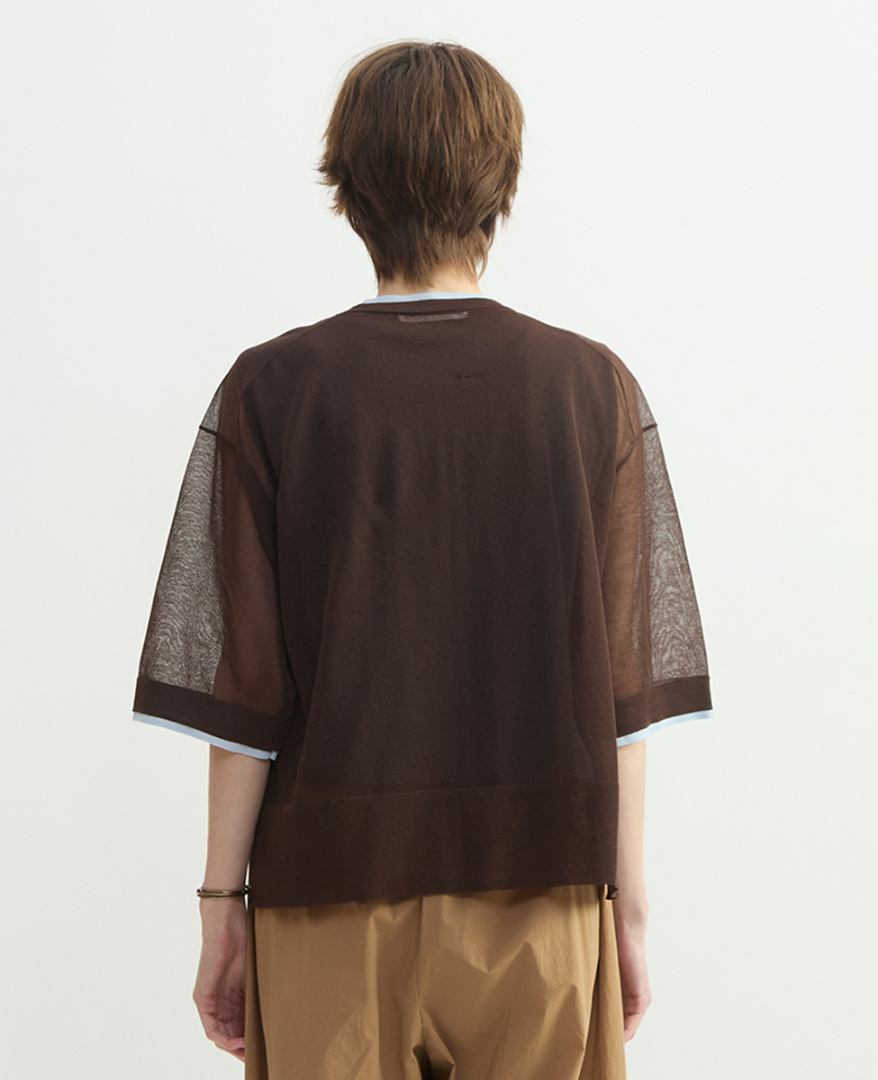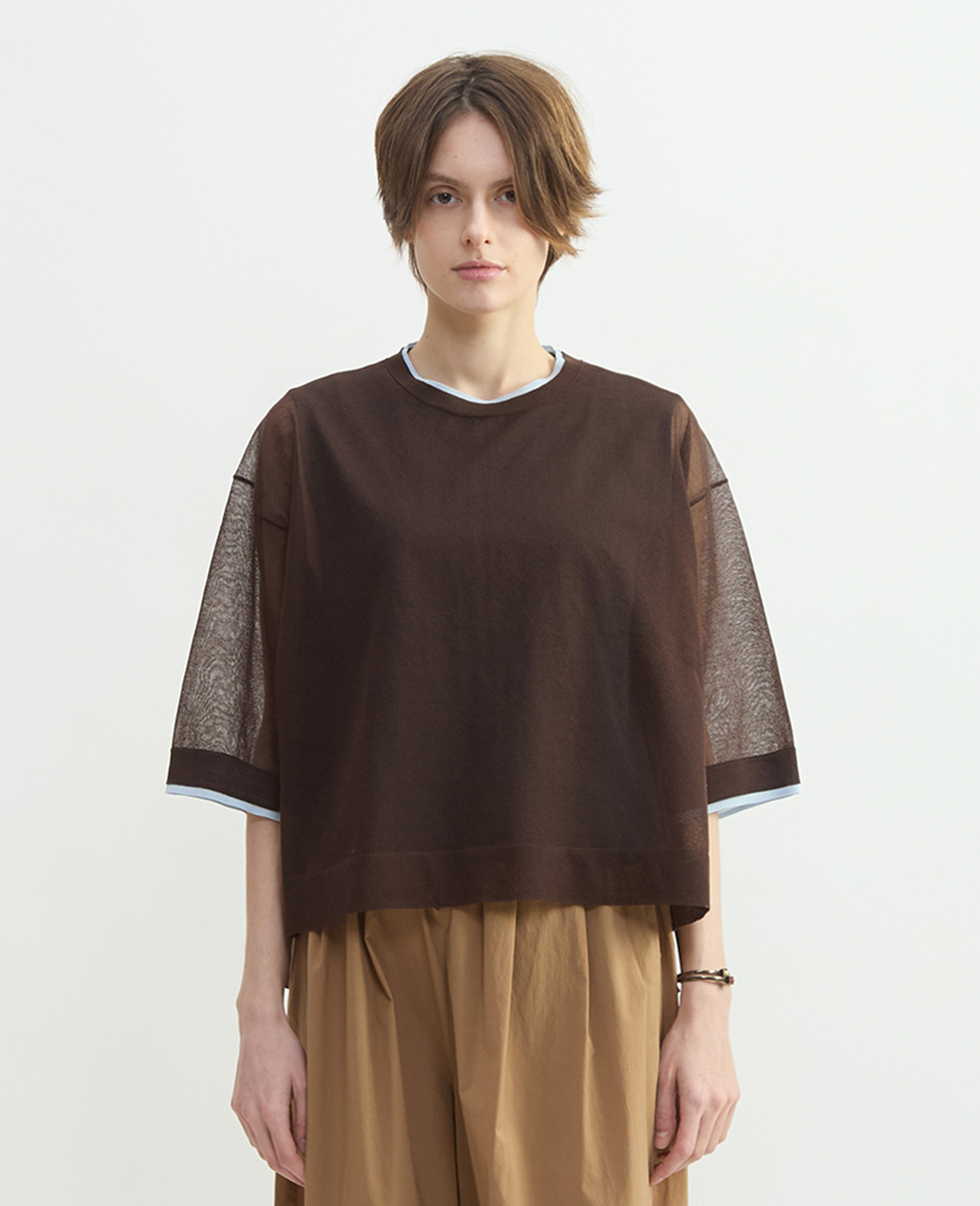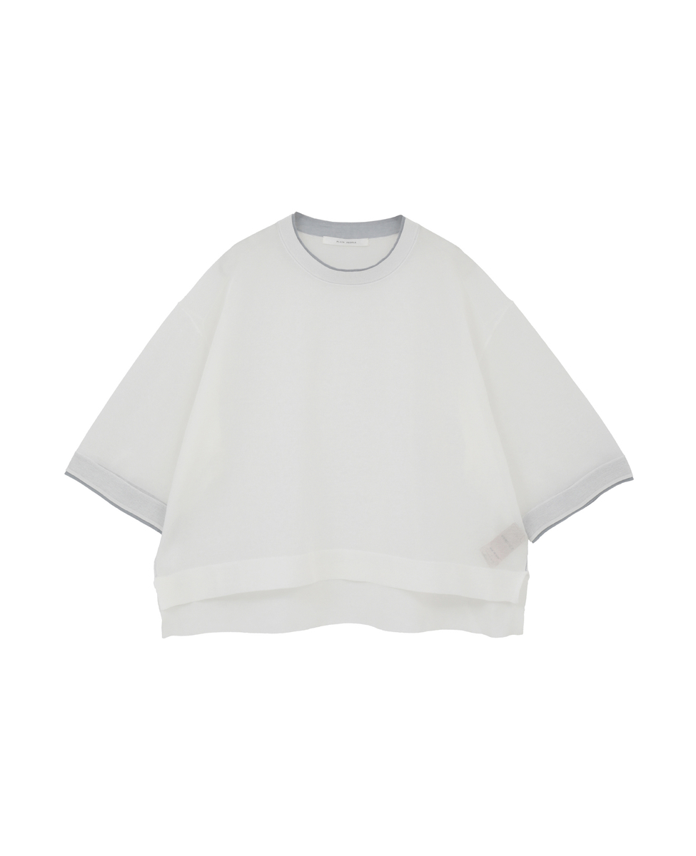 オーガニックコットンとリサイクルポリエステルを合わせ、ハリを持たせた極細番手の糸を使用しています。美しい透け感と清涼感を持ち、暑い時期までさらりとお召しいただけます。Tシャツ型のプルオーバーは、カジュアル過ぎない印象です。身幅やそで幅は広めに設定し、着丈を短めにしています。「ムラ糸アーサー天竺/SUVINノースリーブTシャツ(A1561UTS445)」をインナーにしたレイヤードが可能です。