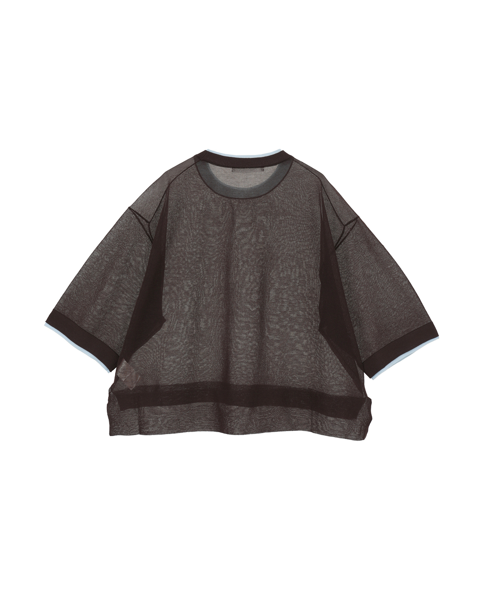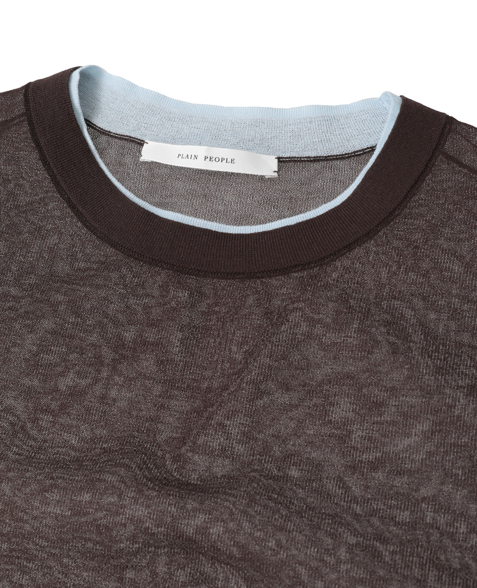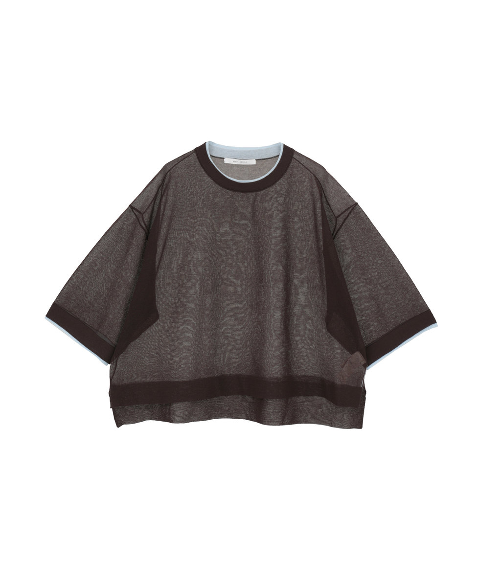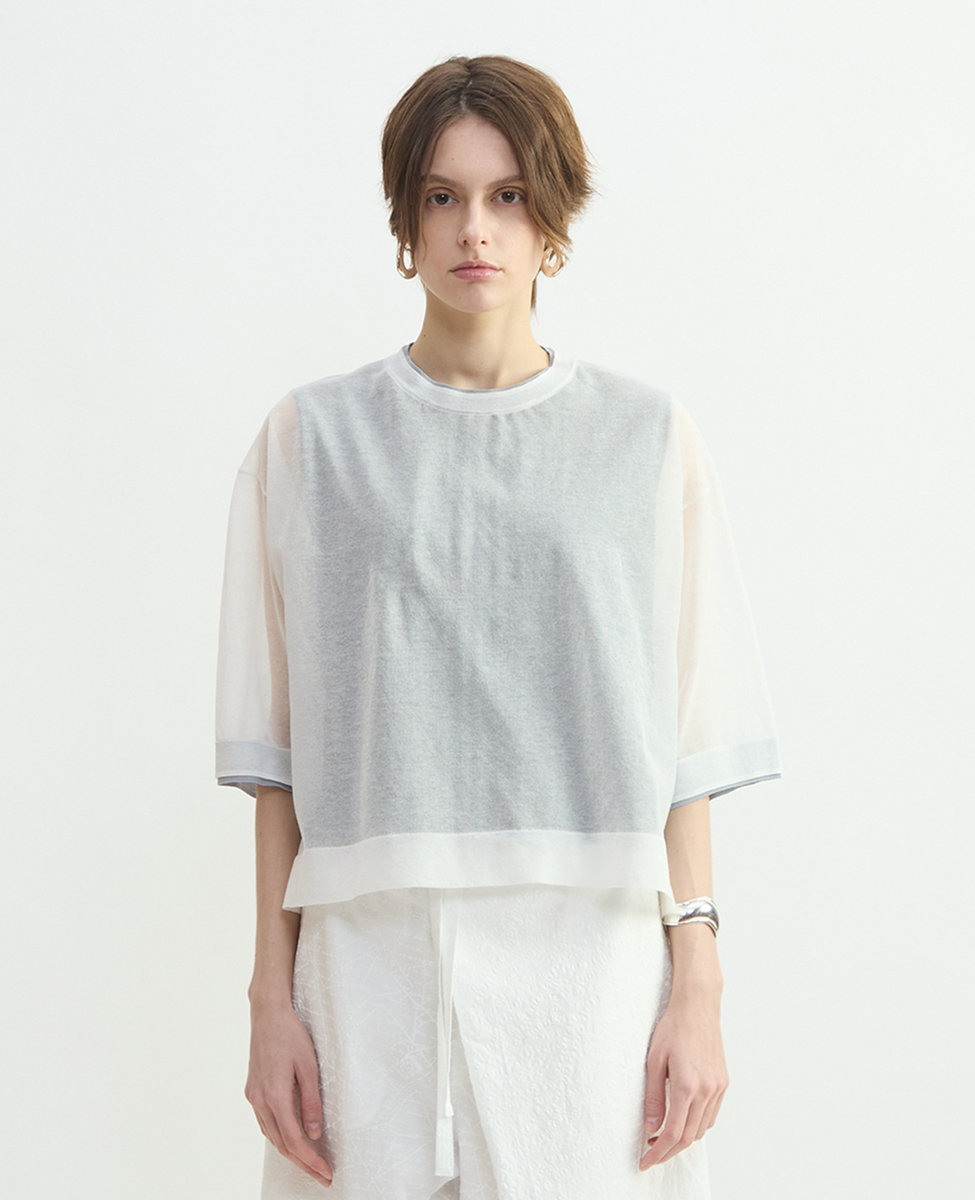 オーガニックコットンとリサイクルポリエステルを合わせ、ハリを持たせた極細番手の糸を使用しています。美しい透け感と清涼感を持ち、暑い時期までさらりとお召しいただけます。Tシャツ型のプルオーバーは、カジュアル過ぎない印象です。身幅やそで幅は広めに設定し、着丈を短めにしています。「ムラ糸アーサー天竺/SUVINノースリーブTシャツ(A1561UTS445)」をインナーにしたレイヤードが可能です。