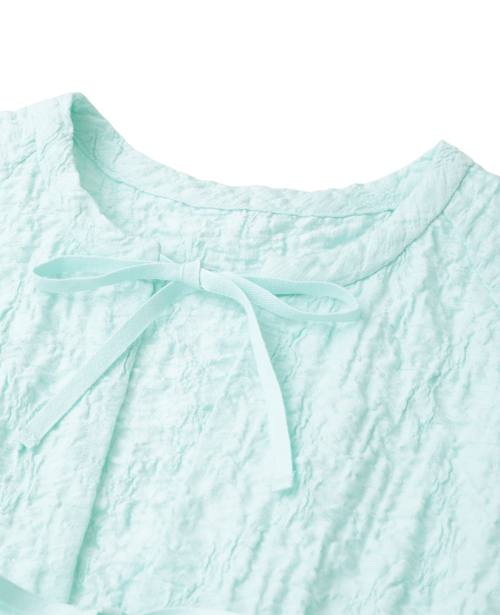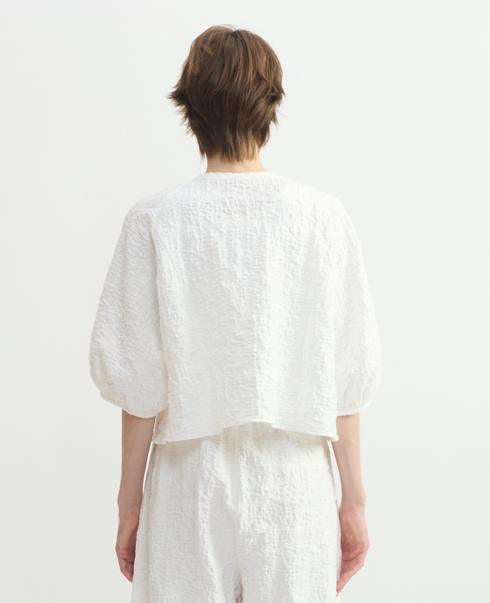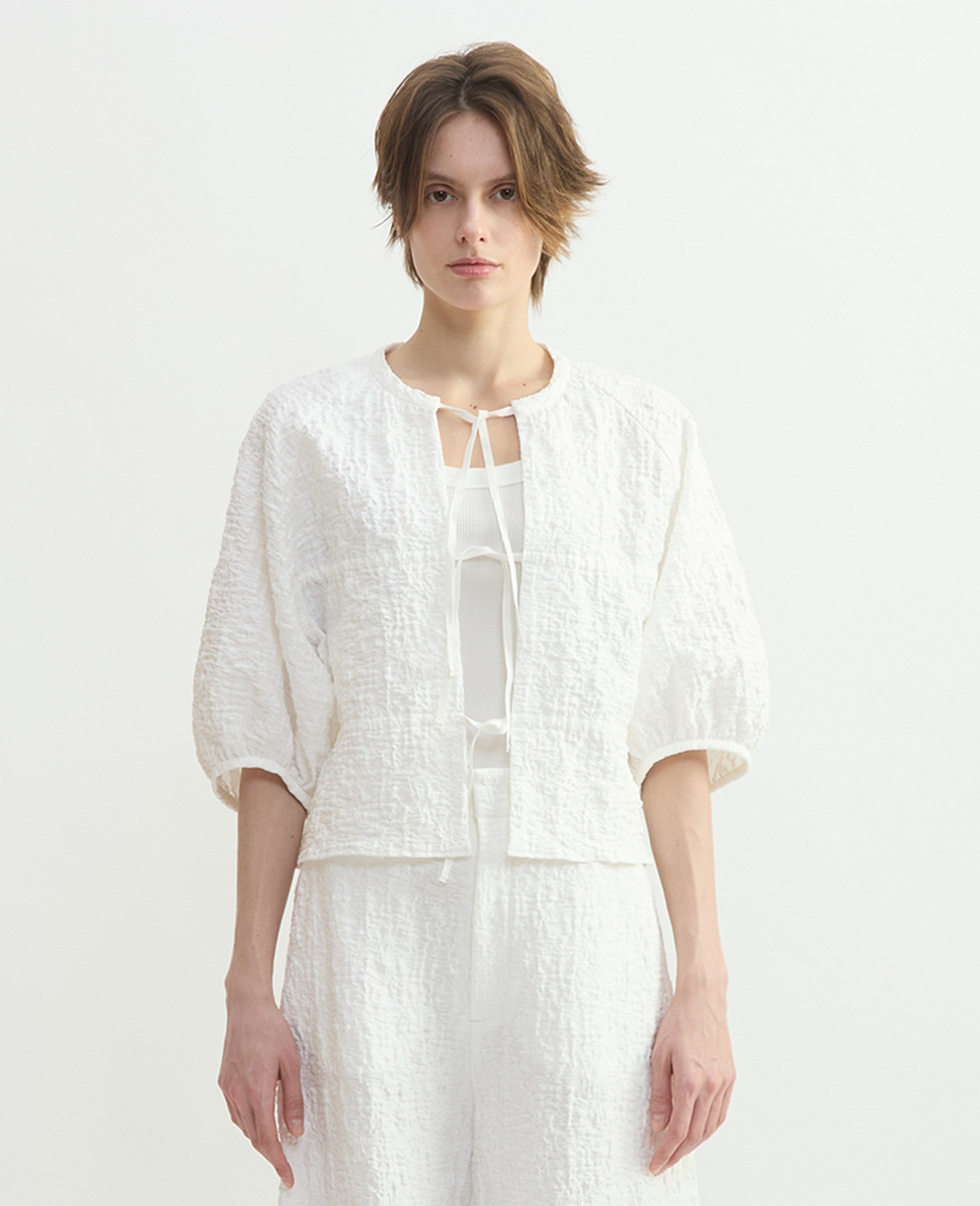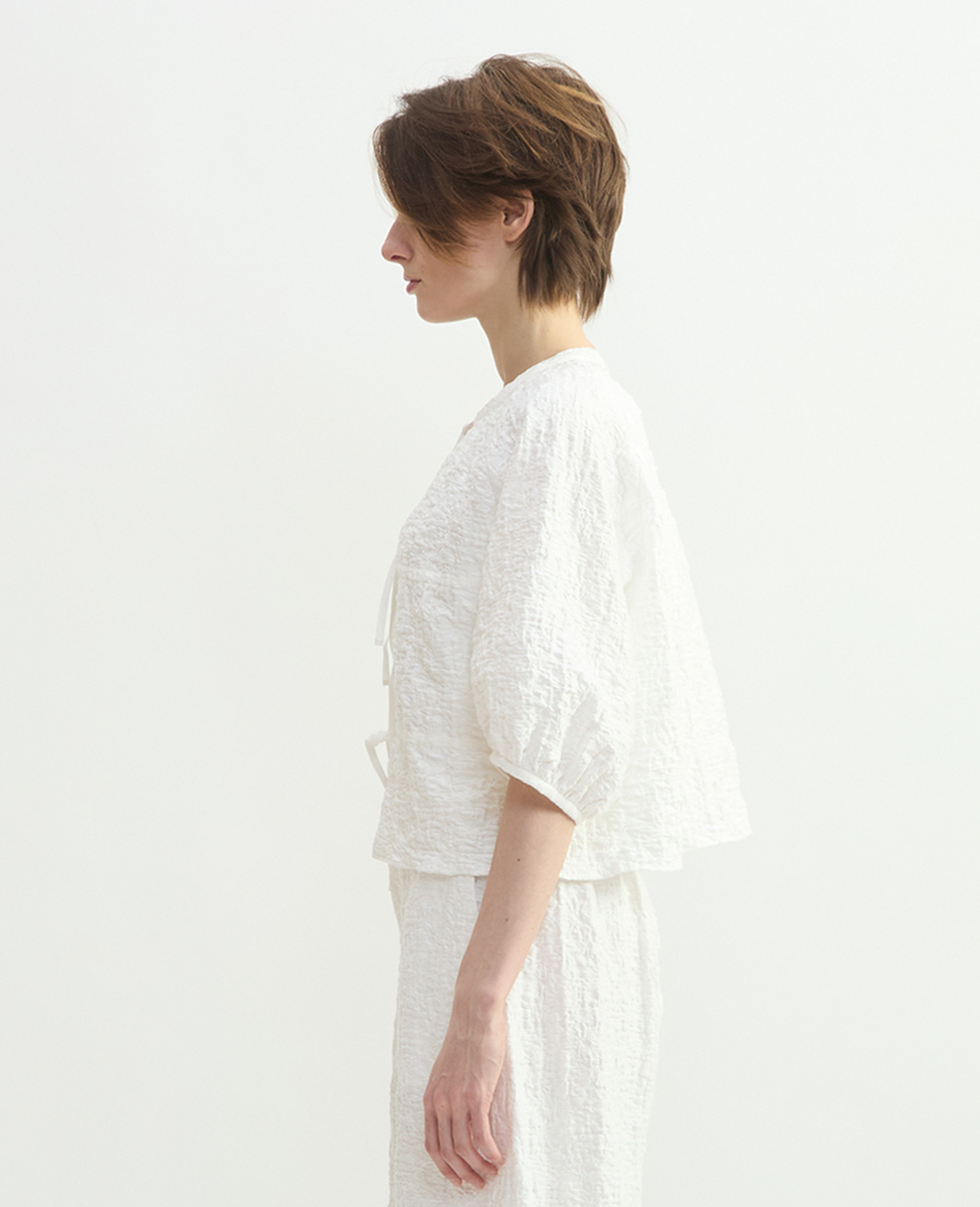 洗練されたラスティックな風合いが魅力のジャガードジャージ。ポリウレタンの収縮により、立体的なシワを生み出しています。ドローストリングディテールがポイントの五分袖のブラウスです。フロントのリボンを結ばず、羽織りとしてもお召しいただけます。