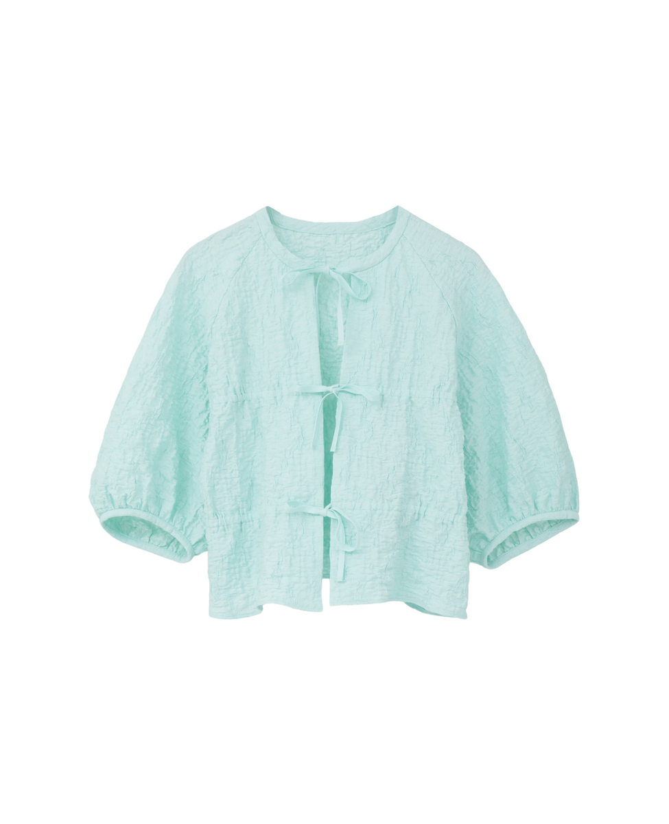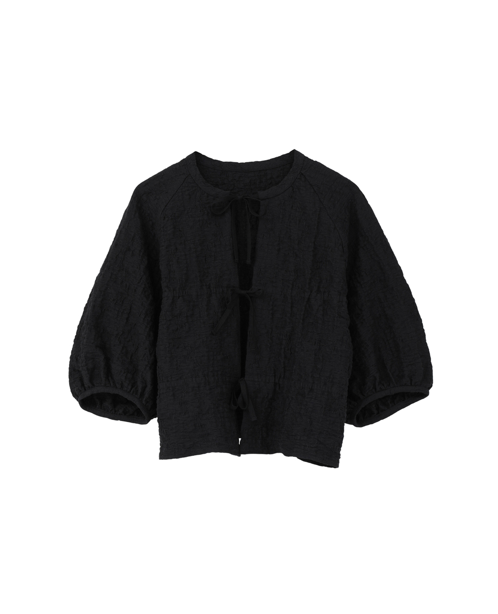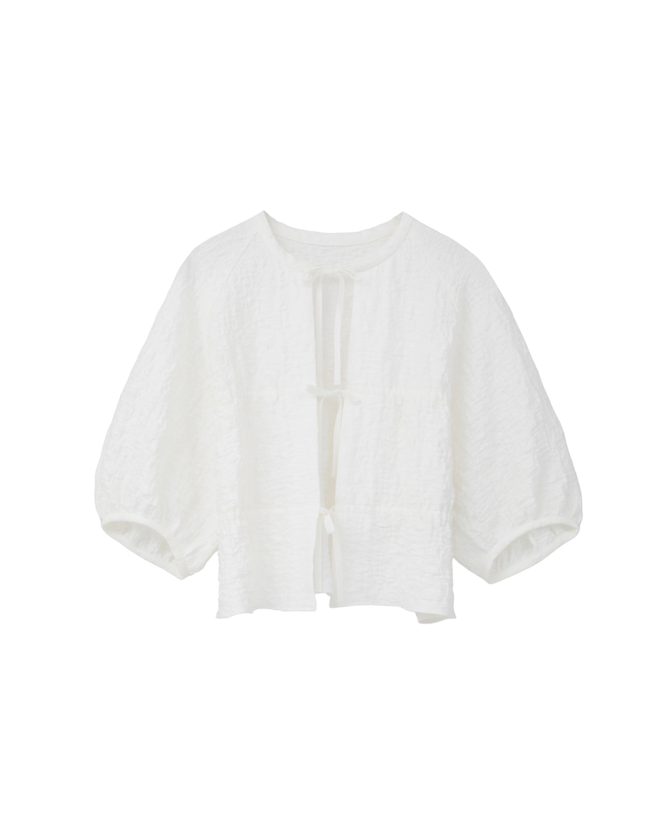 洗練されたラスティックな風合いが魅力のジャガードジャージ。ポリウレタンの収縮により、立体的なシワを生み出しています。ドローストリングディテールがポイントの五分袖のブラウスです。フロントのリボンを結ばず、羽織りとしてもお召しいただけます。