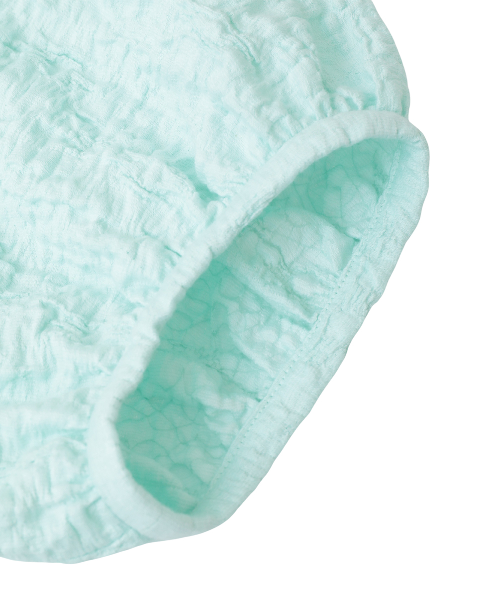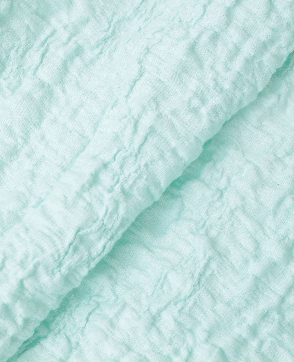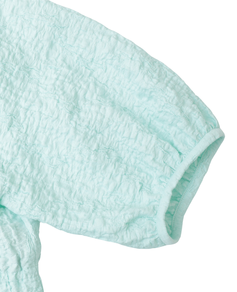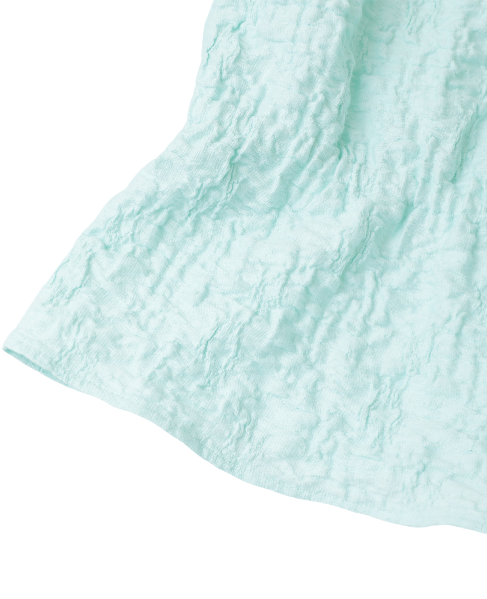洗練されたラスティックな風合いが魅力のジャガードジャージ。ポリウレタンの収縮により、立体的なシワを生み出しています。ドローストリングディテールがポイントの五分袖のブラウスです。フロントのリボンを結ばず、羽織りとしてもお召しいただけます。
