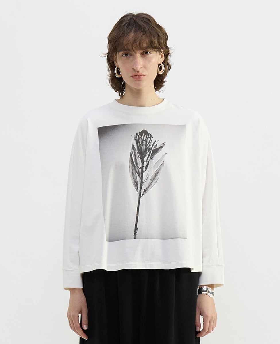 透けの気にならないコットン100%ジャージを使用したドルマン型Tシャツ。フロントには、押し花をインスピレーション元にした写真プリントデザインを配置。アートを纏っているかの様なスタイリングの要になります。写真の花は南アフリカ原産のプロテアという植物。ギリシャ神話の変幻自在な海の神、プロテウスに由来。