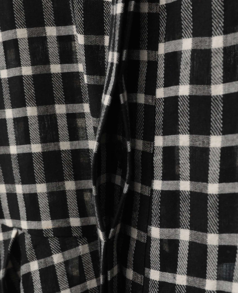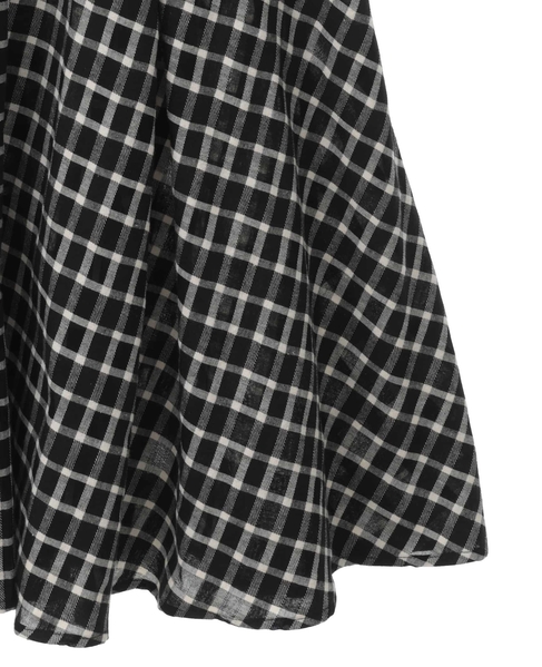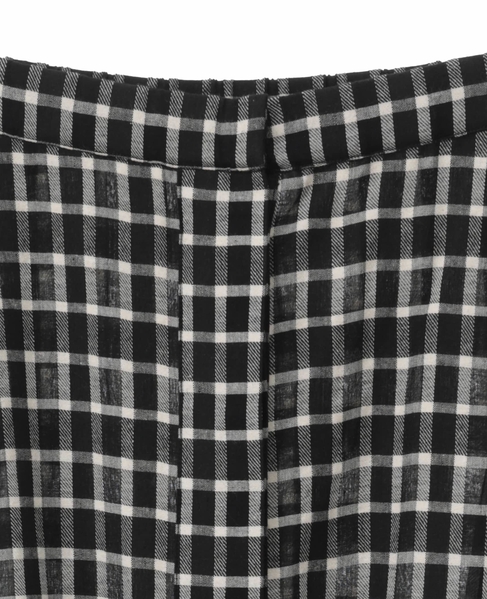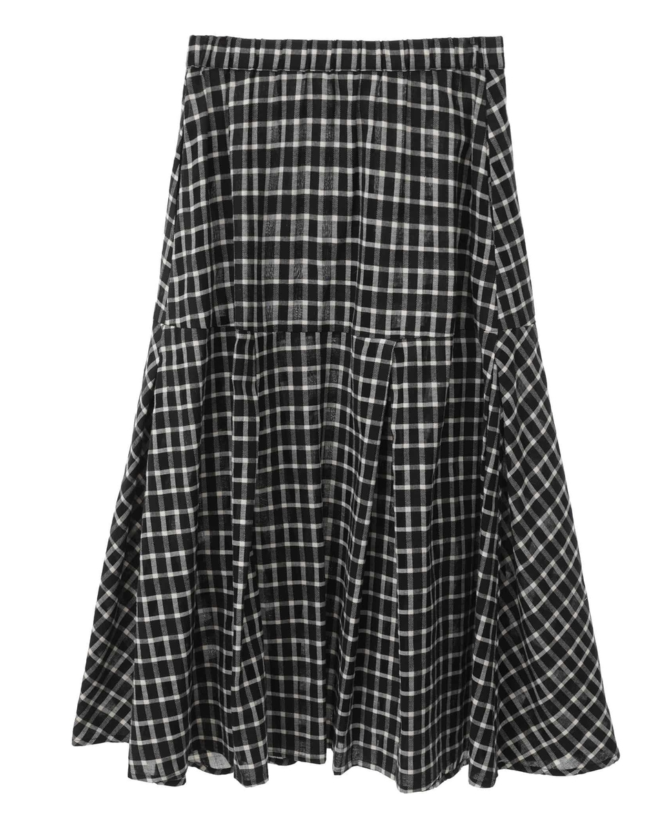 切り替えからタックフレアーを施したチェック柄のスカート。ややハリ感がありながらも軽く、後ろウエストゴムでリラクシーな穿き心地が魅力の一枚。