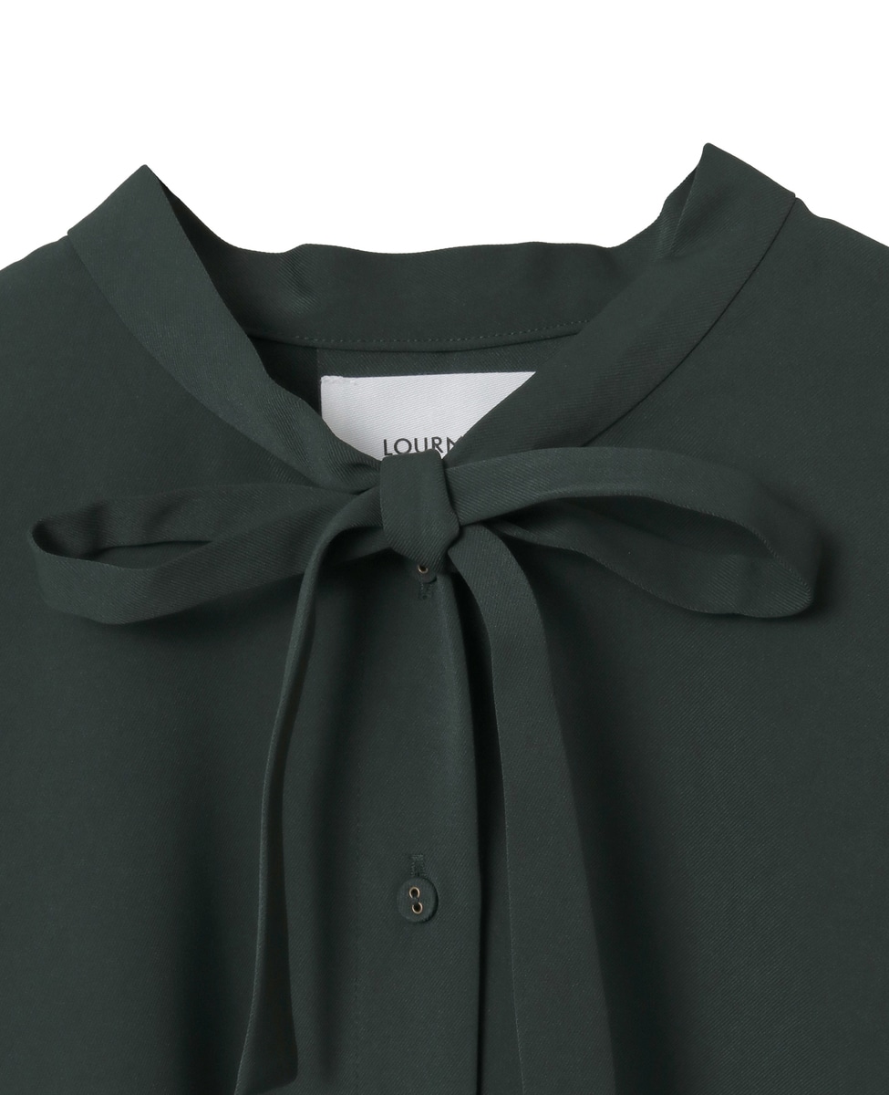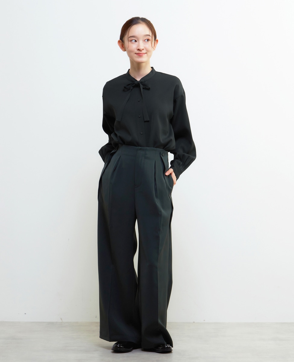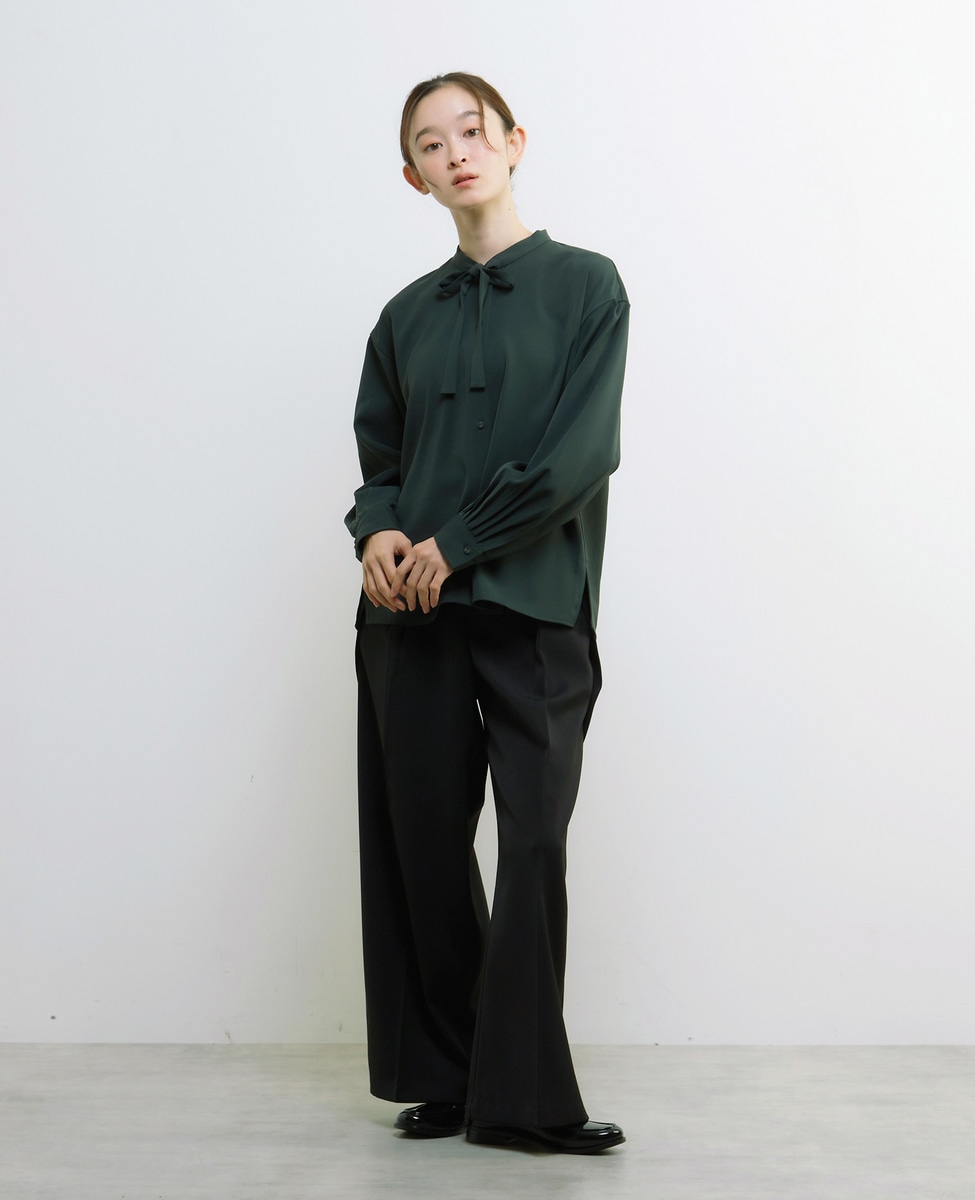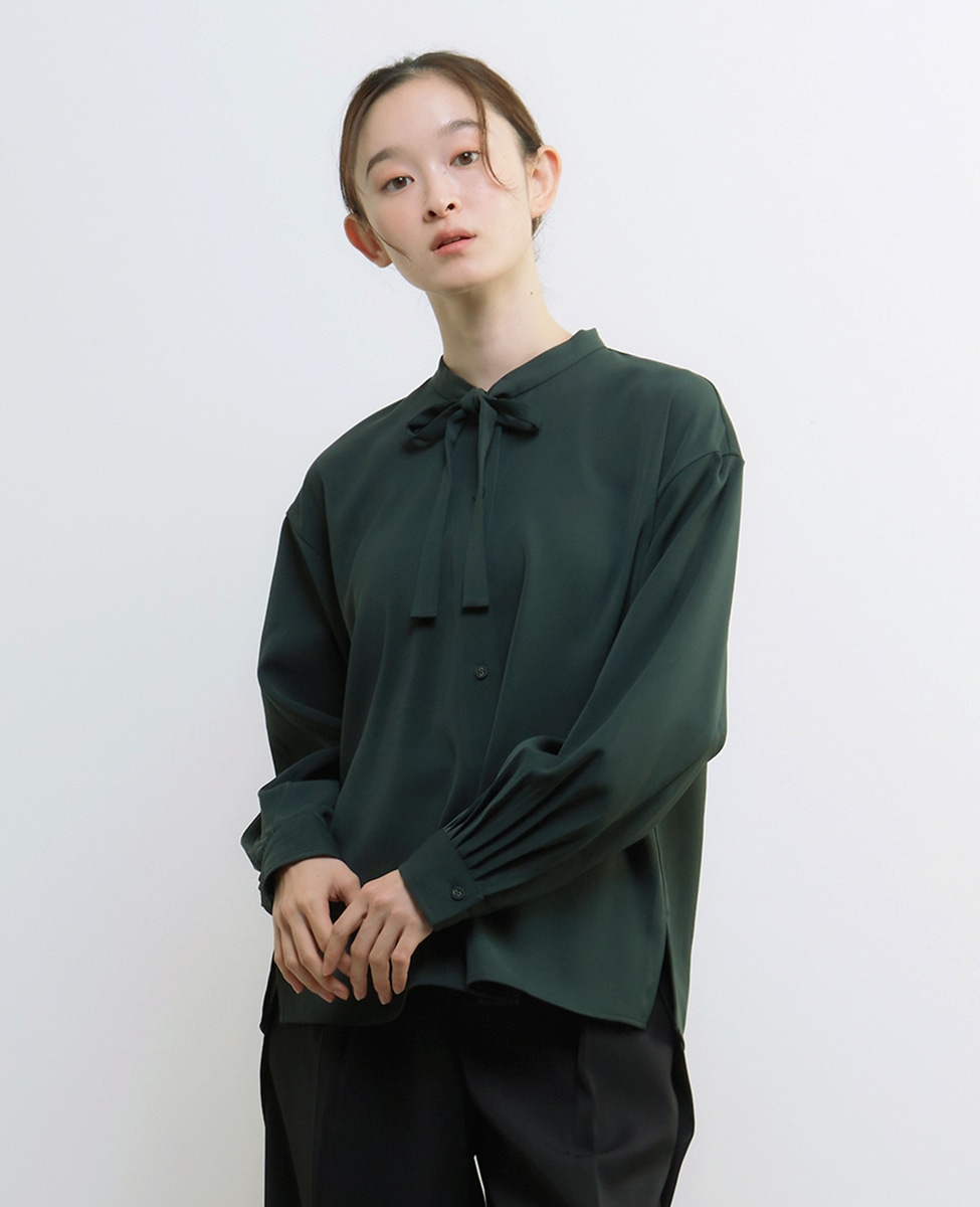 しなやかな落ち感のあるポリエステル二重織を使用したボウタイブラウス。