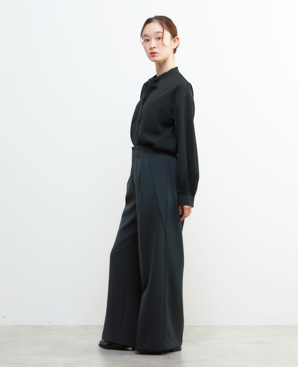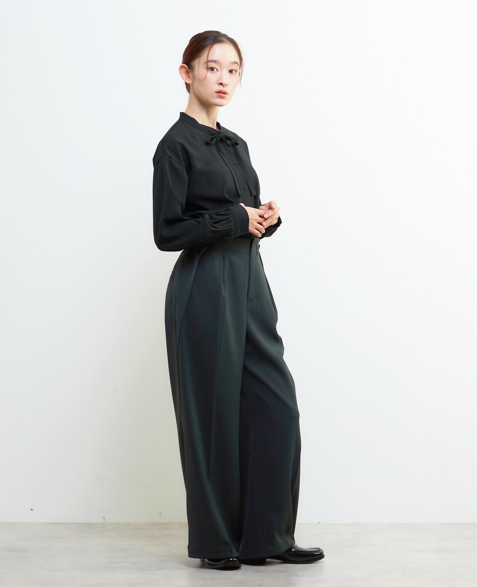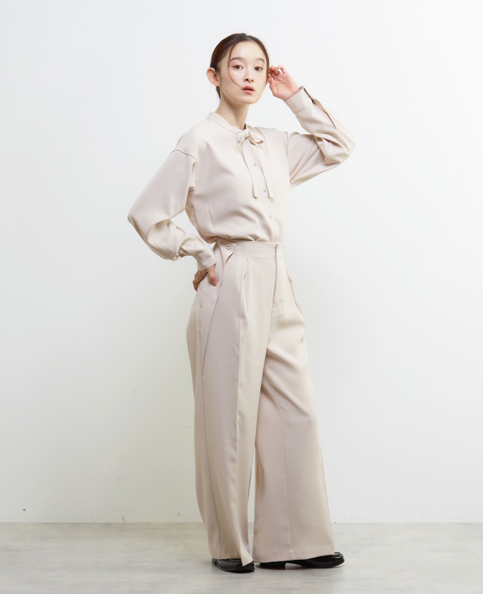 しなやかな落ち感のあるポリエステル二重織を使用したボウタイブラウス。