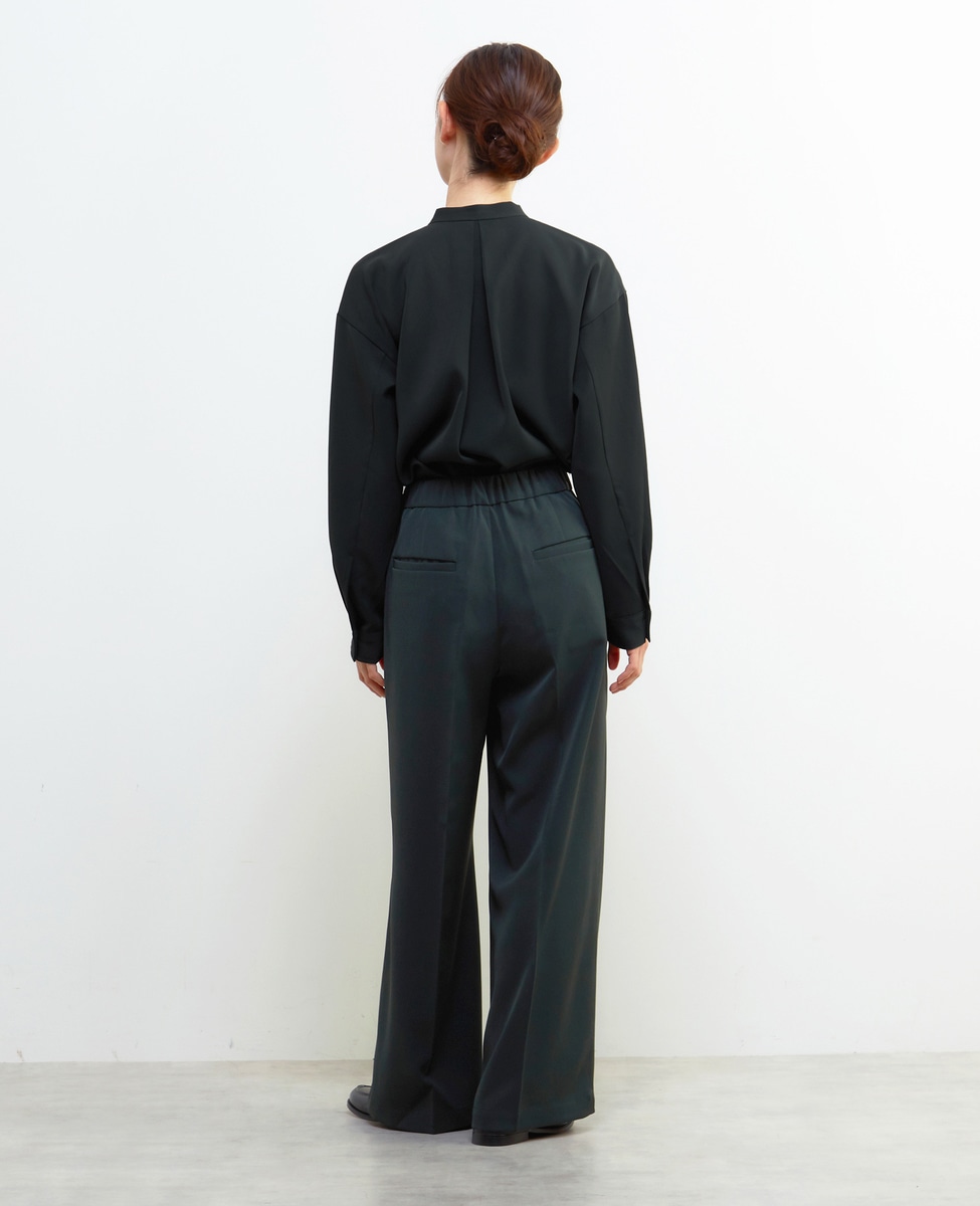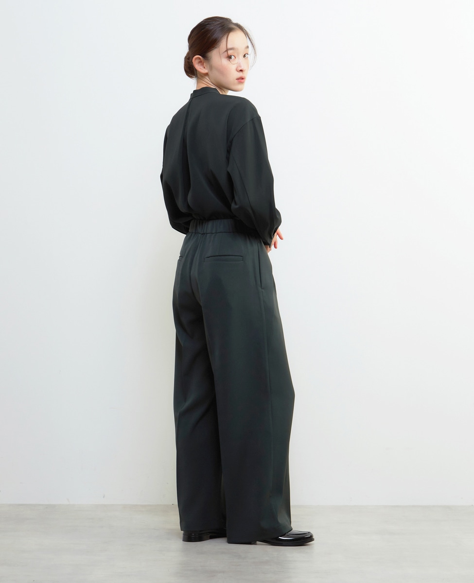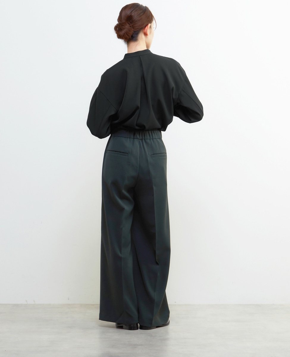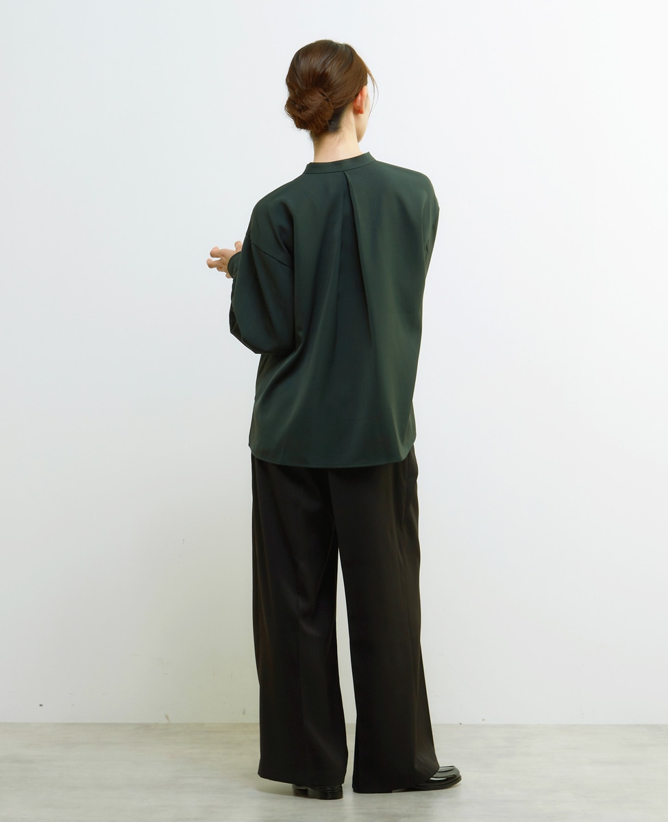 しなやかな落ち感のあるポリエステル二重織を使用したボウタイブラウス。
