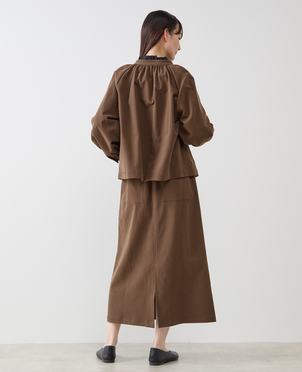 生地表面にピーチ加工を施したツイルストレッチ。ソフトな肌触りとしなやかさが特徴です。