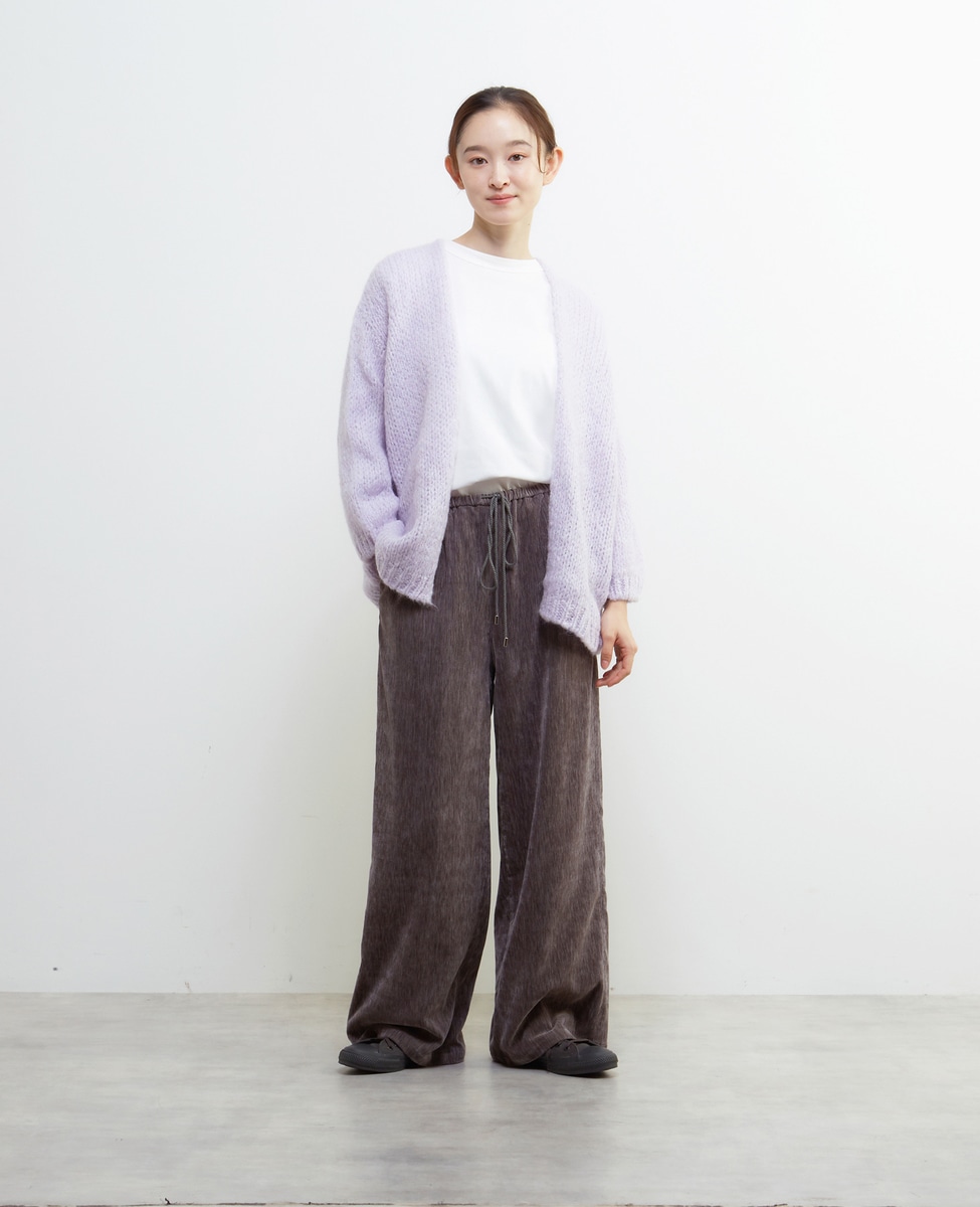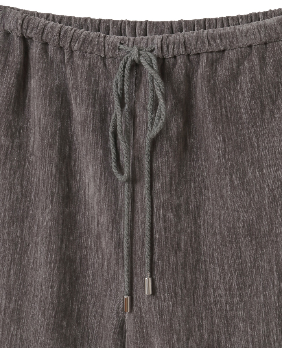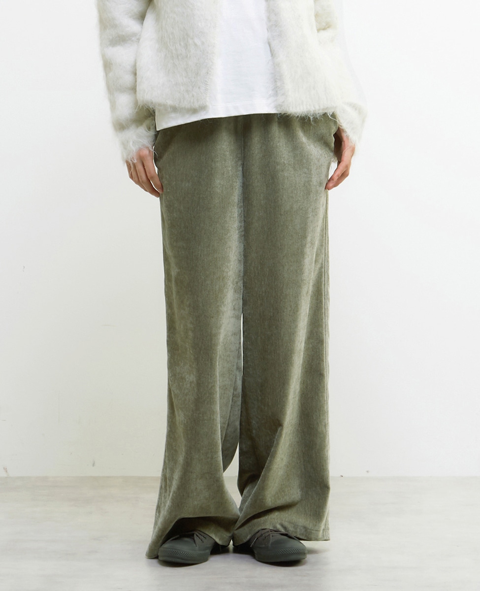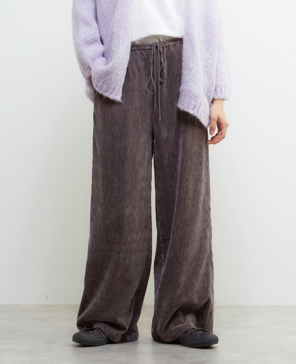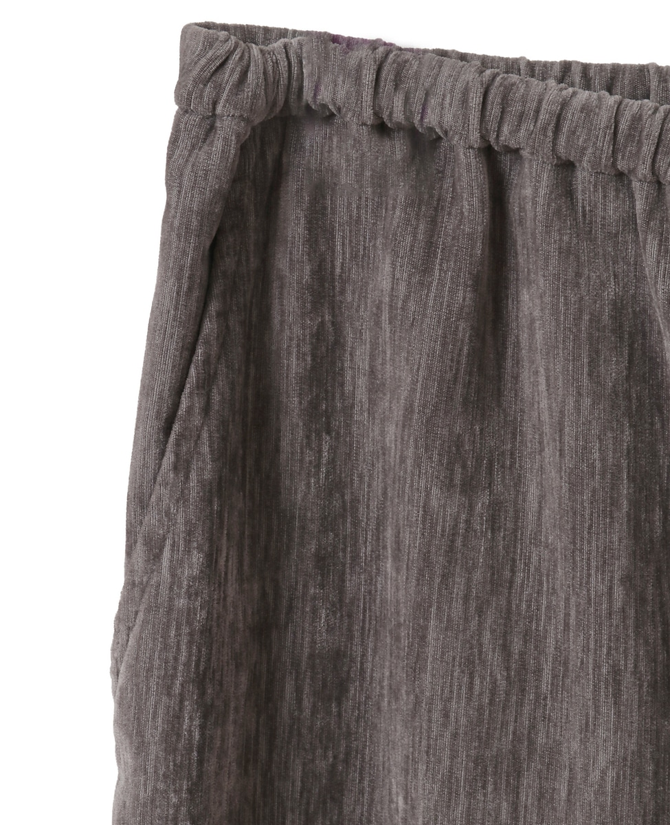 肌触りの柔らかいストレッチベロア素材でお作りしたイージーストレートパンツ。腰回りはスッキリさせ、ひざから下は真っすぐのラインでキレイ見えの一本。ウエストはゴム仕様でリラックス感がありながら、微光沢の素材でキレイ目カジュアルに仕上がった商品です。