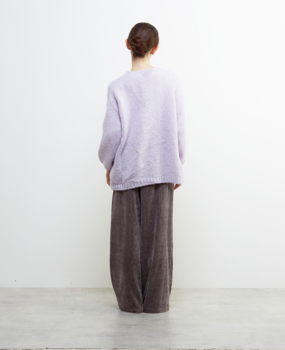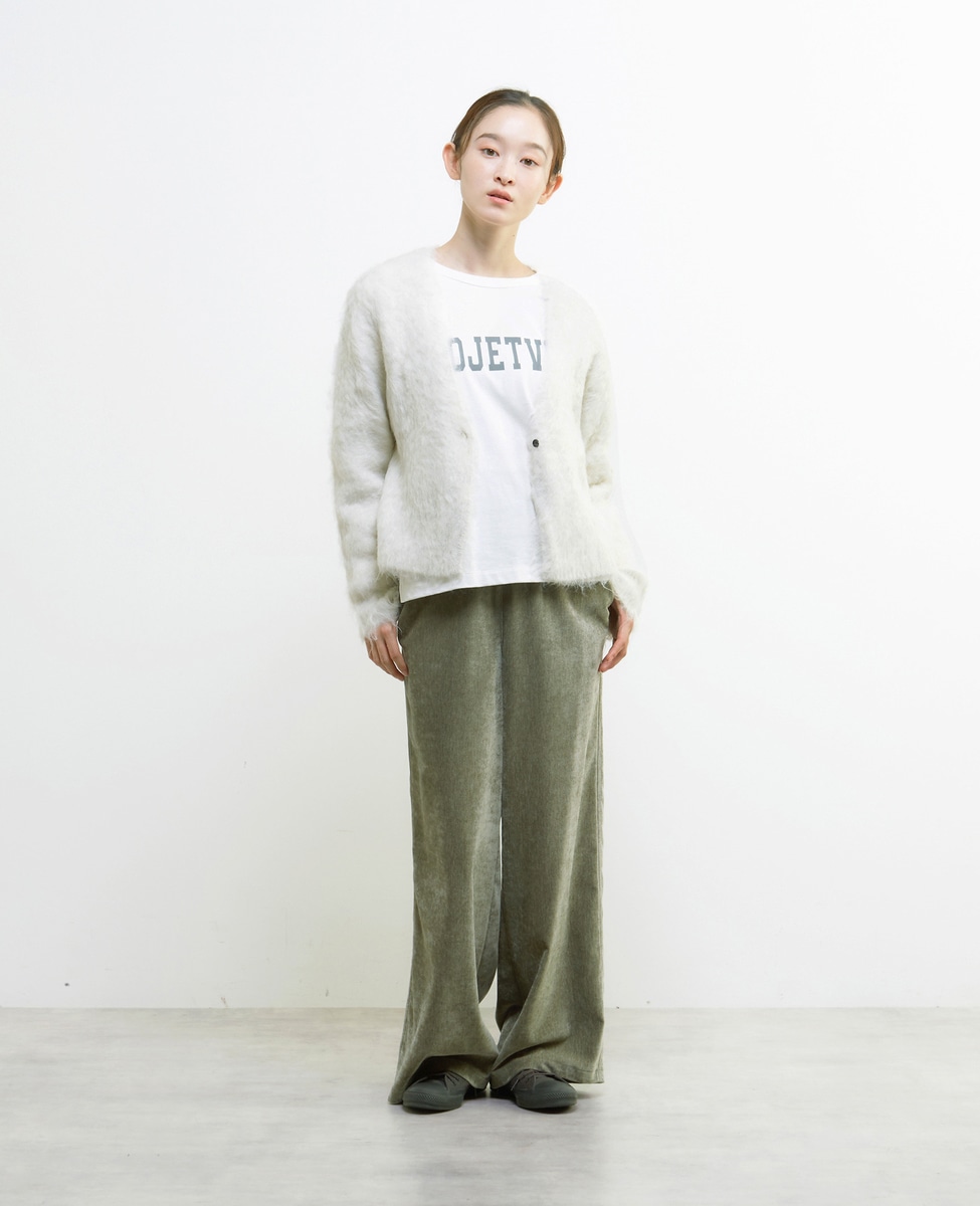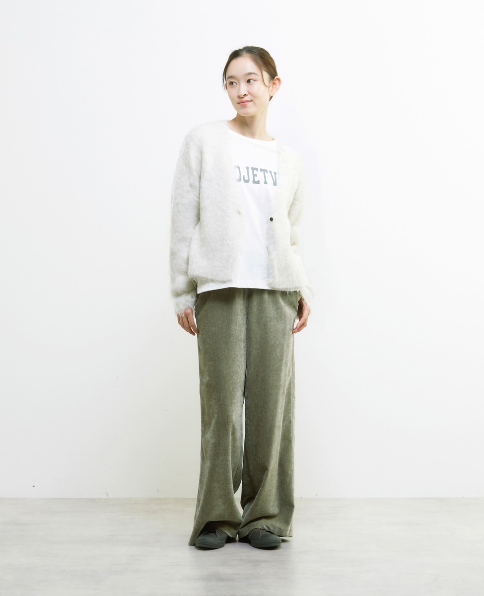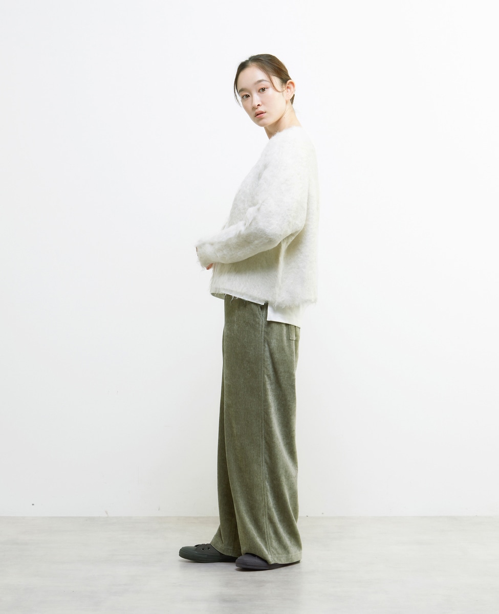 しなやかな肌触りと温かみのある表面感があるストレッチベロア素材。控えめな光沢感なので取り入れやすい素材です。