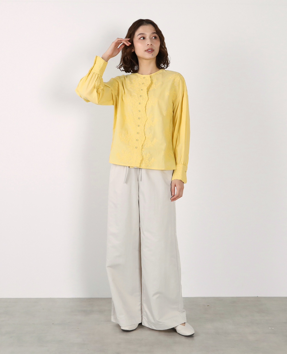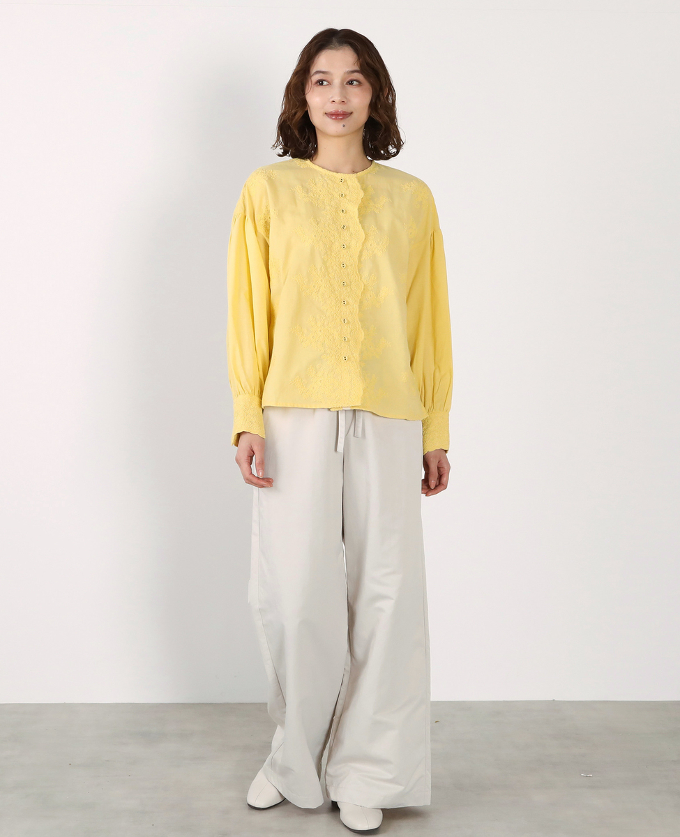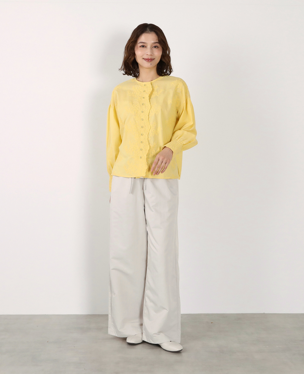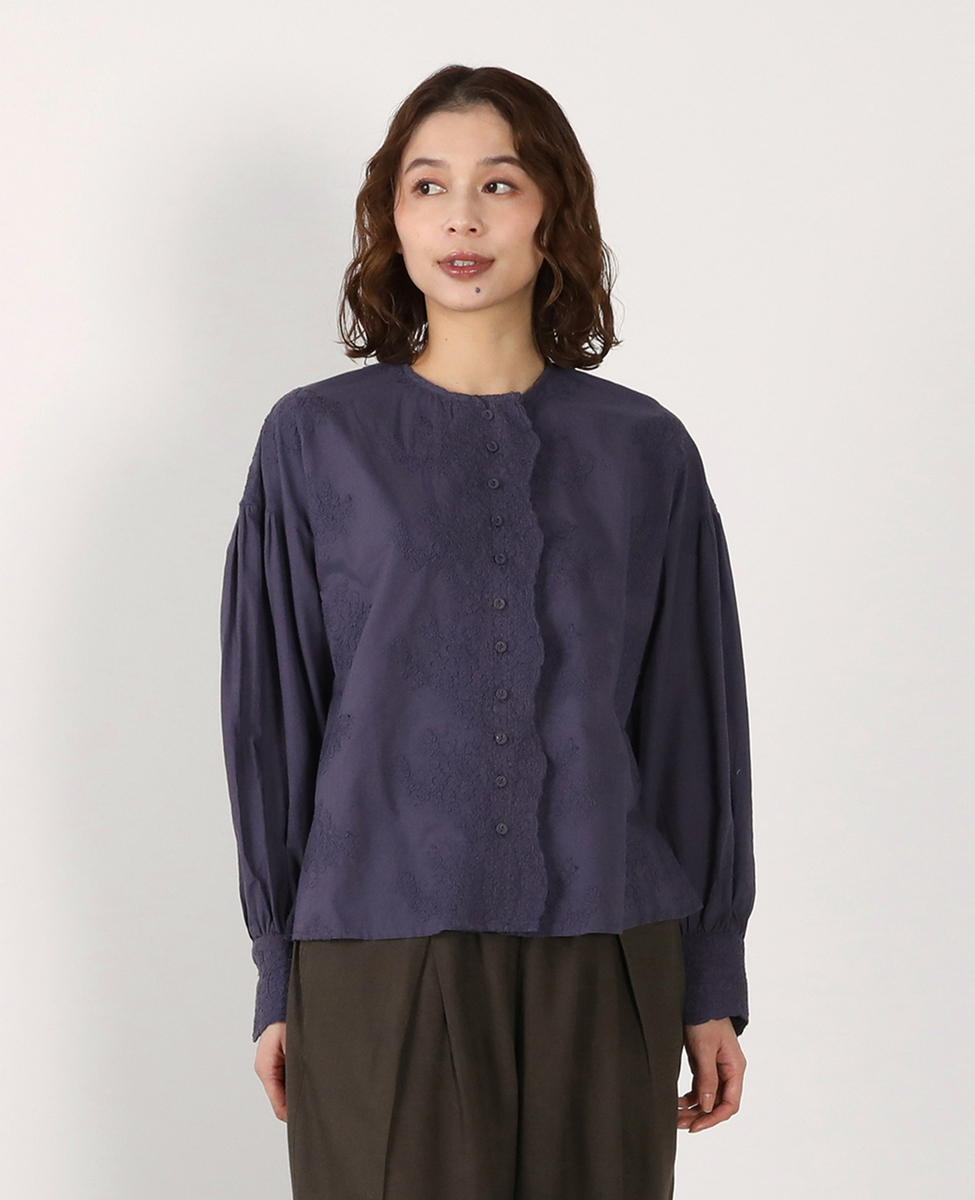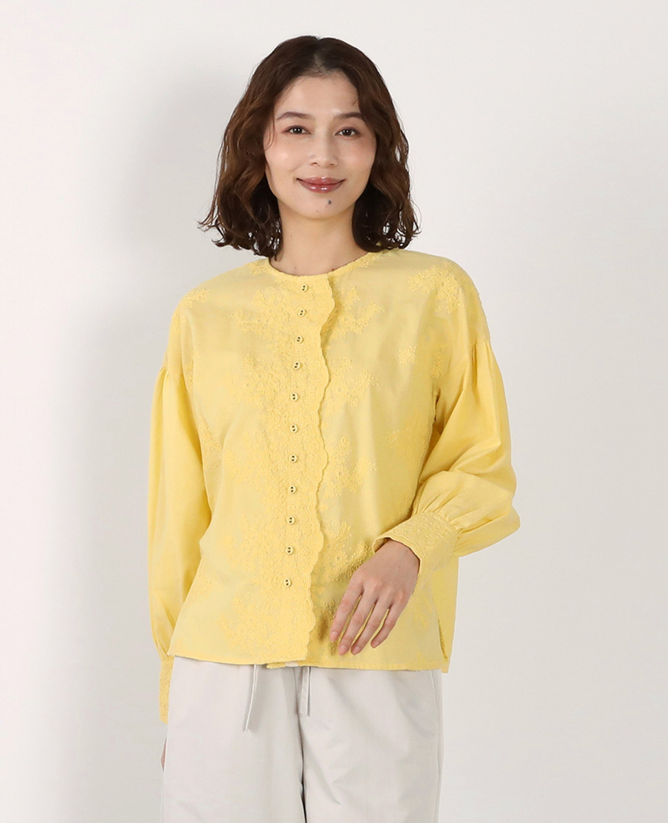 フロントとカフス部分にスカラップ刺しゅうを施した華やかな印象のブラウス。