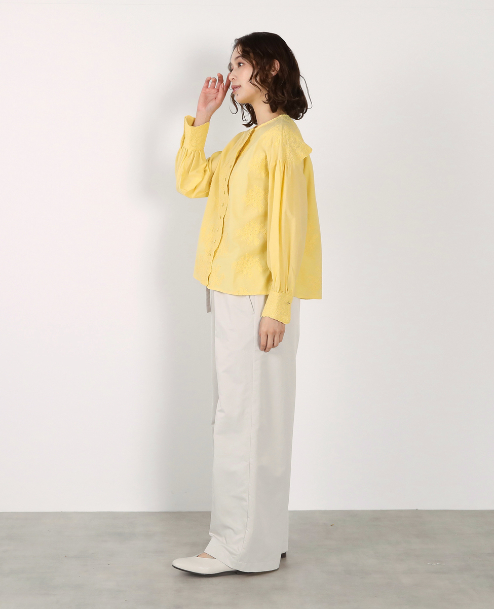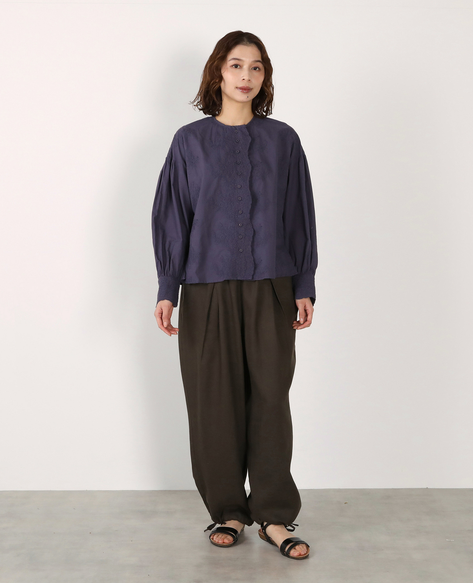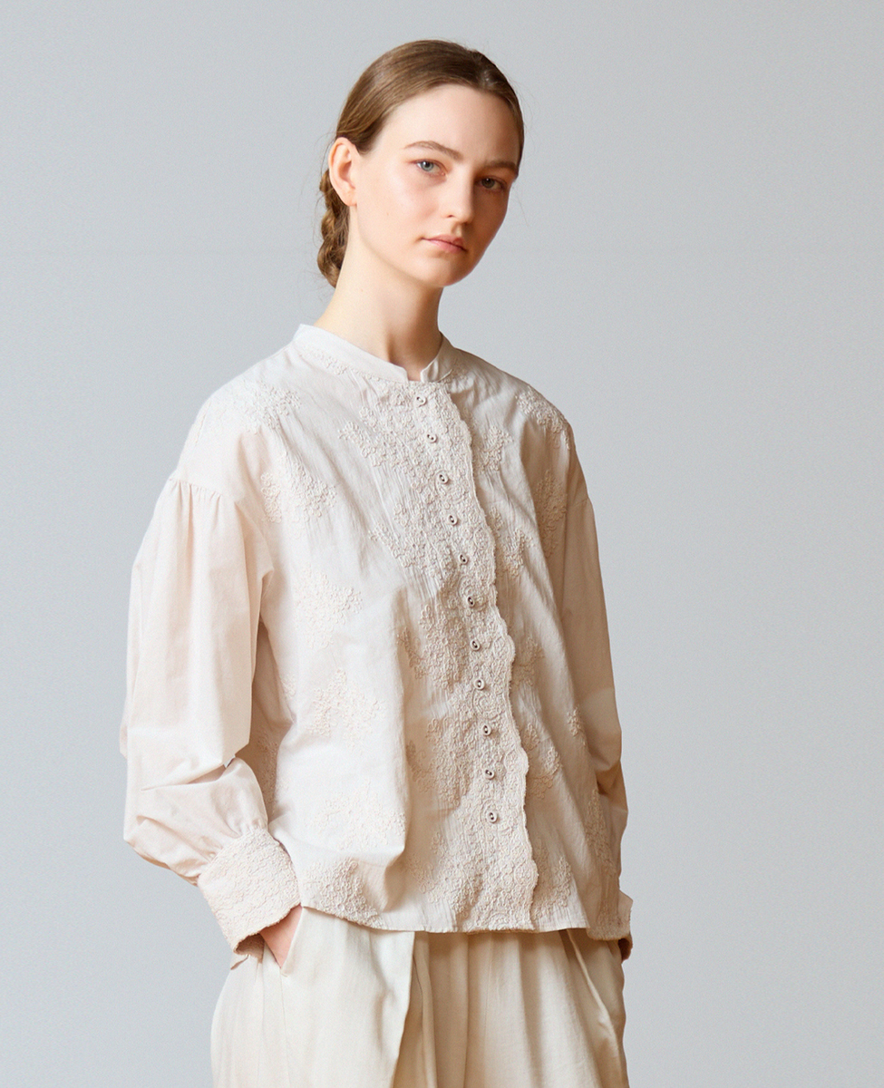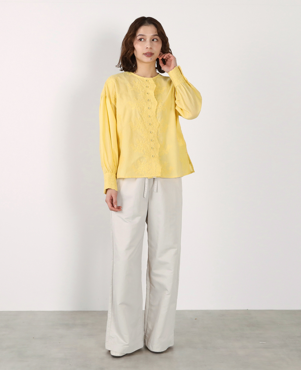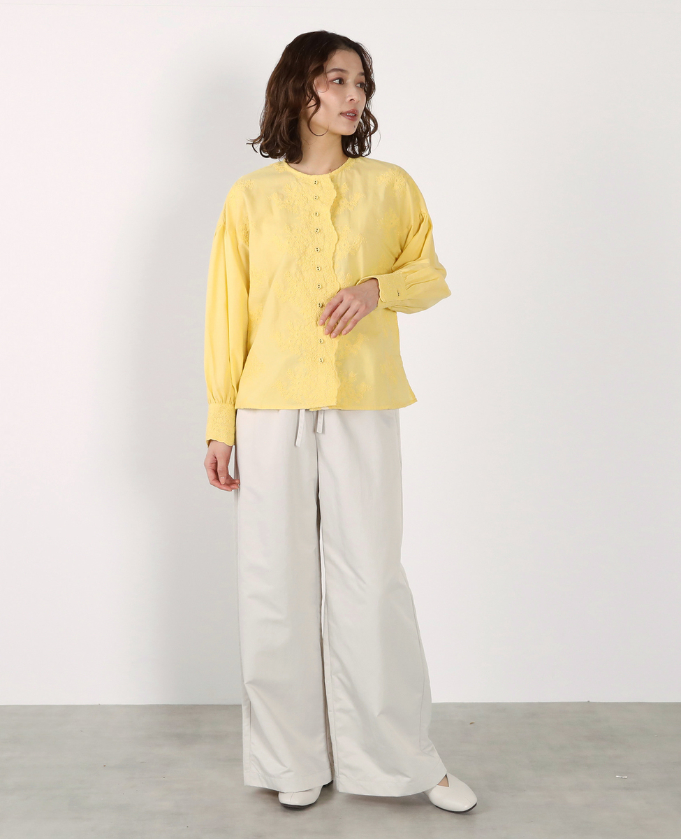 フロントとカフス部分にスカラップ刺しゅうを施した華やかな印象のブラウス。