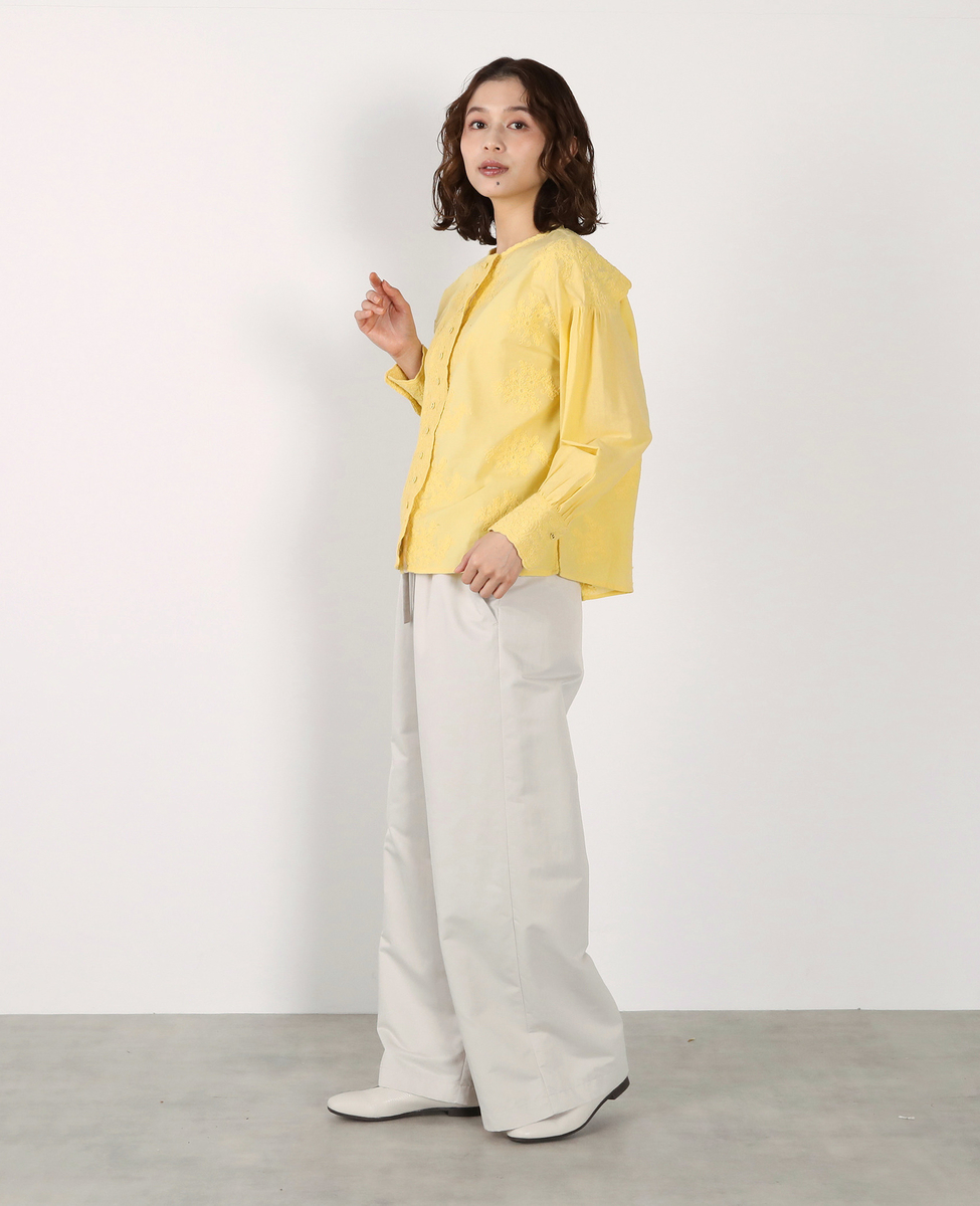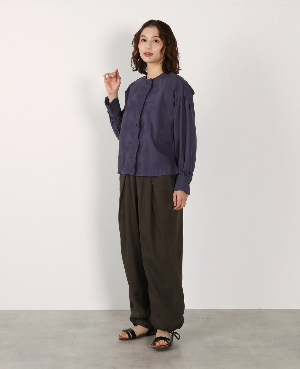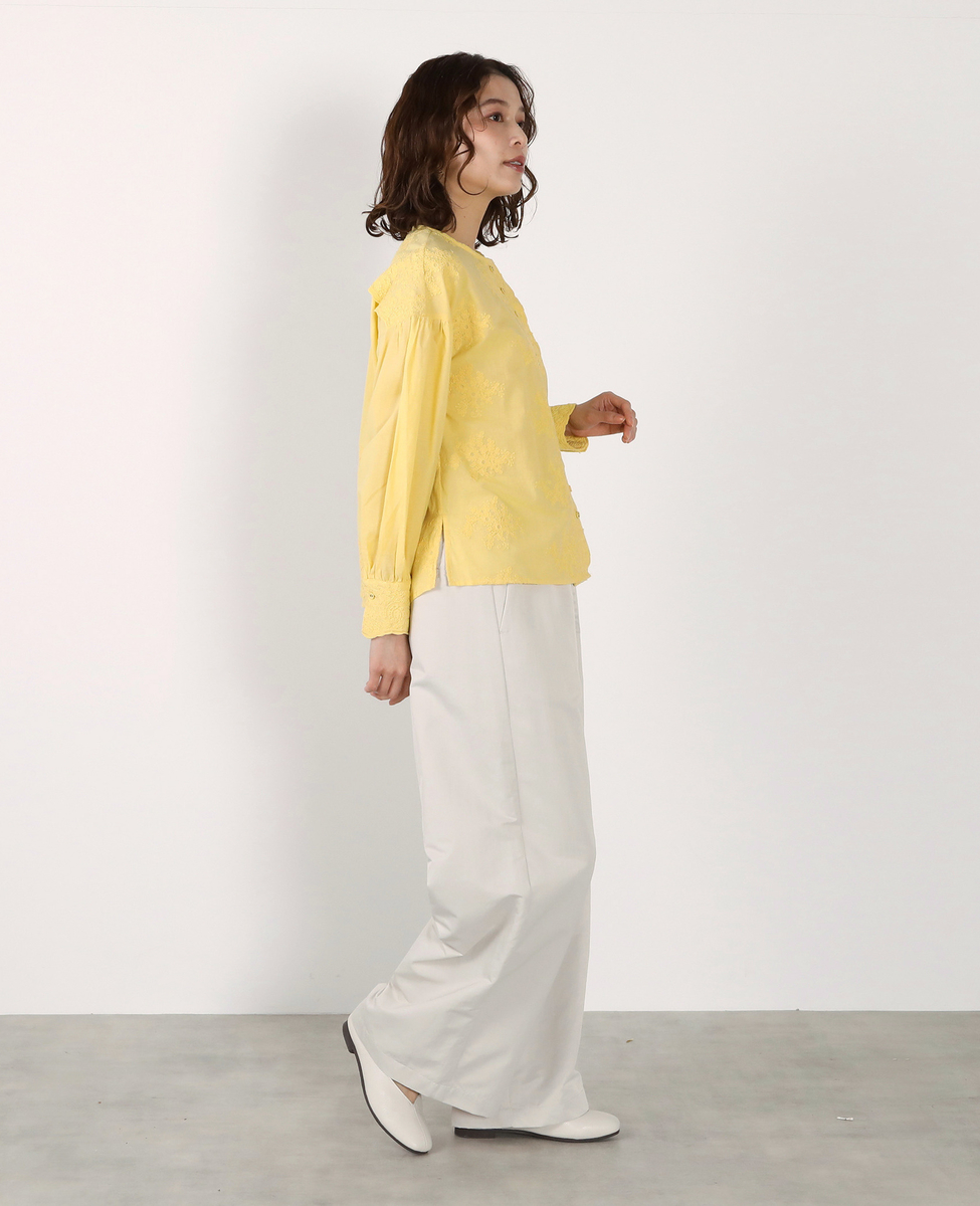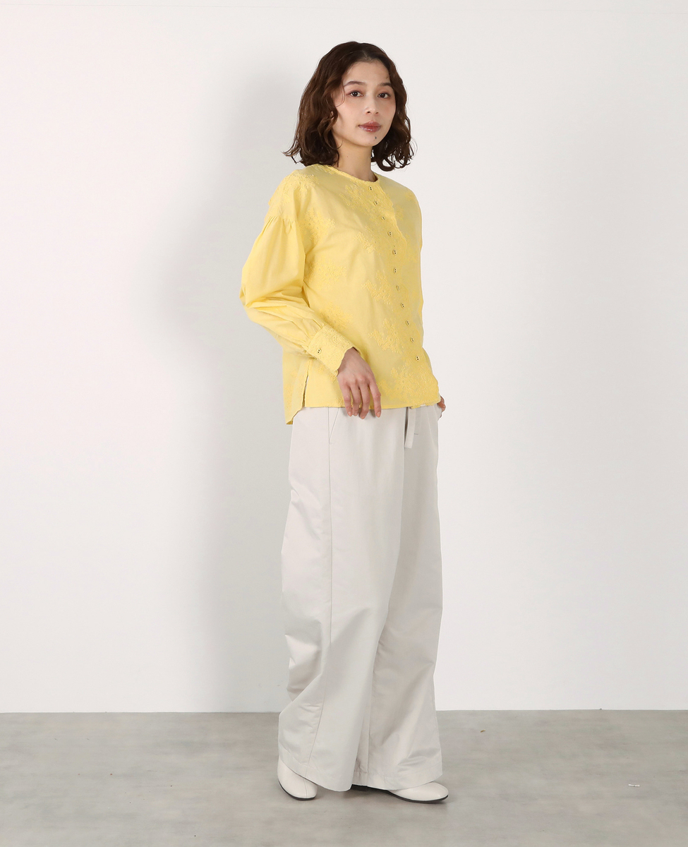 フロントとカフス部分にスカラップ刺しゅうを施した華やかな印象のブラウス。
