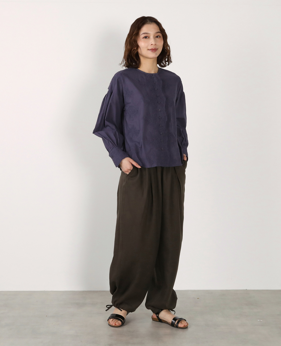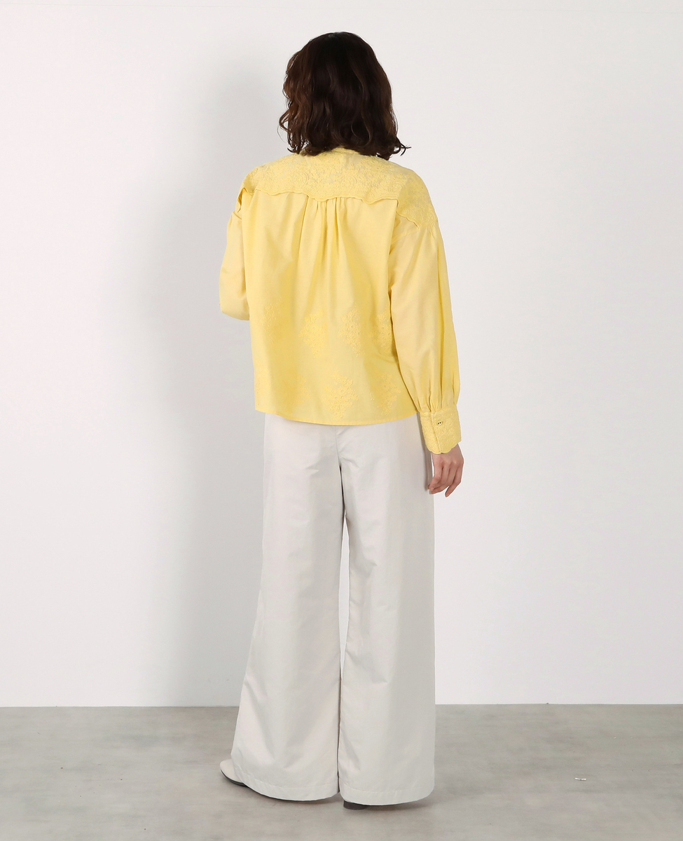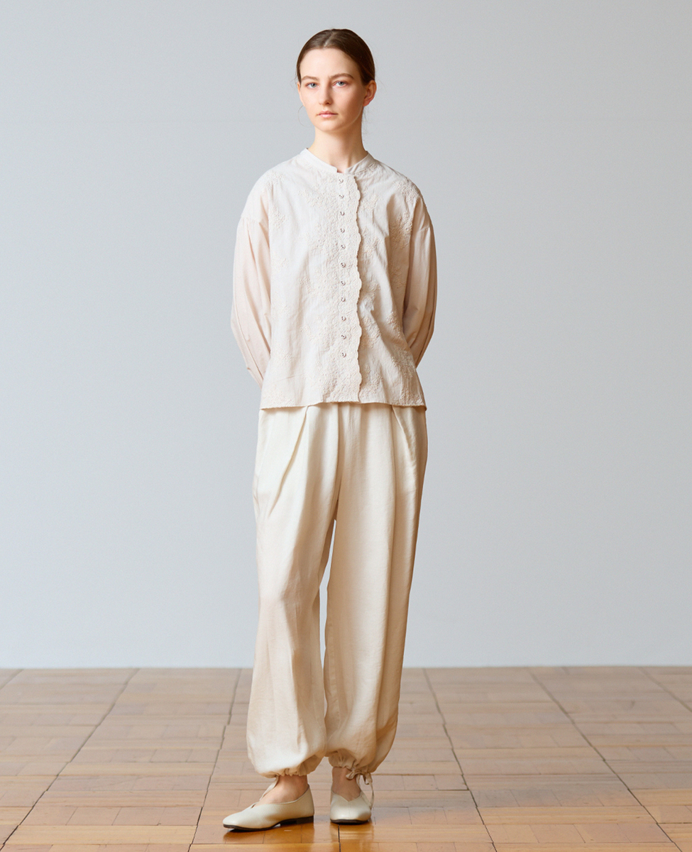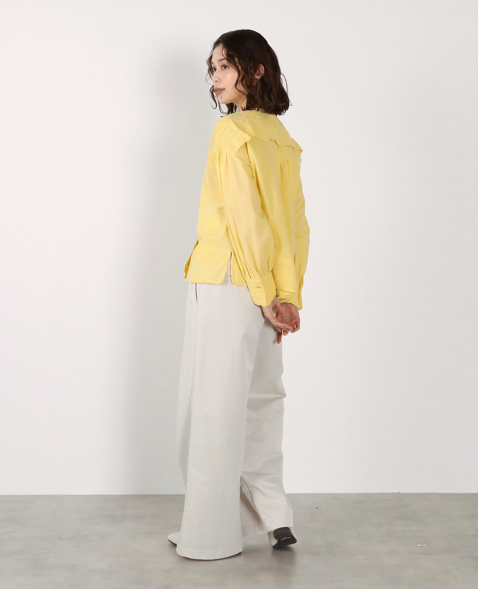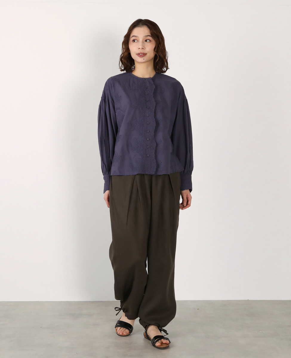 フロントとカフス部分にスカラップ刺しゅうを施した華やかな印象のブラウス。