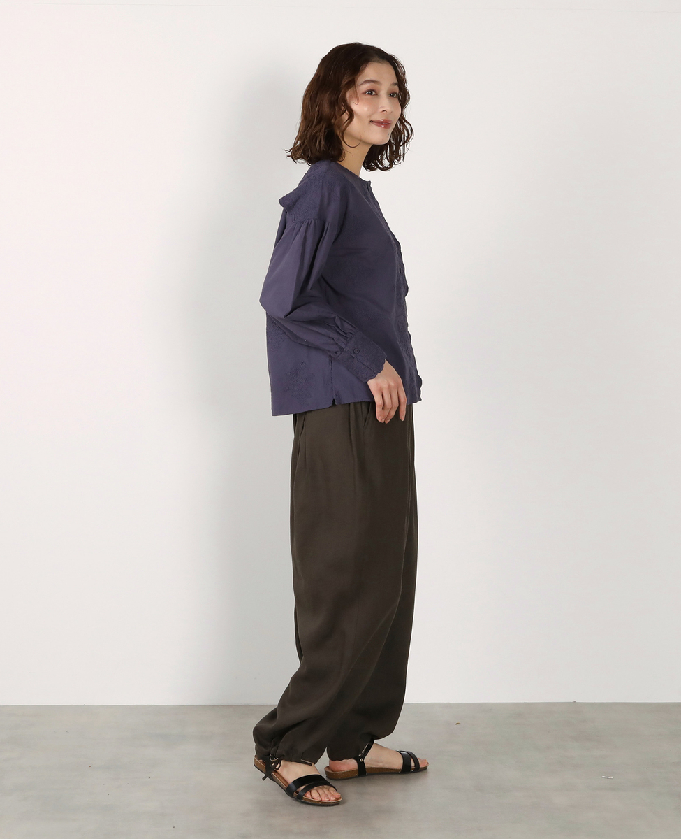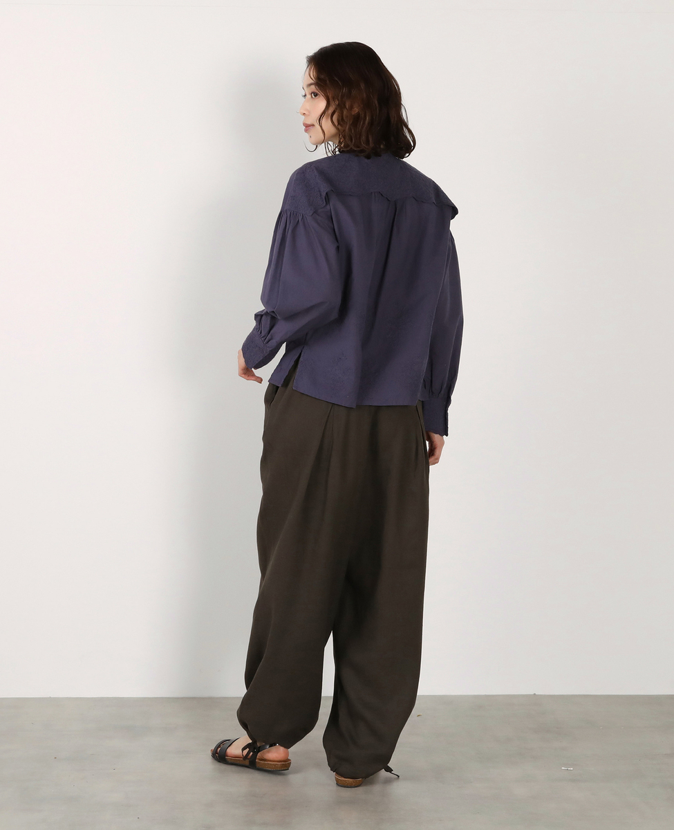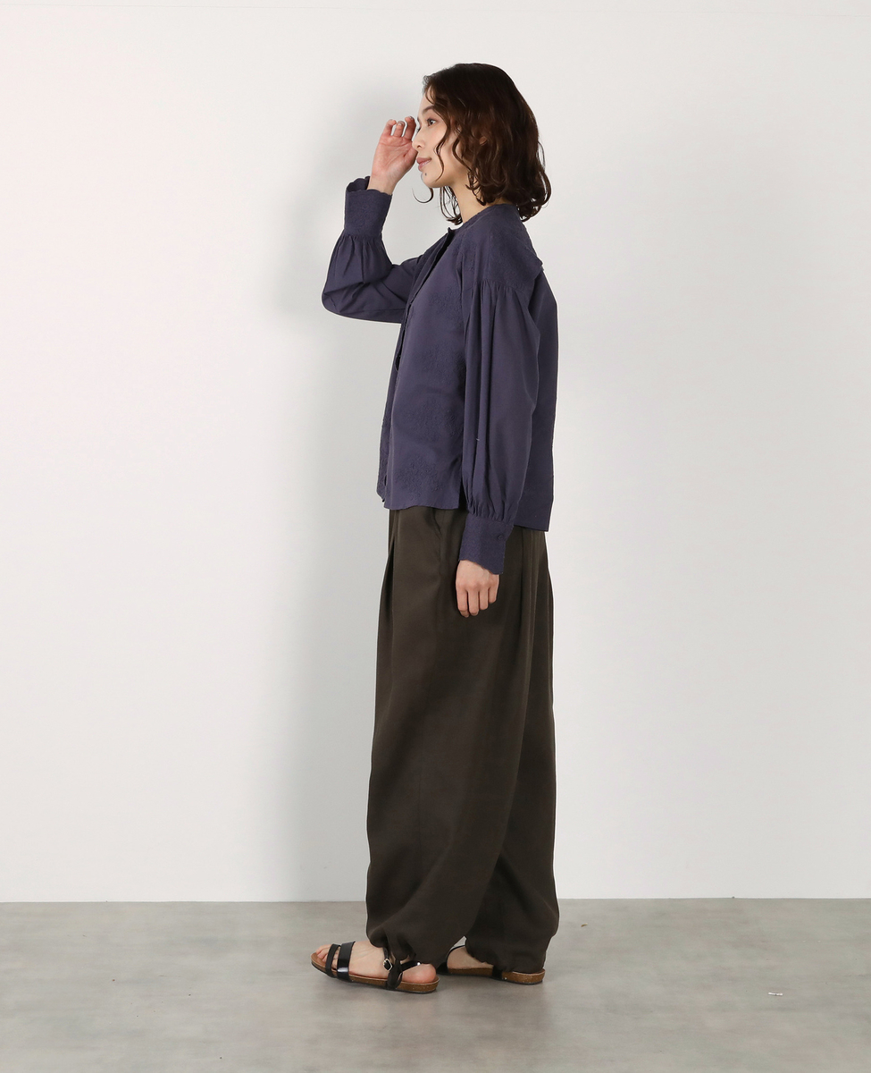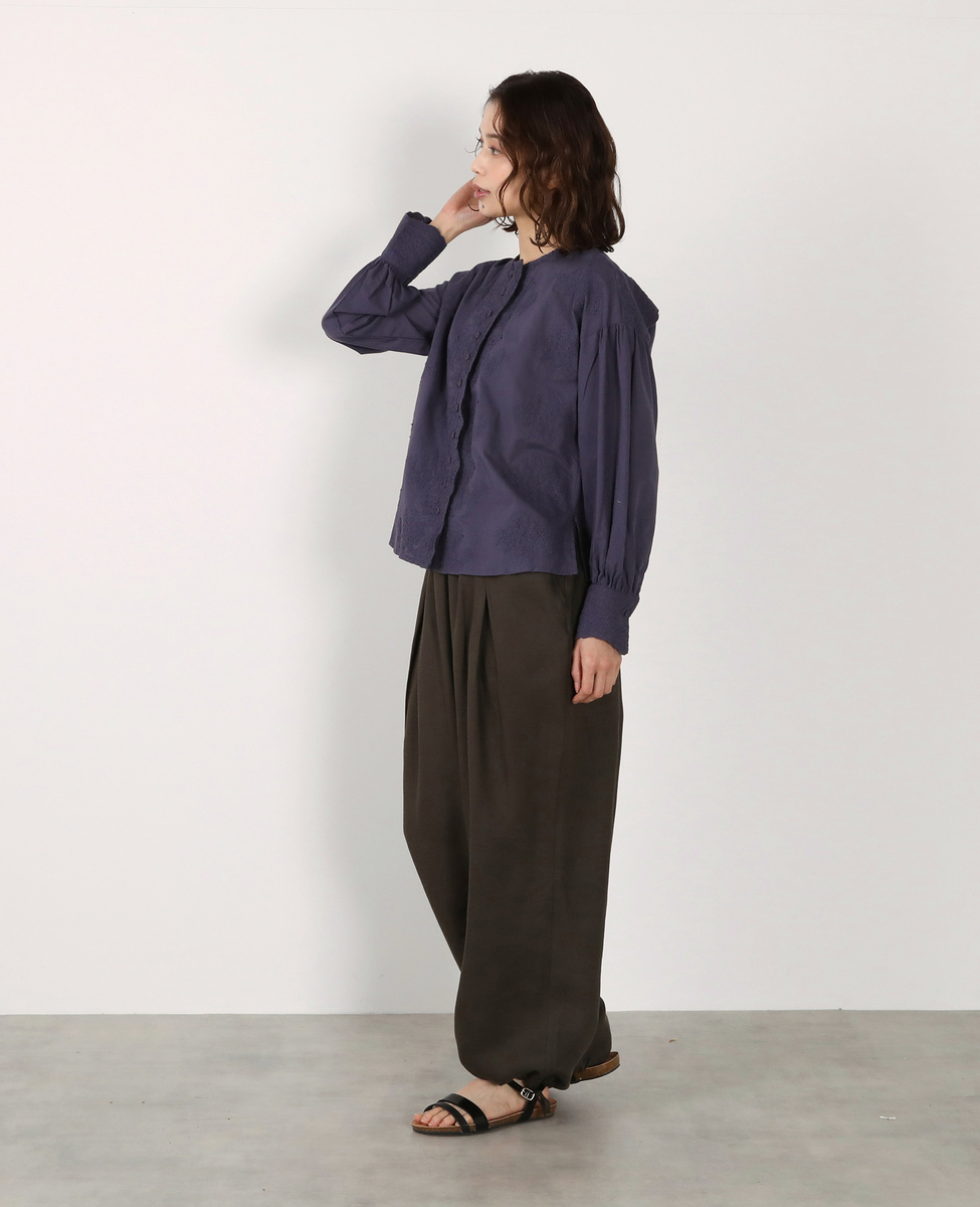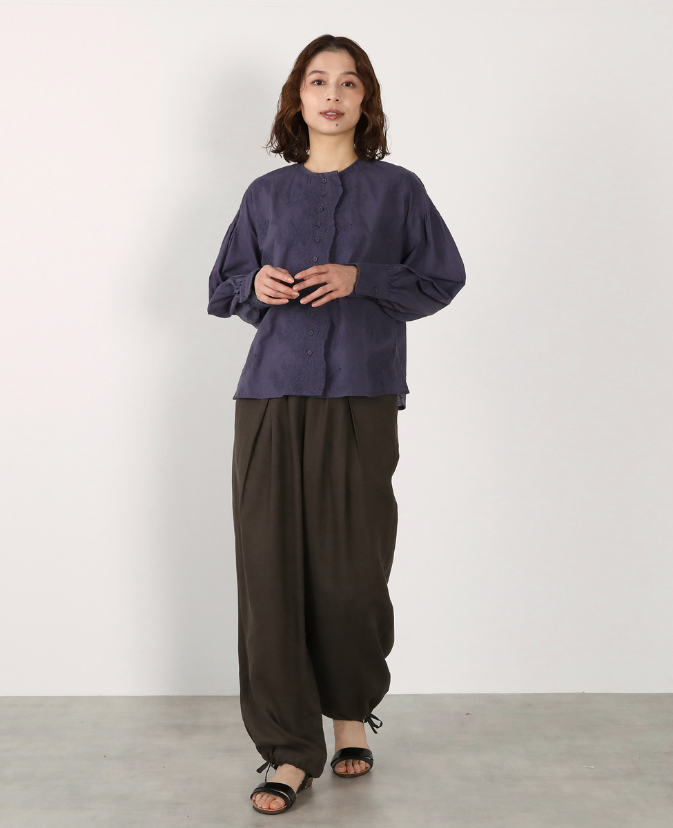フロントとカフス部分にスカラップ刺しゅうを施した華やかな印象のブラウス。